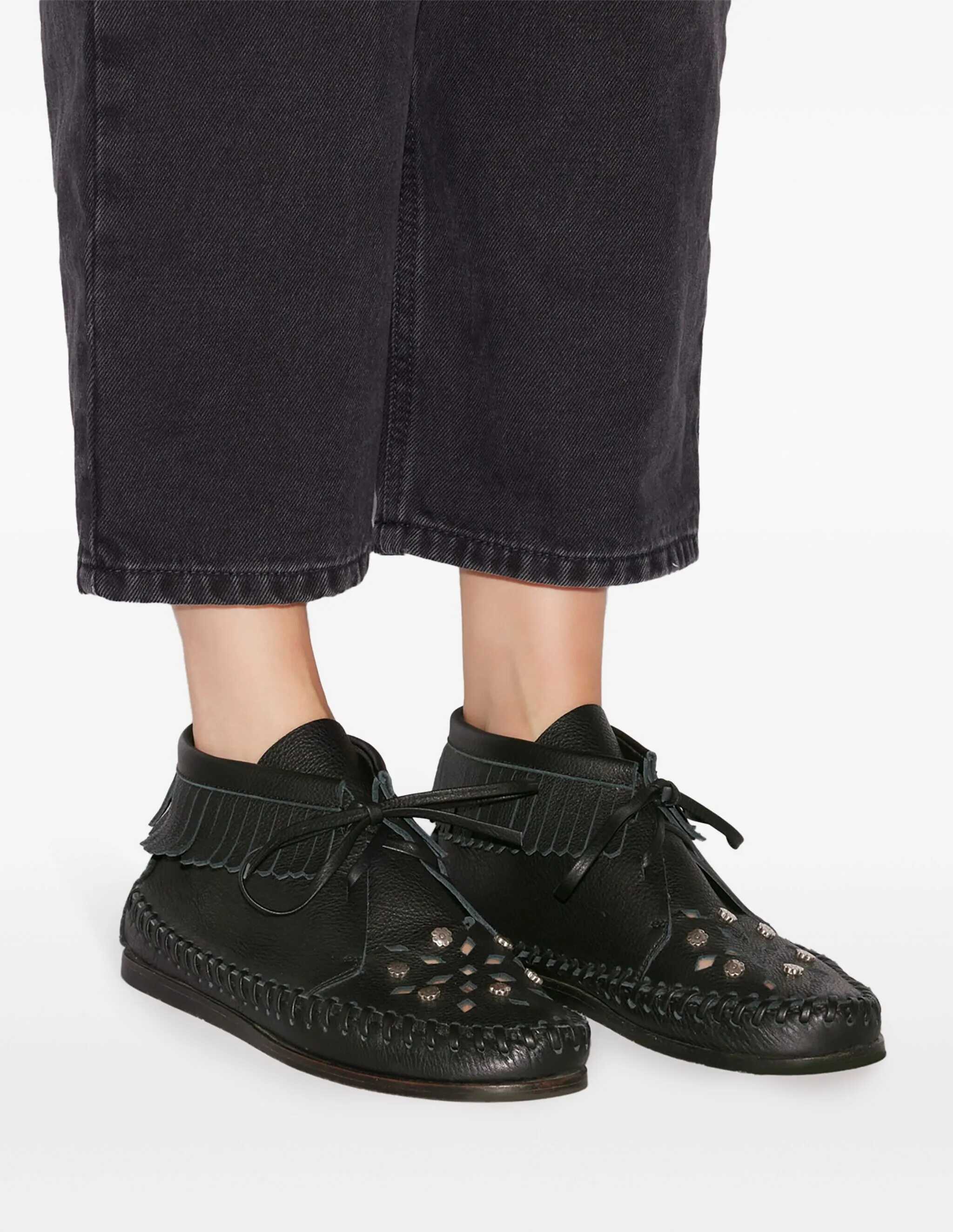 Isabel Marant's leather Felsa Lace-Up shoes are a perfect blend of elegance and boldness. The lace-up front closure ensures an adjustable fit, while fringing appliqués on the ankle lap add a touch of movement. The studs on the front panel lend an extra touch of character and modernity, while the festoon-stitched hem gives a refined detail. The flat sole provides comfort, while the branded insole ensures authenticity and prestige. A unique design that combines practicality and attitude.