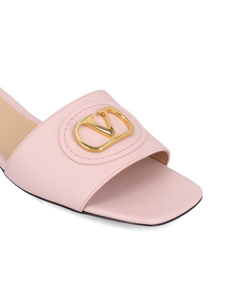 Valentino Garavani's slide sandal, made of fine calfskin leather, is embellished with the VLogo Signature badge with antiqued brass finish. - Upper: 100% calfskin - Color: pink - Lining: 100% leather - Sole: 100% leather - Signature VLogo decoration with antiqued brass finish - Heel height: 20 mm - Open toe slip-on design - Made in Italy - Box included - Item number: 6W2S0LT0DSHW34