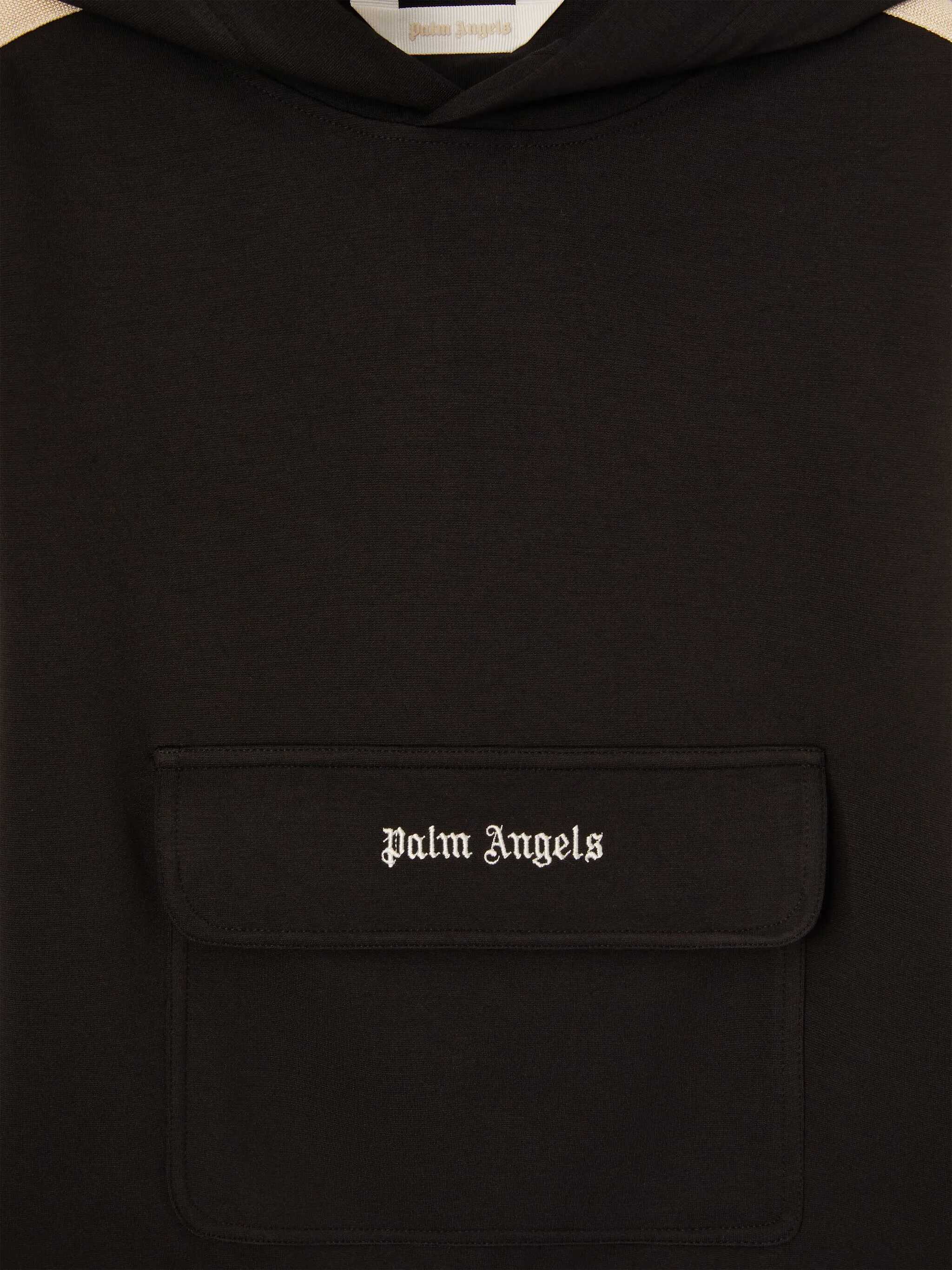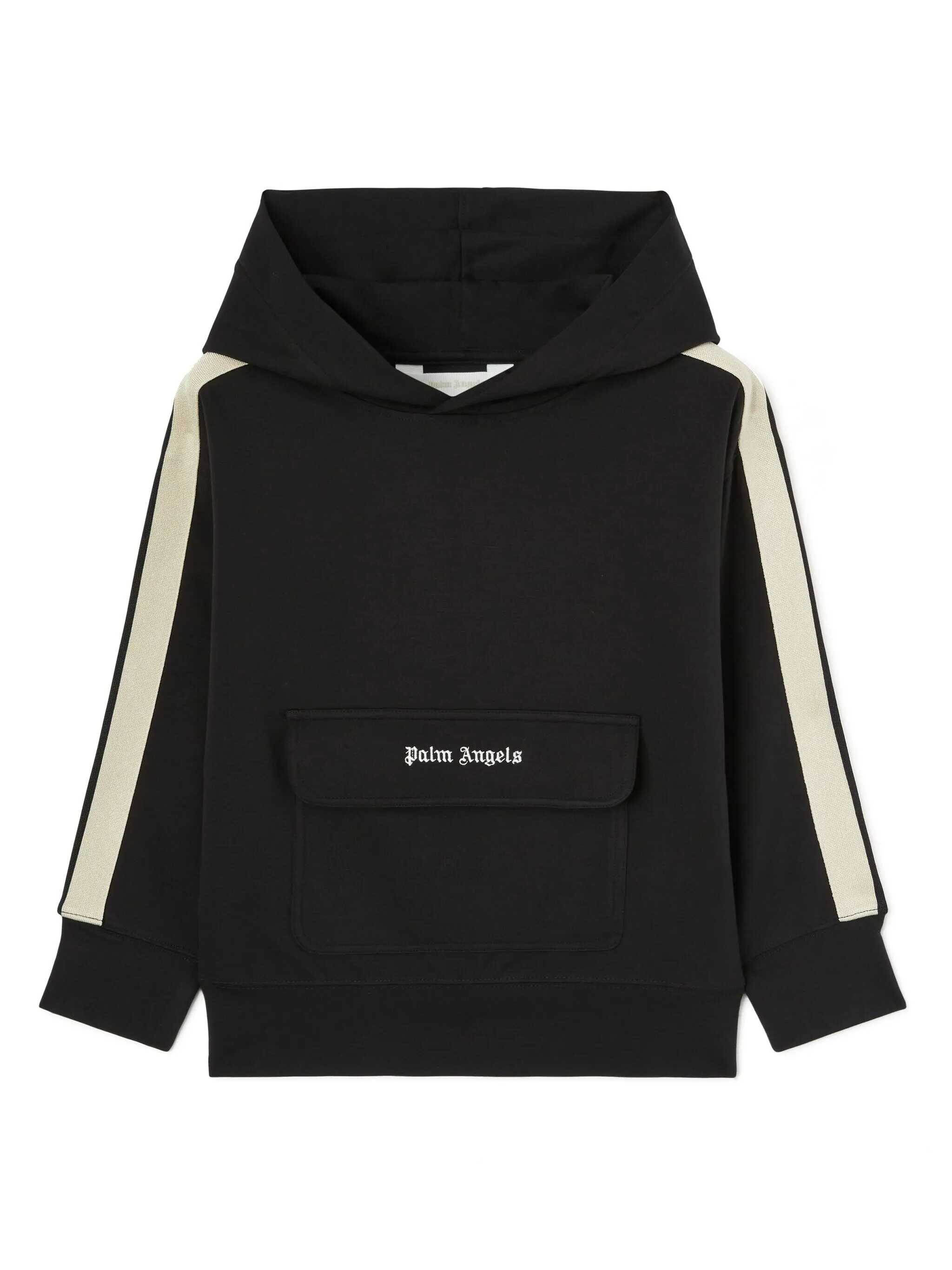 Black hooded sweatshirt for children, signed Palm Angels. Made of 70% viscose, 22% polyamide and 8% elastane, with polyester details and embroidery for a captivating and modern style.