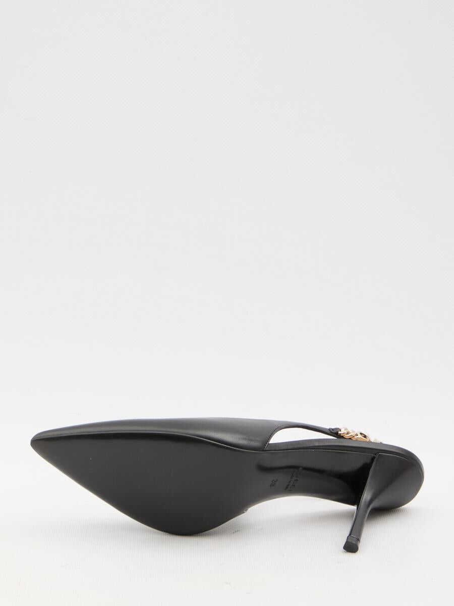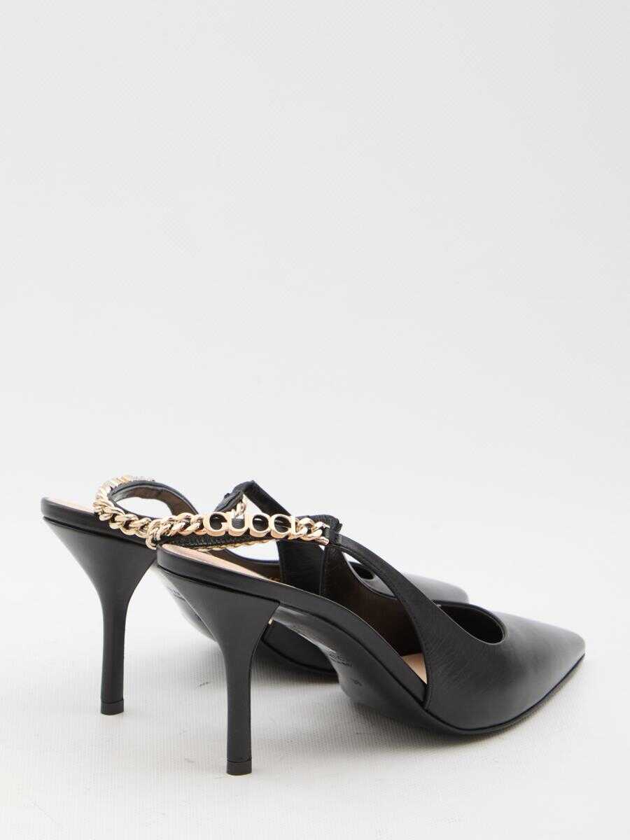 Gucci Signoria pointed toe pumps in black leather. They feature an elastic slingback closure with gold-toned Gucci chain and stiletto heel. Dust bag included. Any leather imperfections are not to be considered manufacturing defects, but a peculiarity of the material.