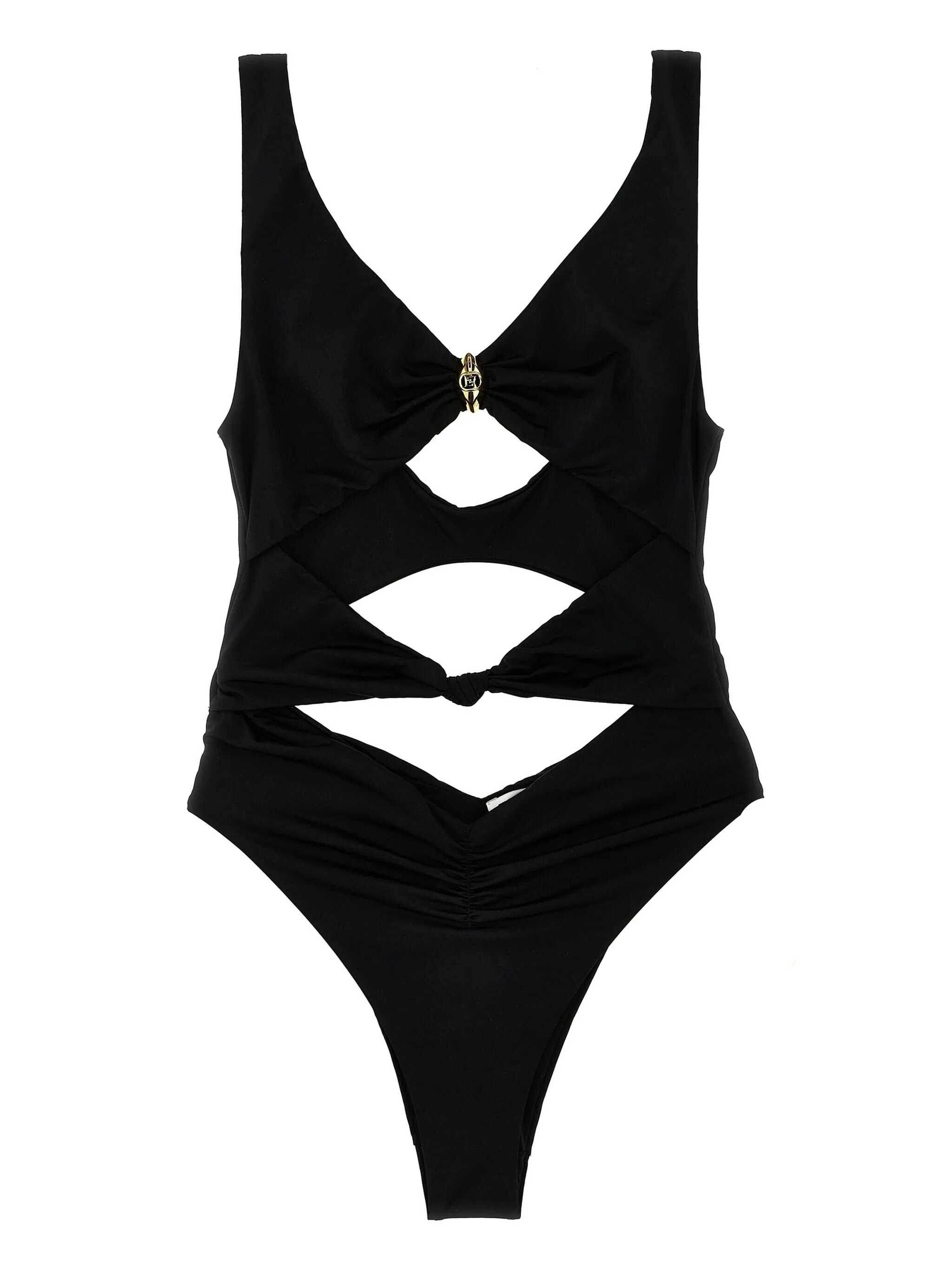 One-piece swimsuit in shiny Lycra with metal details and knot at the waist, trikini model