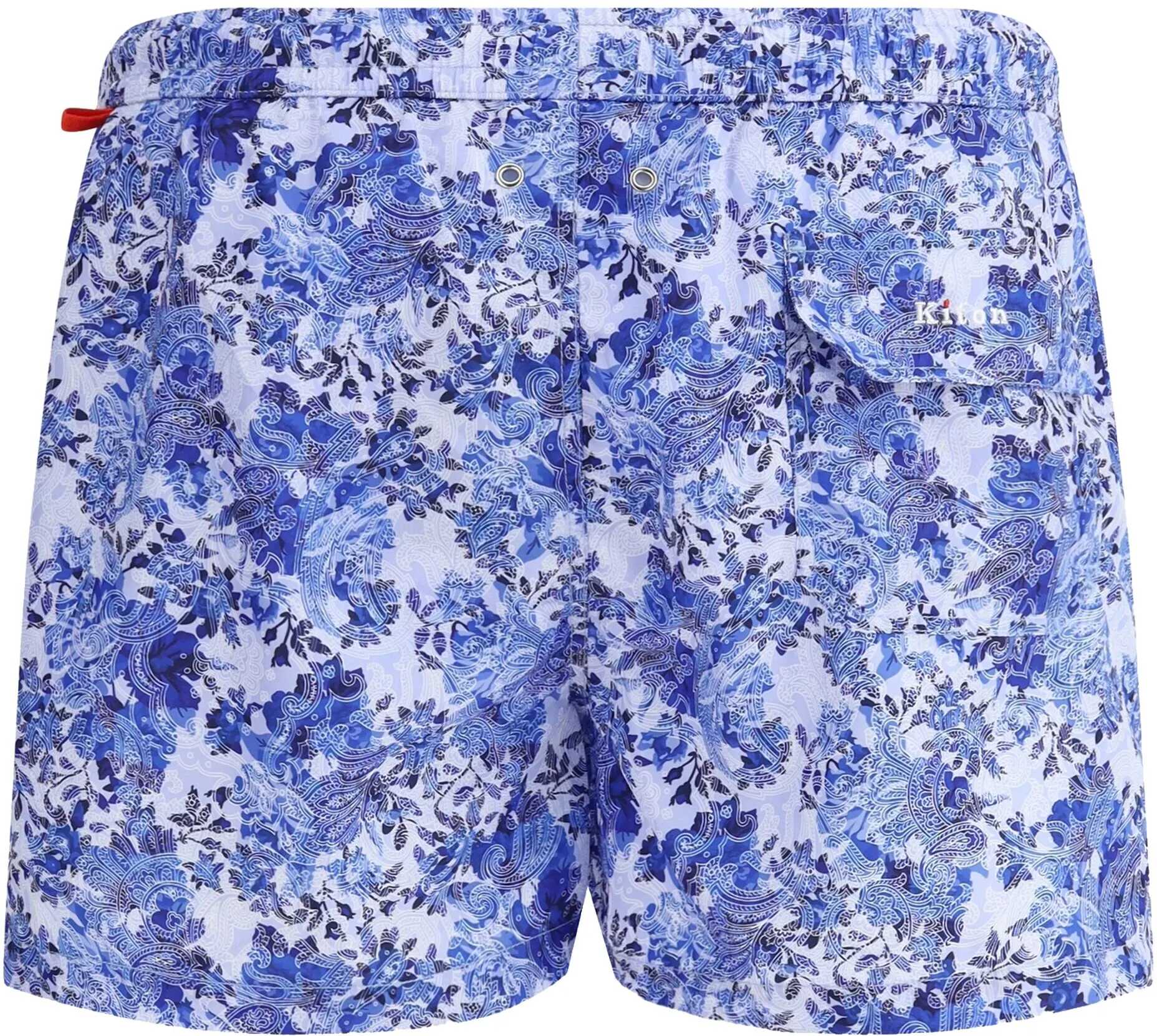 Kiton's Swimshorts is a sophisticated and functional garment featuring the perfect combination of style and practicality. The adjustable elastic waistband with drawstring offers a comfortable and customizable fit, while the side welt pockets are ideal for storing small items. The flap patch welt pocket on the back, embellished with the brand's iconic embroidered monogram, adds a distinctive detail. The flap patch pocket on the front lends an additional functional design accent. The contrasting all-over repeated paisley pattern gives the suit an elegant and dynamic look, combining a classic pattern with a modern, luxurious touch.