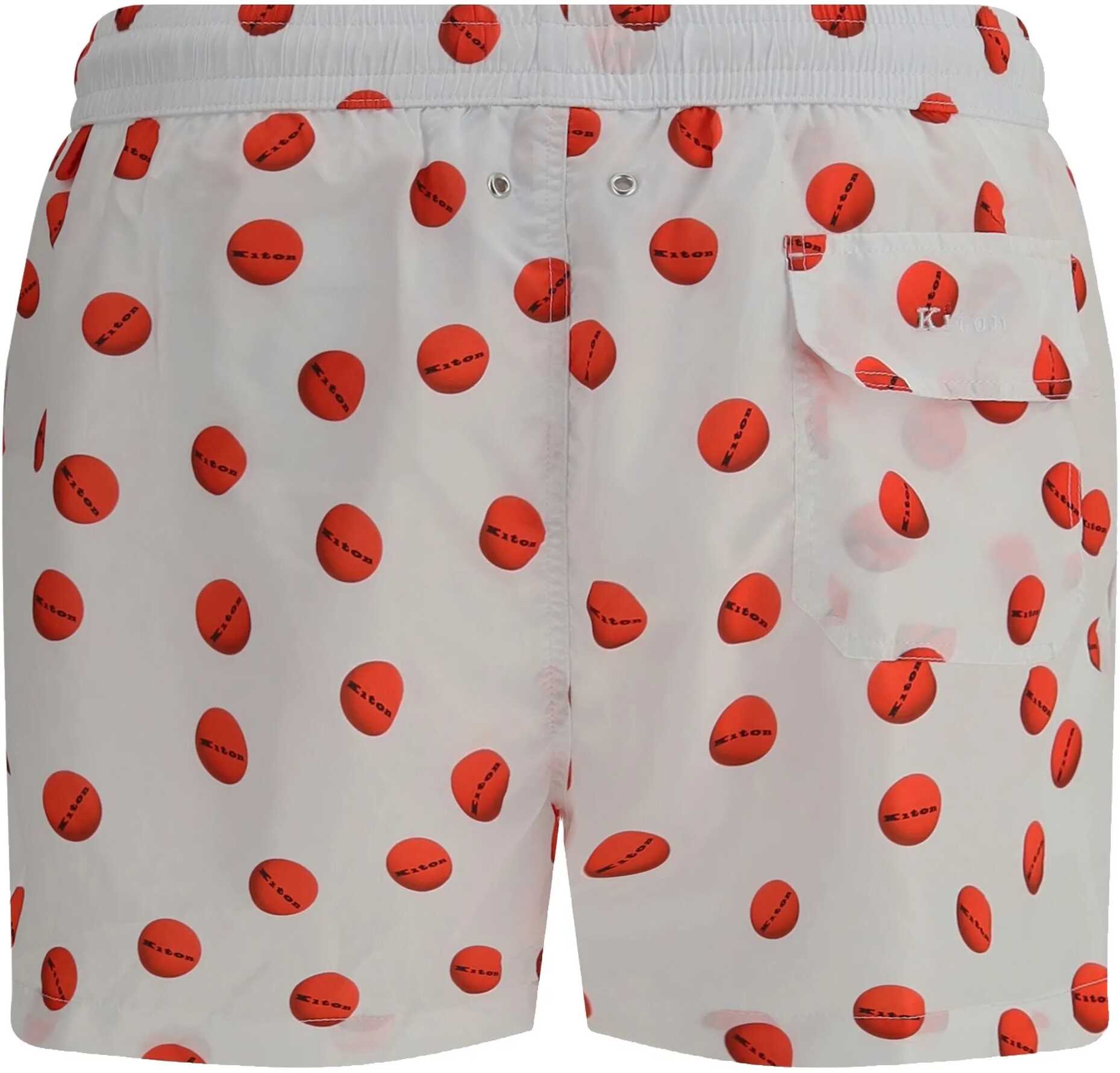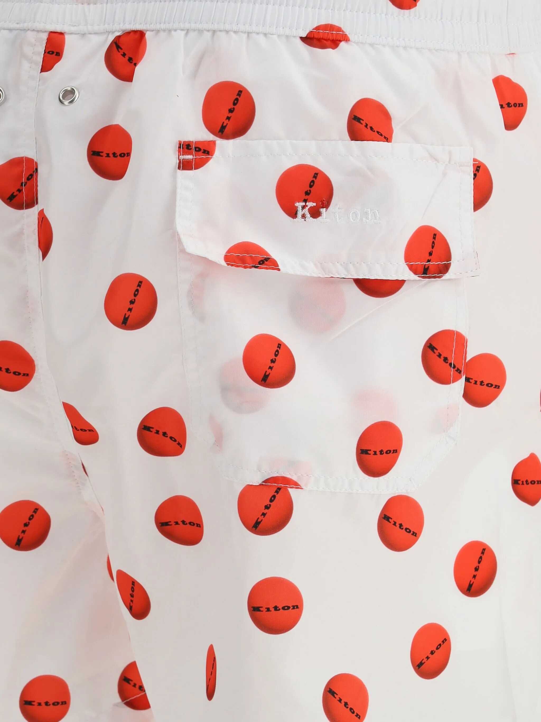 Kiton's Swimshorts is an elegant and refined garment that combines style and practicality. The adjustable elastic waistband with drawstring allows for a customized fit, while side welt pockets provide space for small items. The back flap patch pocket and front flap pocket add a touch of functionality and design while maintaining a clean, sophisticated aesthetic. Contrasting all-over logoed spheres make the suit distinctive and instantly recognizable, lending a touch of luxury to even a casual garment.