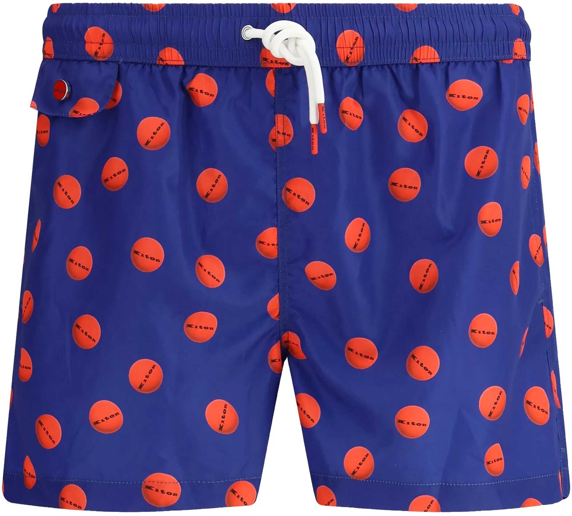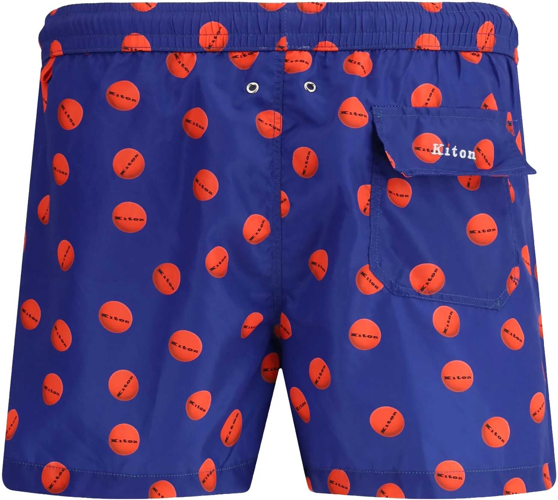 Kiton's Swimshorts is an elegant and refined garment that combines style and practicality. The adjustable elastic waistband with drawstring allows for a customized fit, while side welt pockets provide space for small items. The back flap patch pocket and front flap pocket add a touch of functionality and design while maintaining a clean, sophisticated aesthetic. Contrasting all-over logoed spheres make the suit distinctive and instantly recognizable, lending a touch of luxury to even a casual garment.