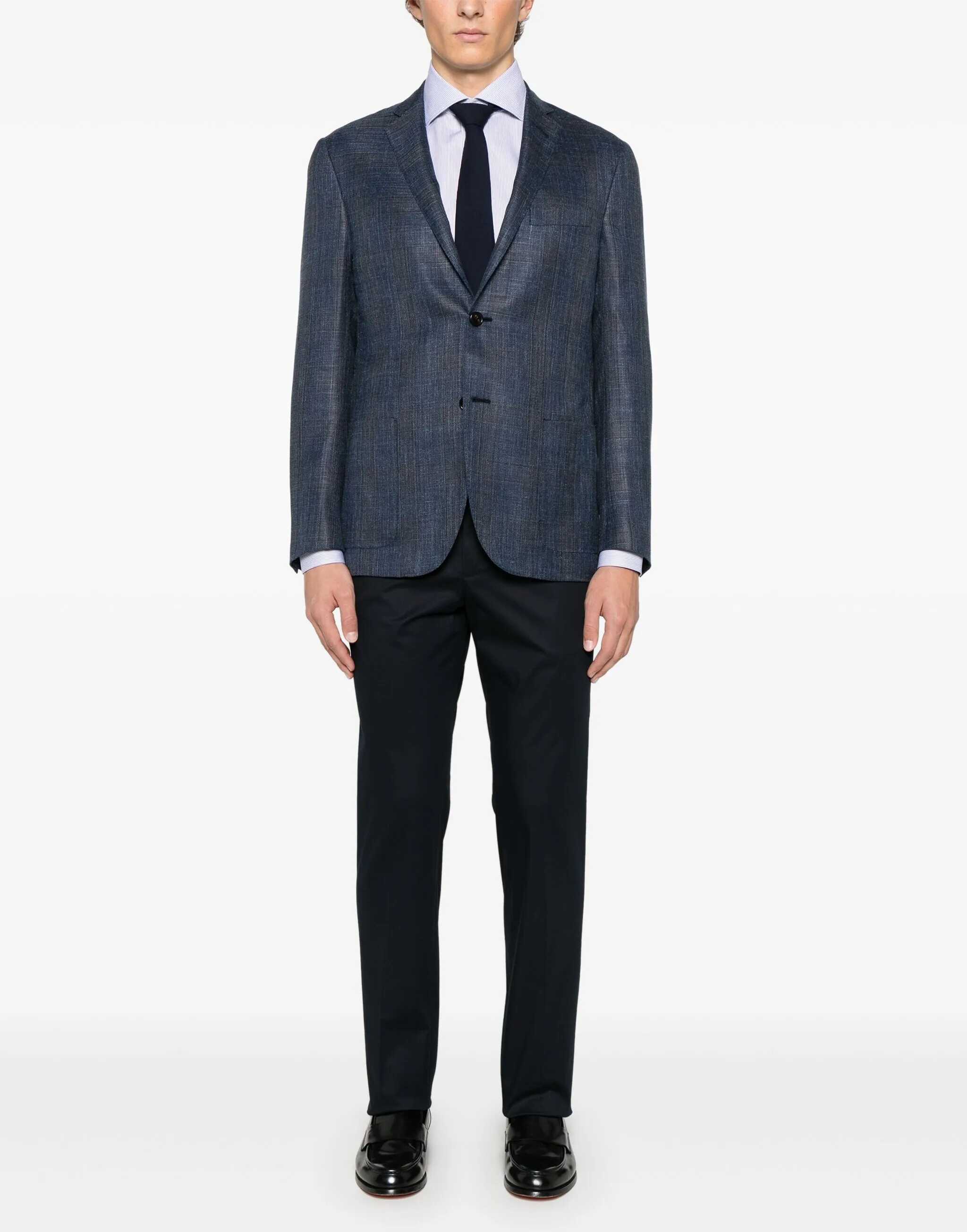 Zegna's Luxury Suit Pants are a sophisticated garment with a cigarette cut that gives an elegant and defined silhouette. The front closure is made with a zipper, button and hook, while the waistband has belt loops, offering a customizable fit. The two side welt pockets and two back welt pockets add practicality without compromising refined aesthetics. These pants are perfect for those seeking a formal, luxurious look with a timeless design that expresses Zegna's signature craftsmanship and quality.