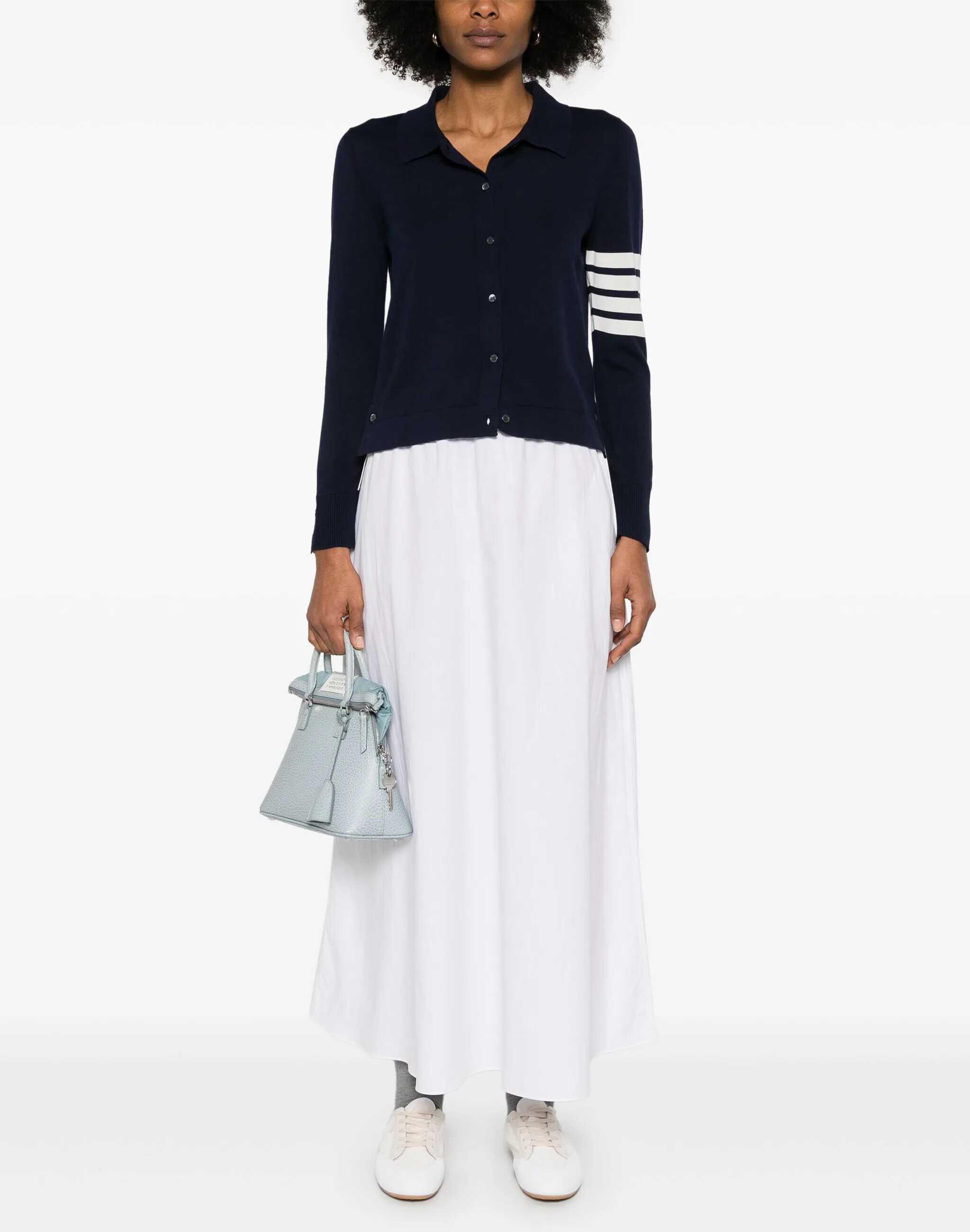 Thom Browne's cotton long-sleeved polo shirt is a stylish and versatile piece, perfect for adding a touch of style to casual and refined looks. The contrasting button front closure enhances its minimalist design, while the ribbed cuffs and hem give a snug, comfortable fit. The classic ribbed collar adds a classy detail. A distinctive touch are the brand's iconic contrasting bands on the arm, giving it an element of recognition and modernity.