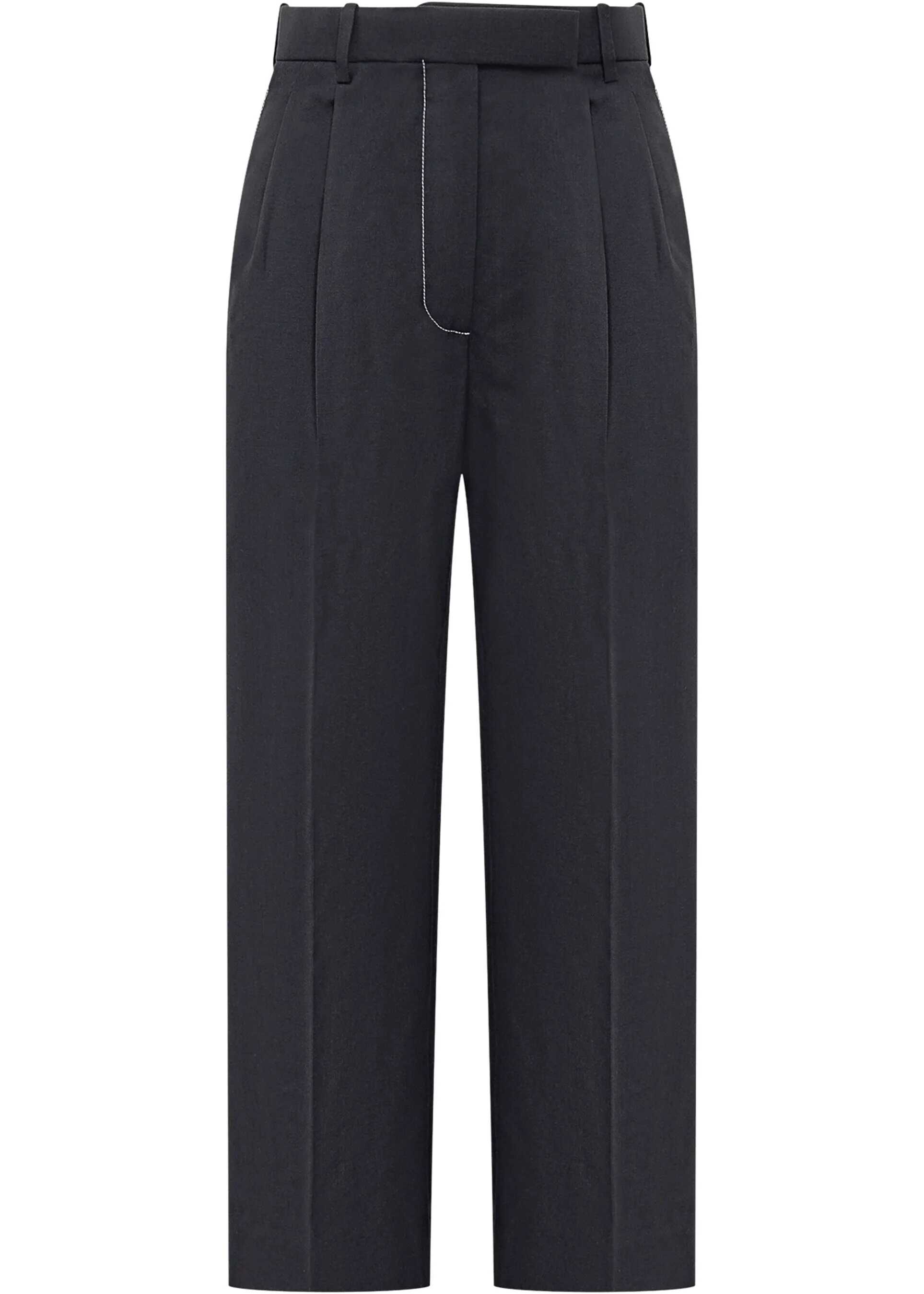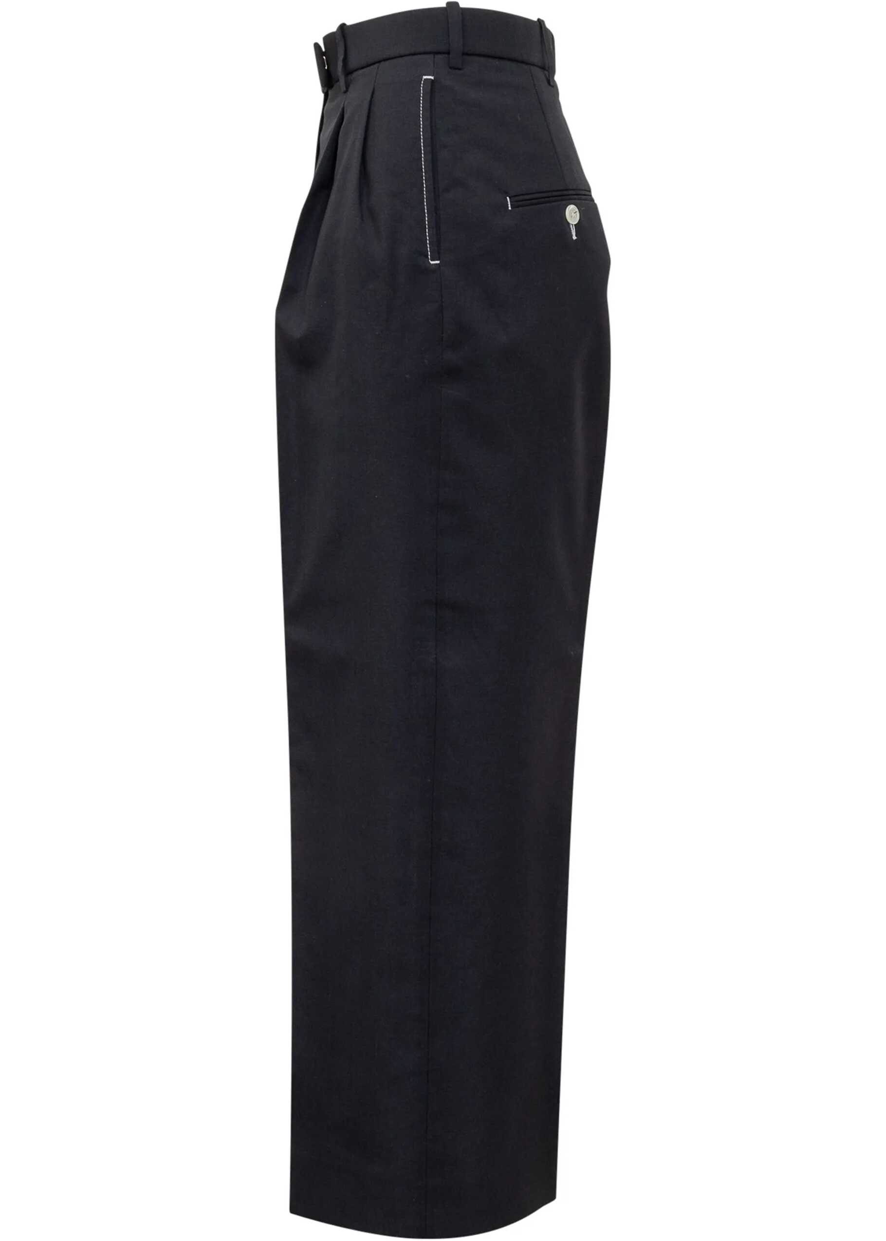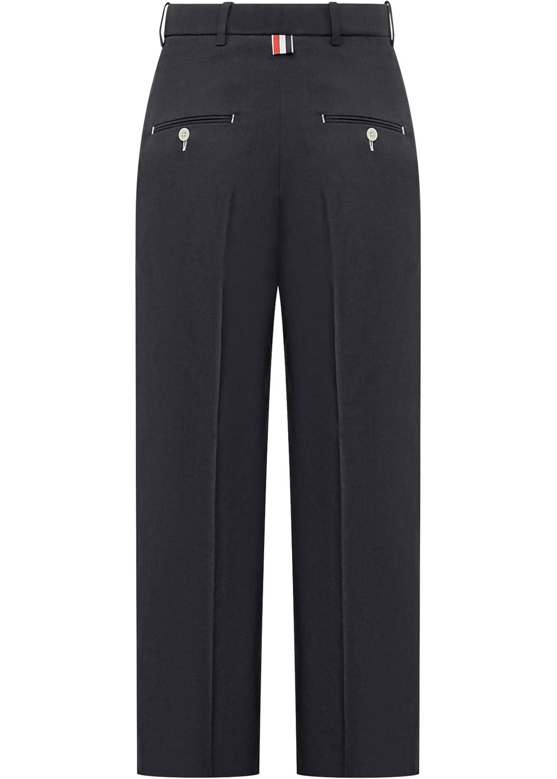 Thom Browne's Wool Pants are an example of modern tailoring, featuring a front zipper and hook-and-eye closure that ensures a perfect, clean fit. Two side welt pockets and two buttoned back welt pockets add functionality and an elegant touch. Contrasting white stitching is a distinctive detail that gives a sophisticated and dynamic visual effect, typical of Thom Browne's recognizable style.