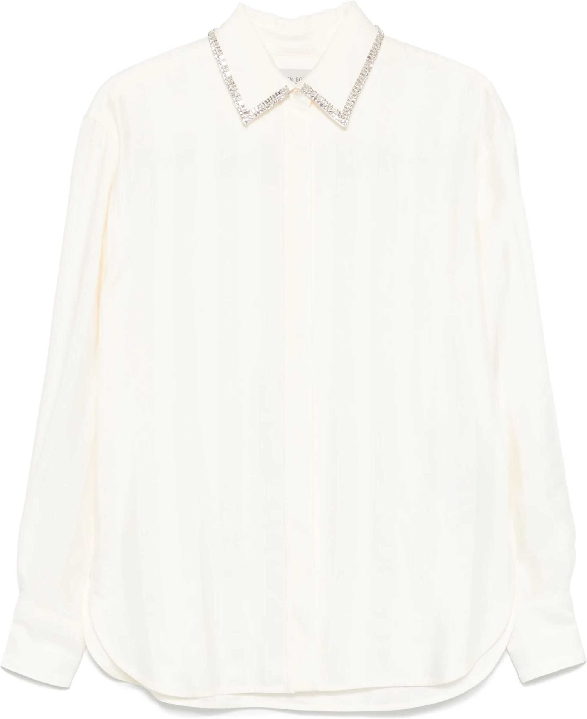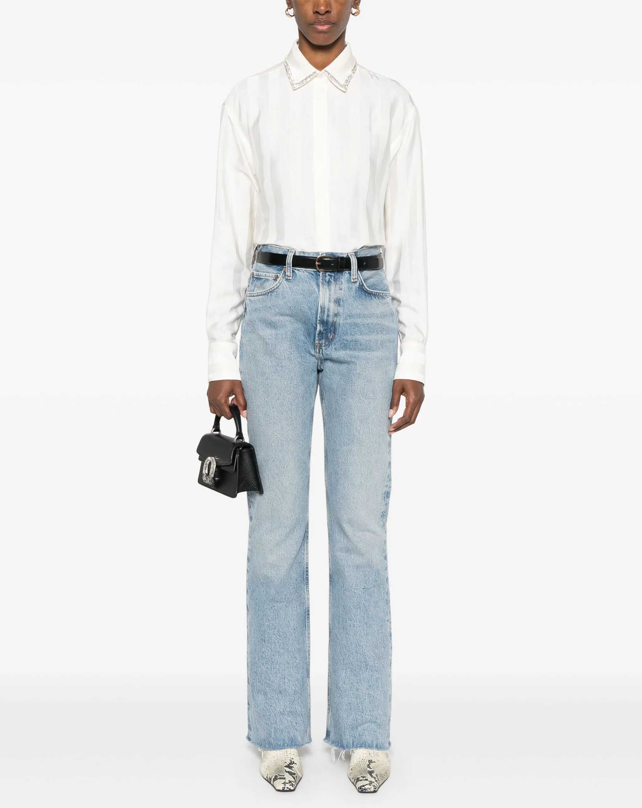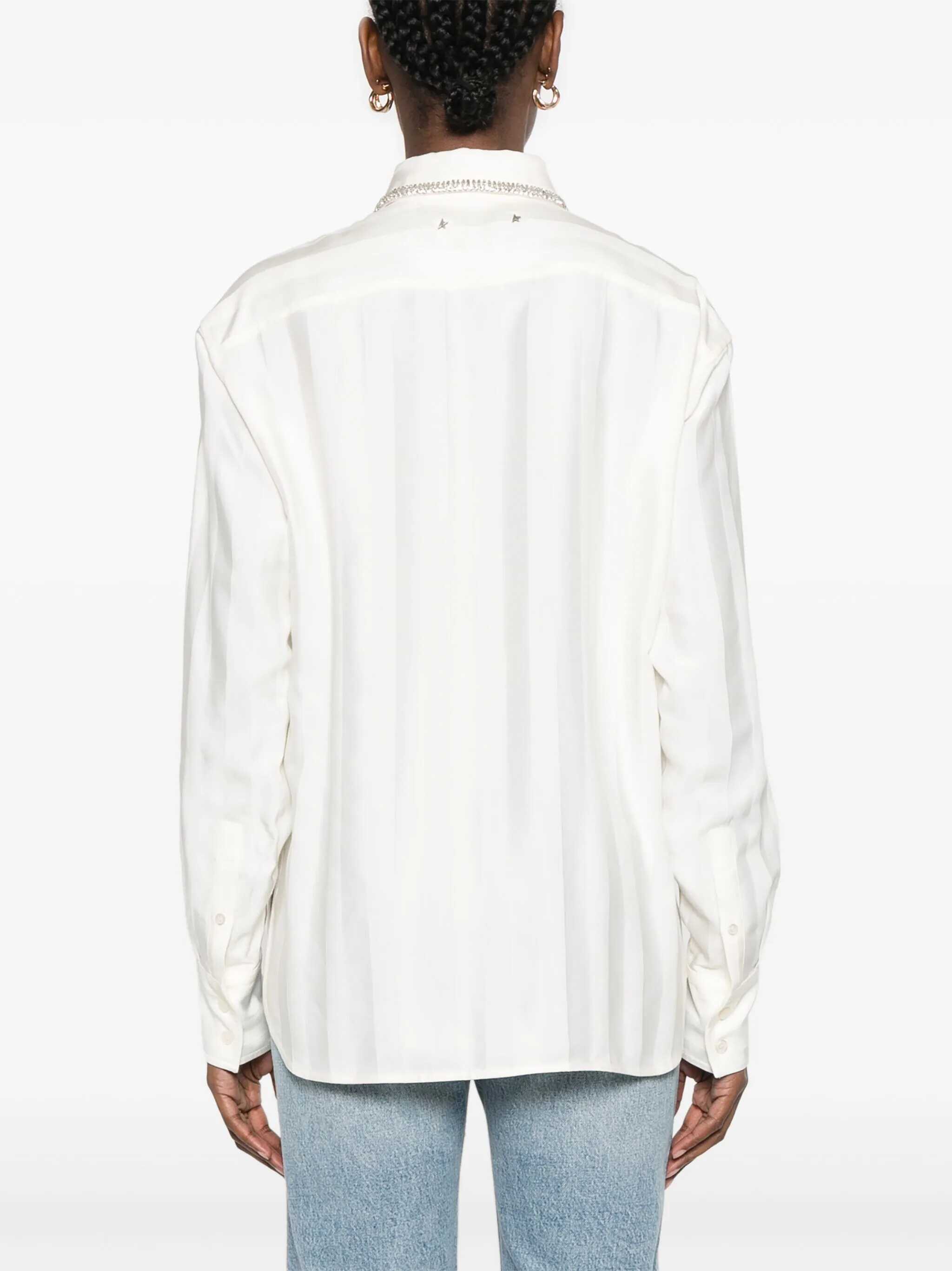 The Marysole Shirt by Golden Goose is an elegant and sophisticated garment featuring a front button closure that enhances its refined simplicity. The classic rhinestone collar adds a touch of light and glamour, while the striped pattern and satin design give the garment a luxurious and modern look. A versatile piece that combines classicism with distinctive details, perfect for a chic and contemporary look.