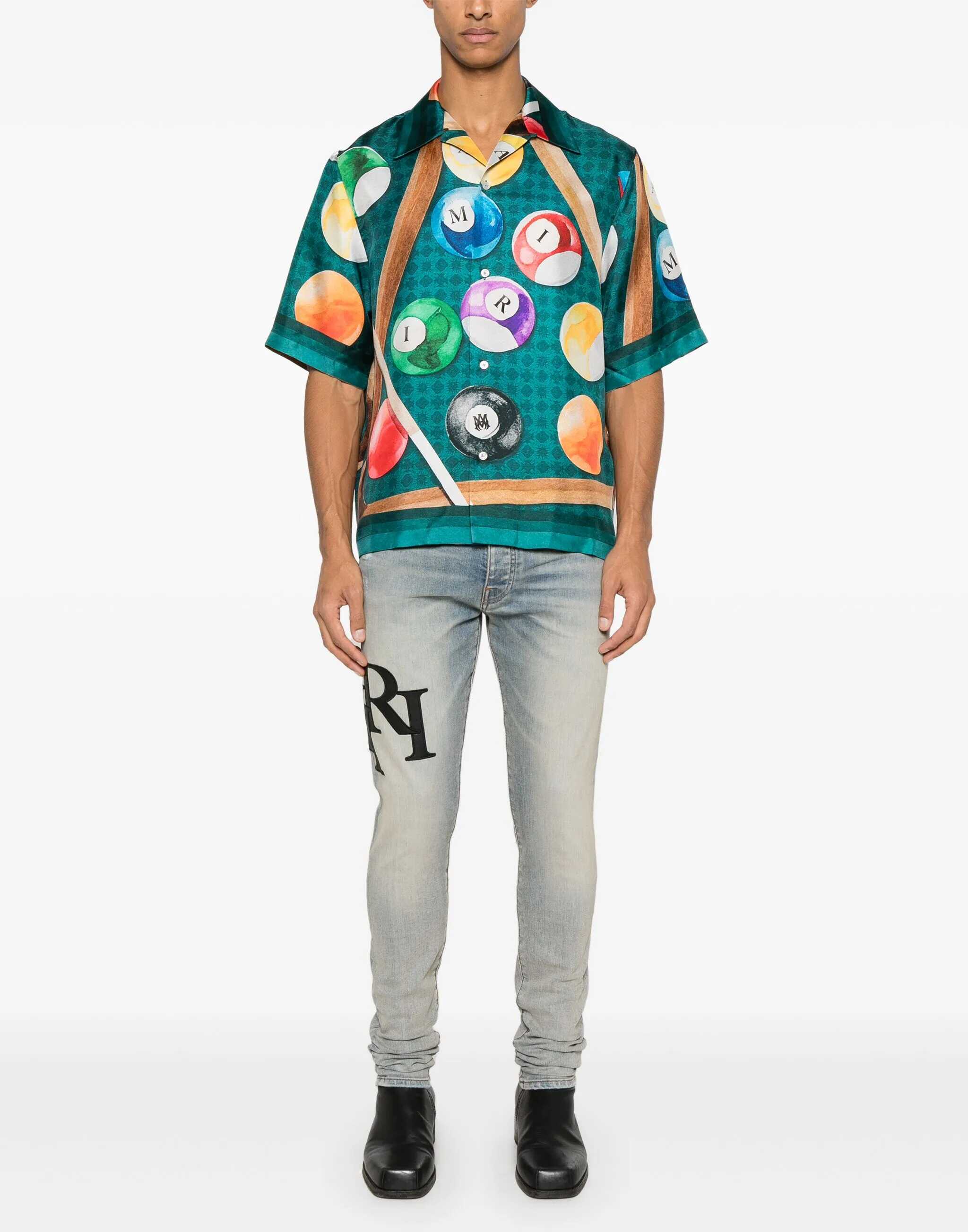 Short-sleeve silk shirt with a billiards and bowling print. It features a notched collar, button closure, and a striped hem in various shades of green.
