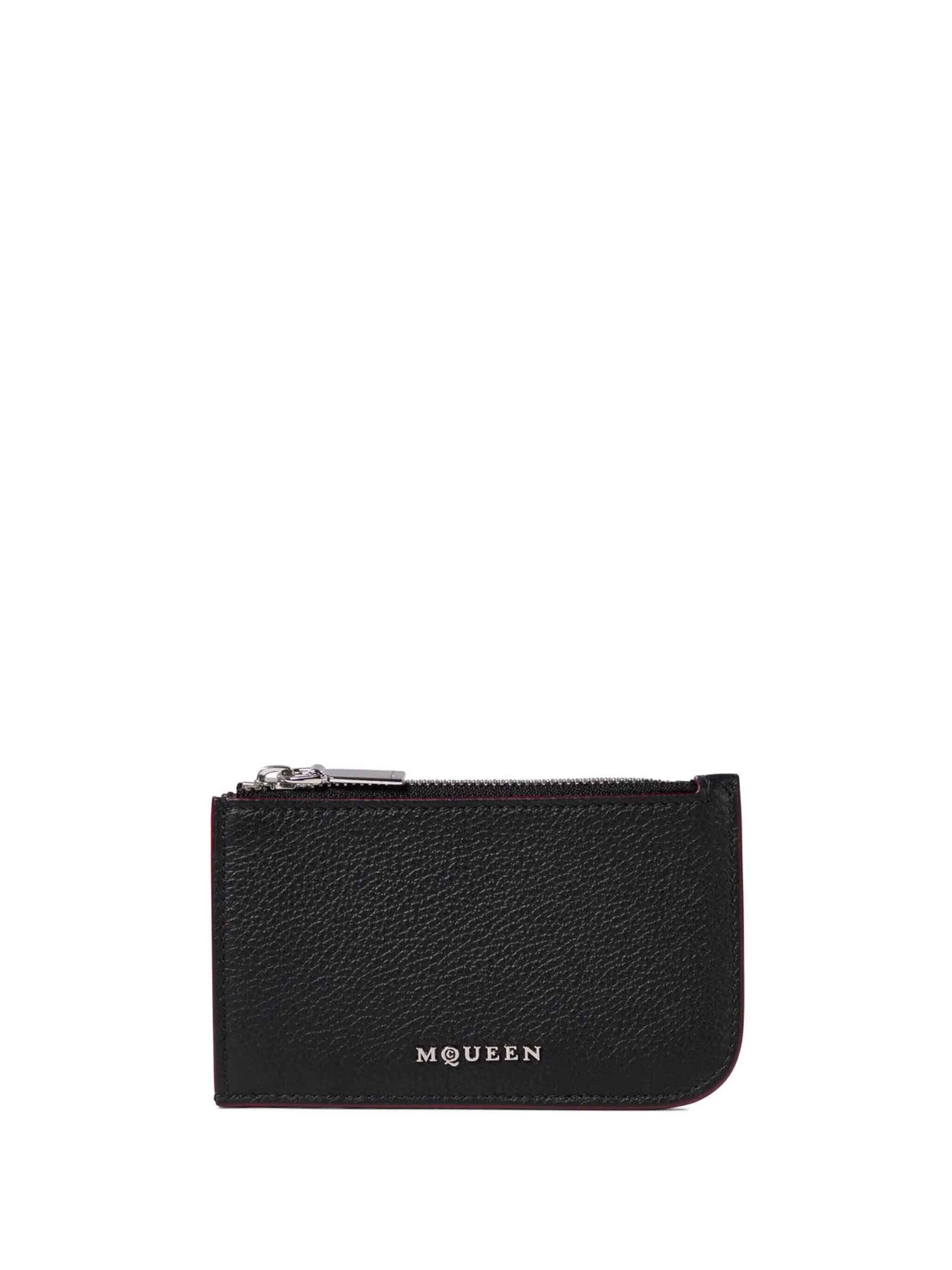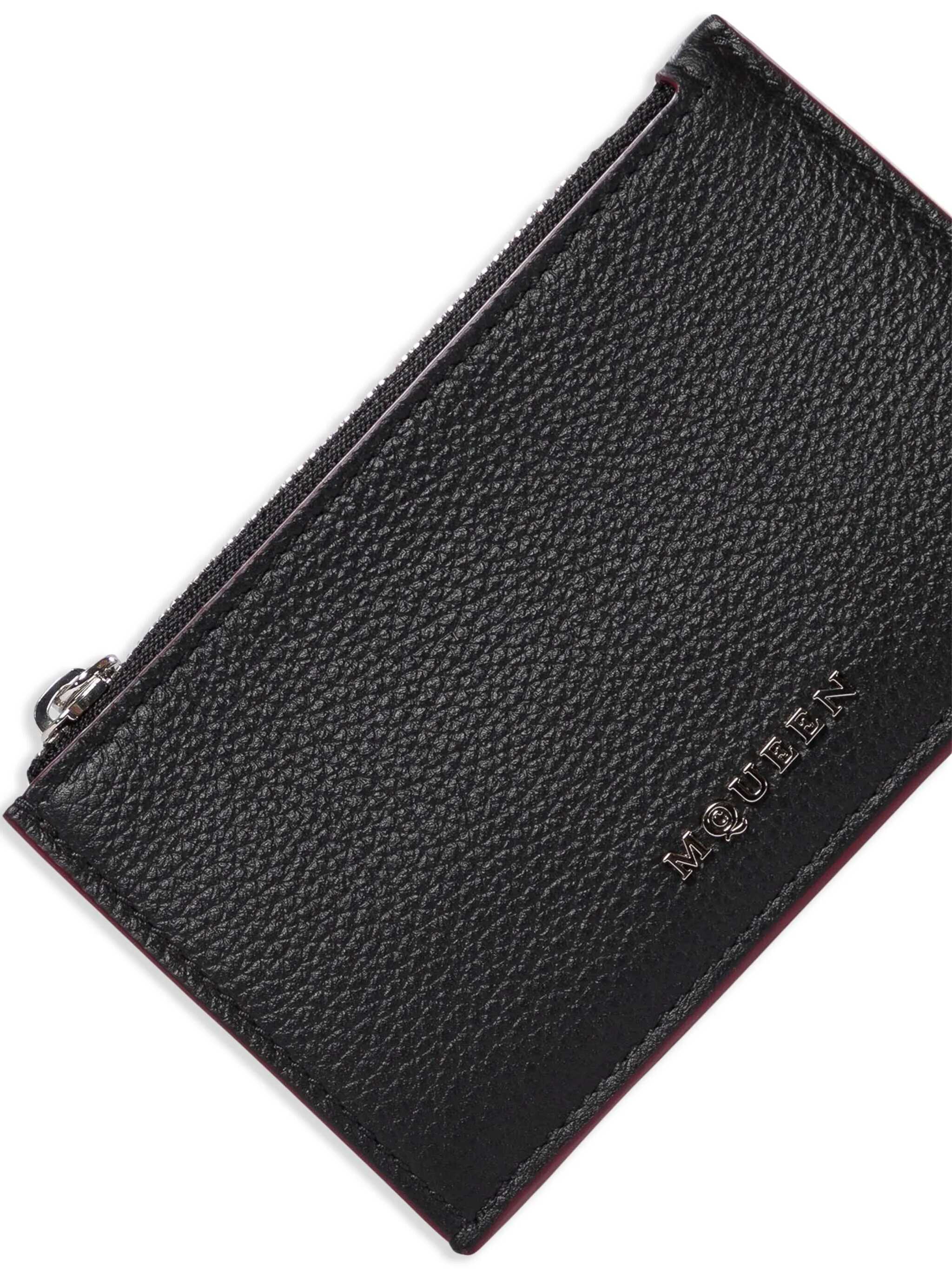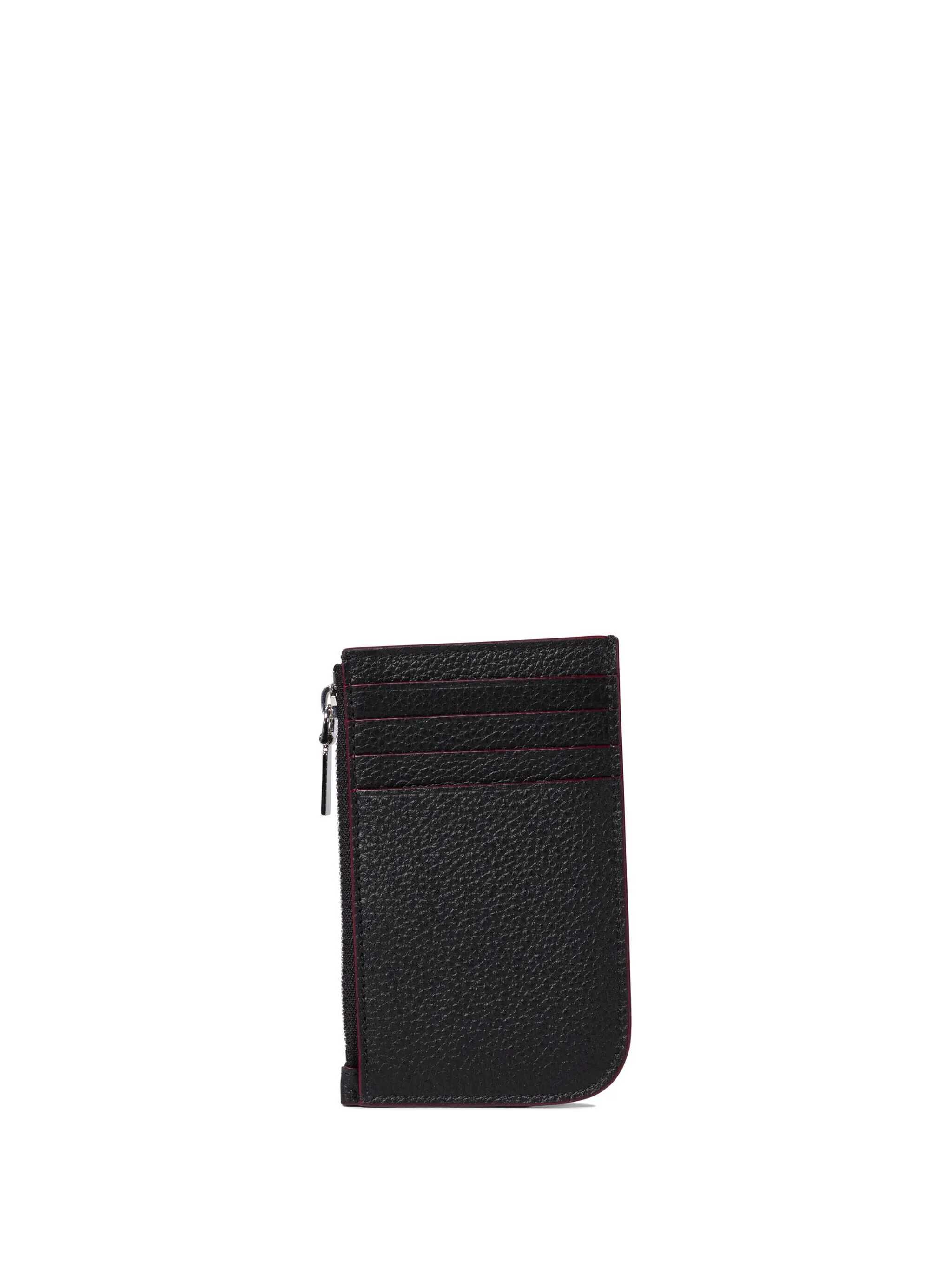Sling Wallet in black leather, Height 75 mm, Width 125 mm, Height 75 mm, Width 125 mm, zip closure, cards slots, metallic logo, textured leather, 100% leather, Made in Italy