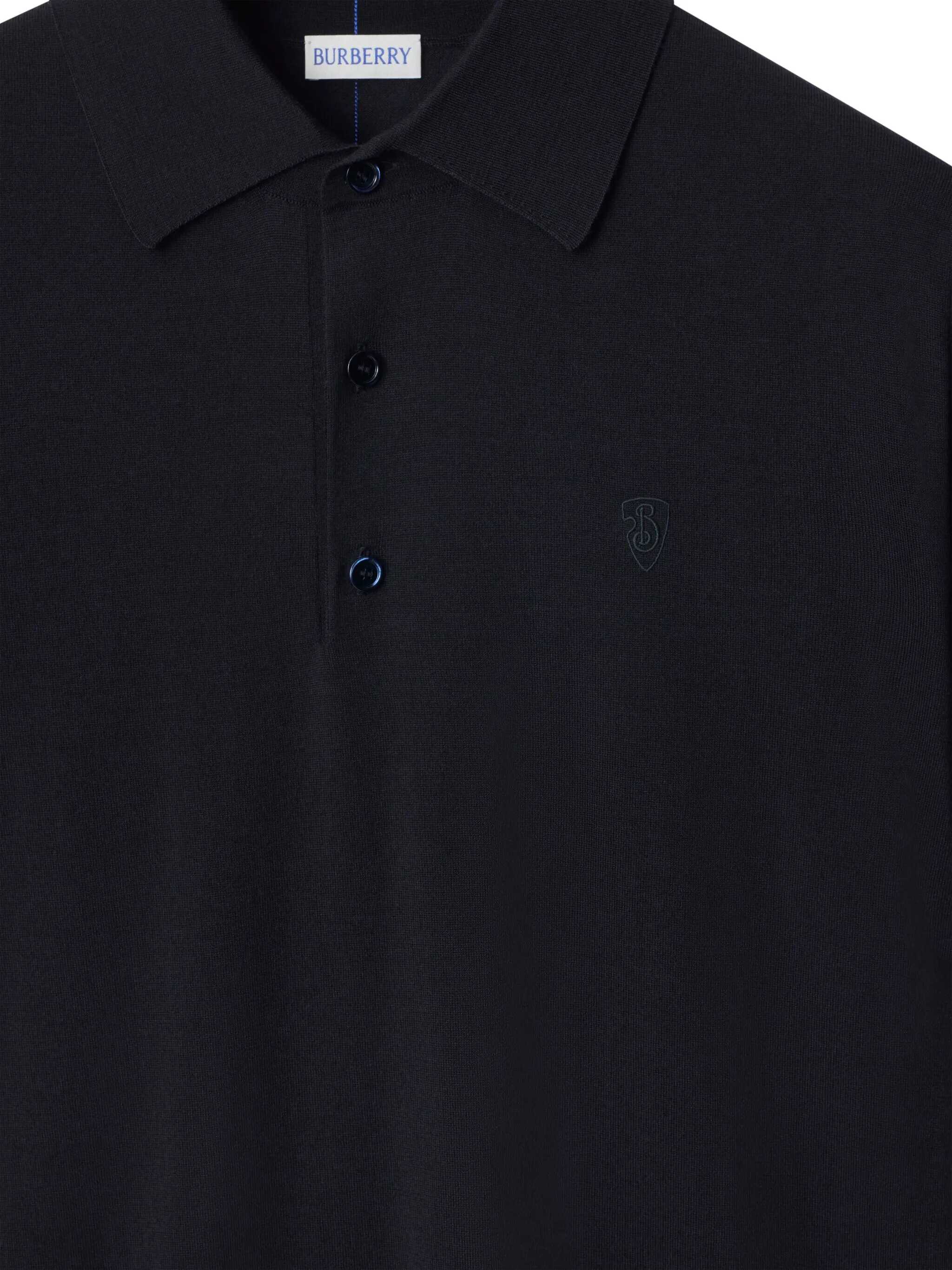 Wool polo shirt, front logo embroidery, collar and buttons, short sleeves, back detail with contrast embroidery and central split