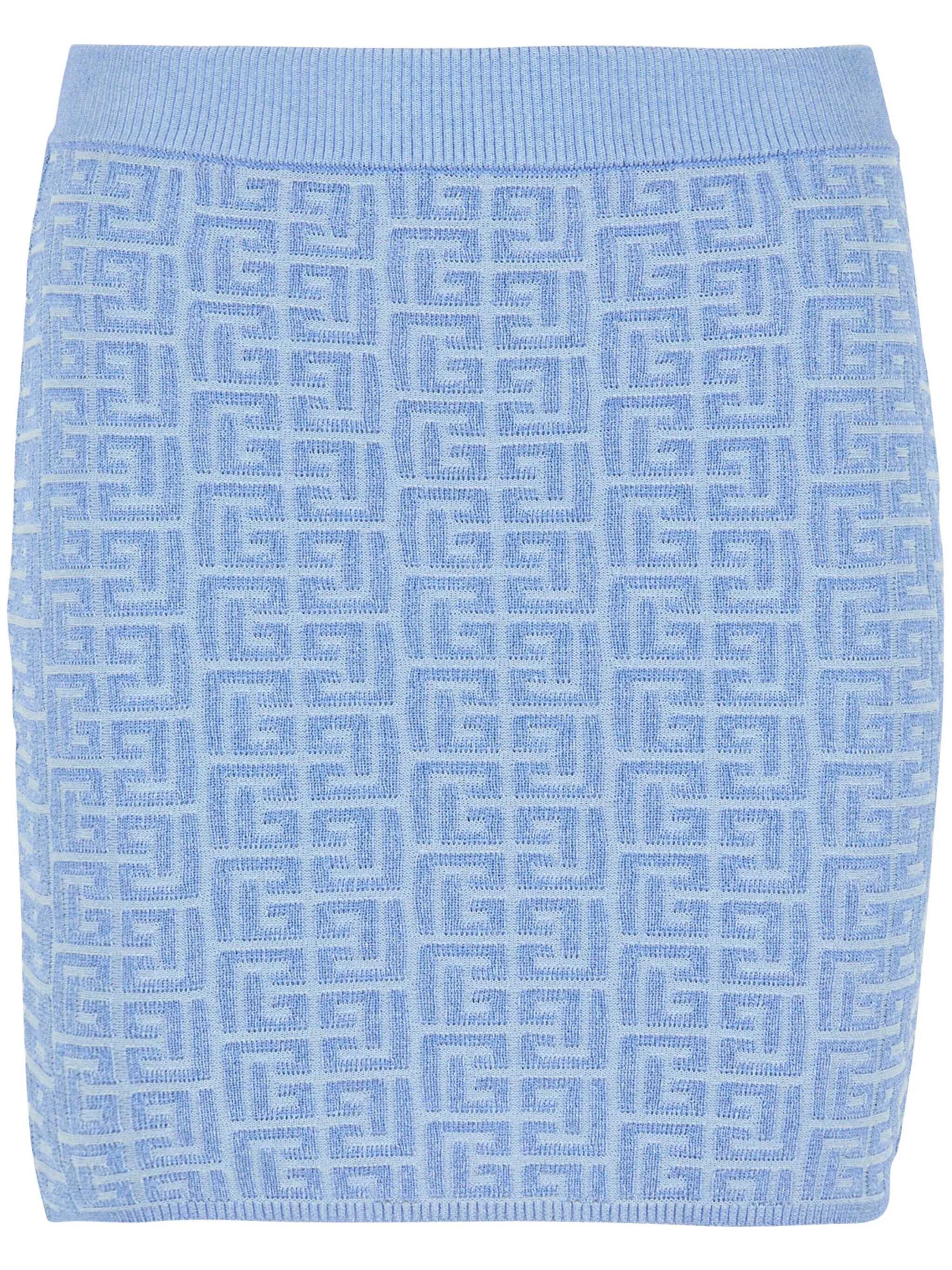 High-waisted mini skirt PB in shiny knit with labyrinth PB monogram pattern, elastic waistband with back zip closure