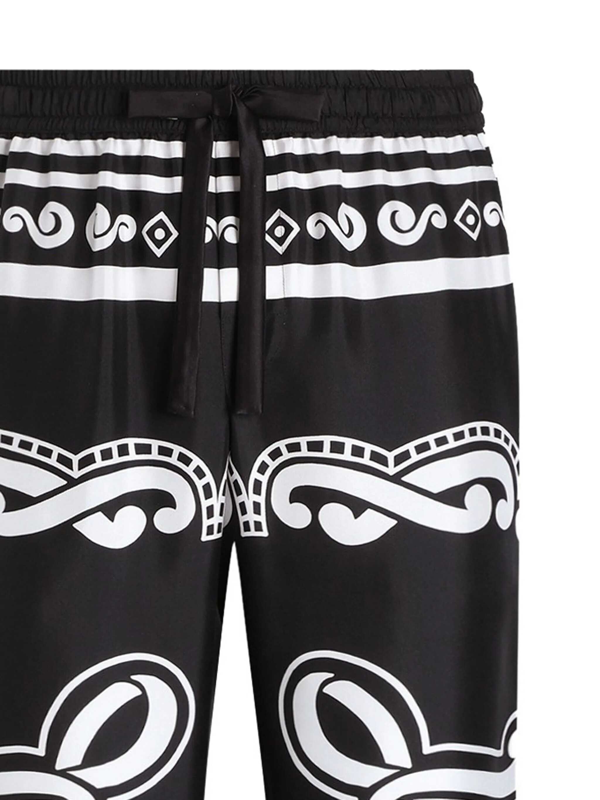 Bandana-print silk pajama pants, contrast piping details, adjustable drawstring elastic waistband, pockets.