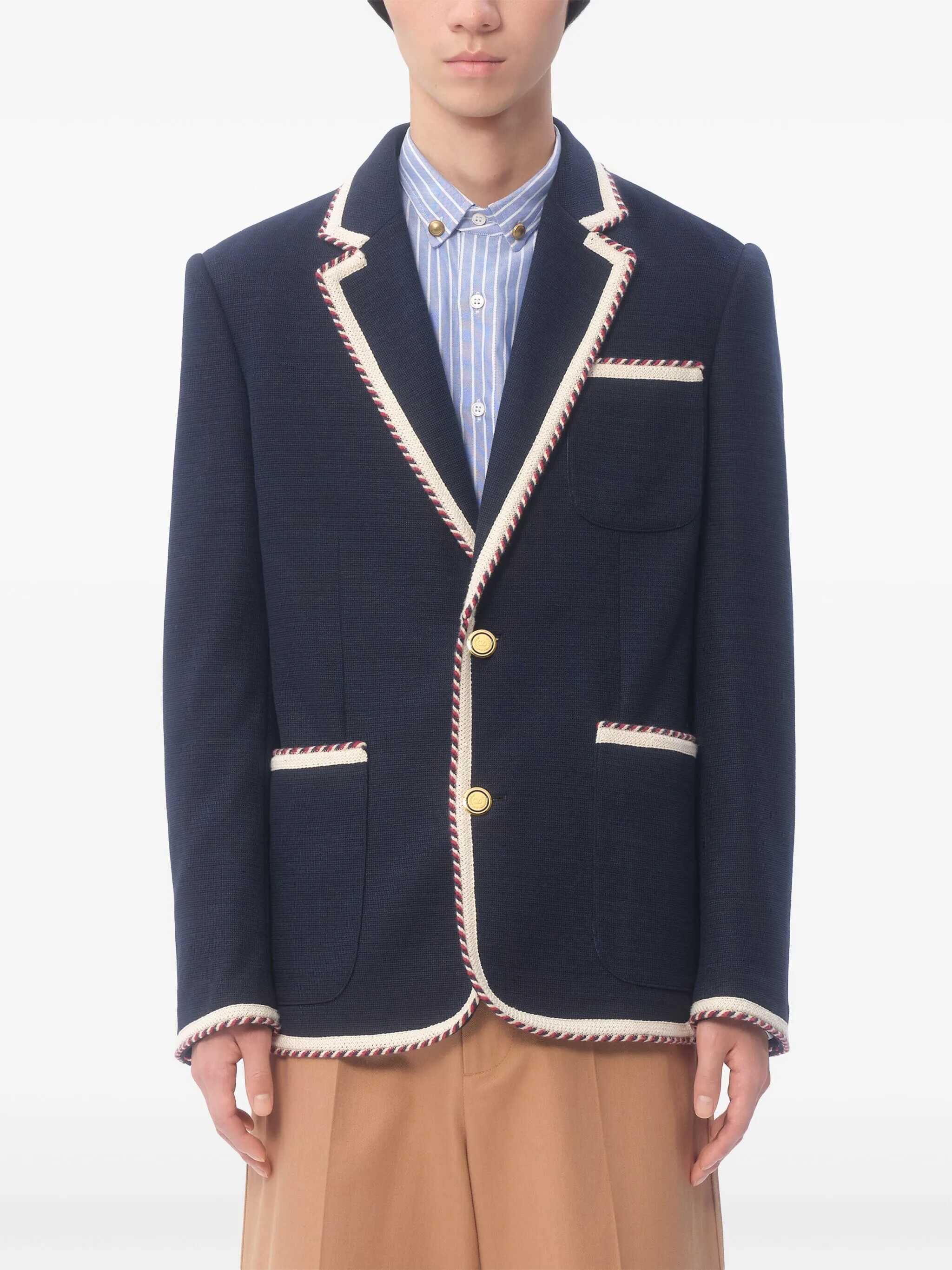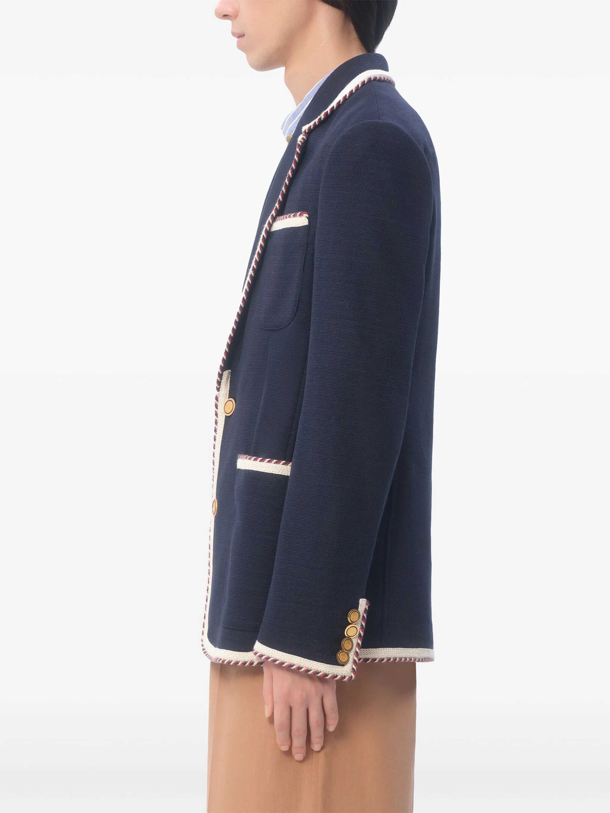 Single-breasted cotton jersey blazer with torchon piping, mirror lapels, button closure, pockets, long sleeves, back vent