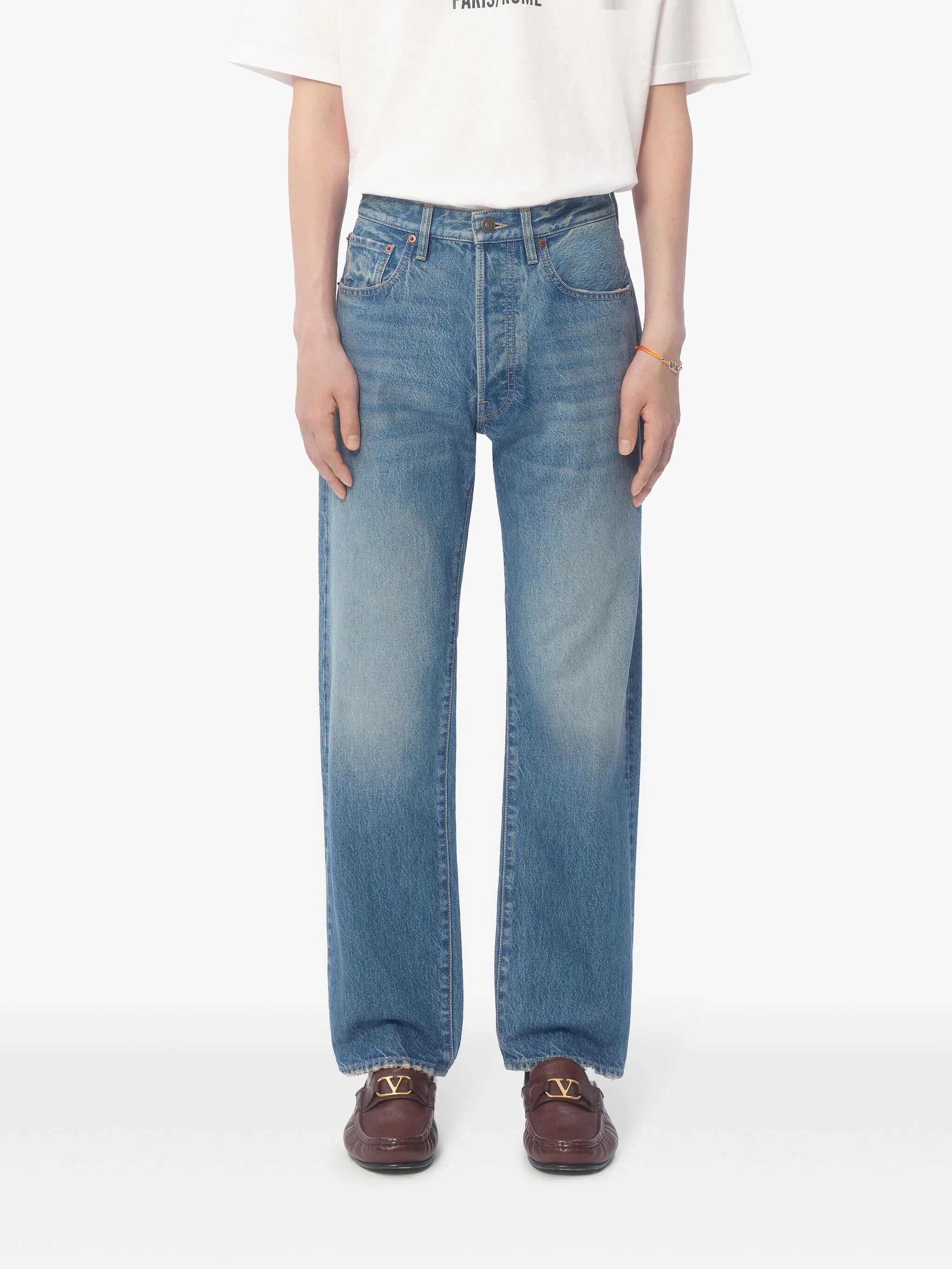 Five-pocket cotton denim jeans with high waist, straight leg, button closure, and leather 'Chez Valentino' logo label on the back