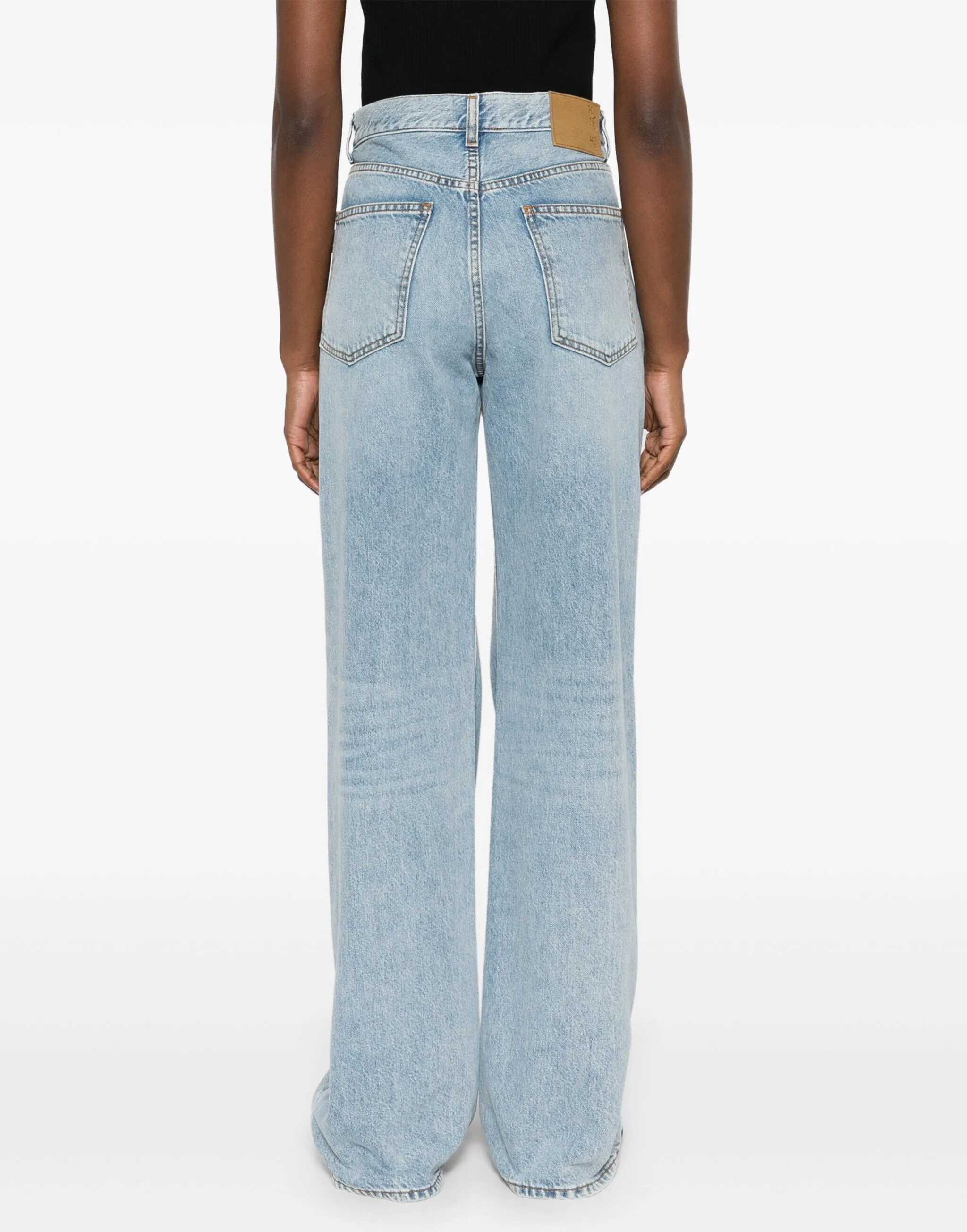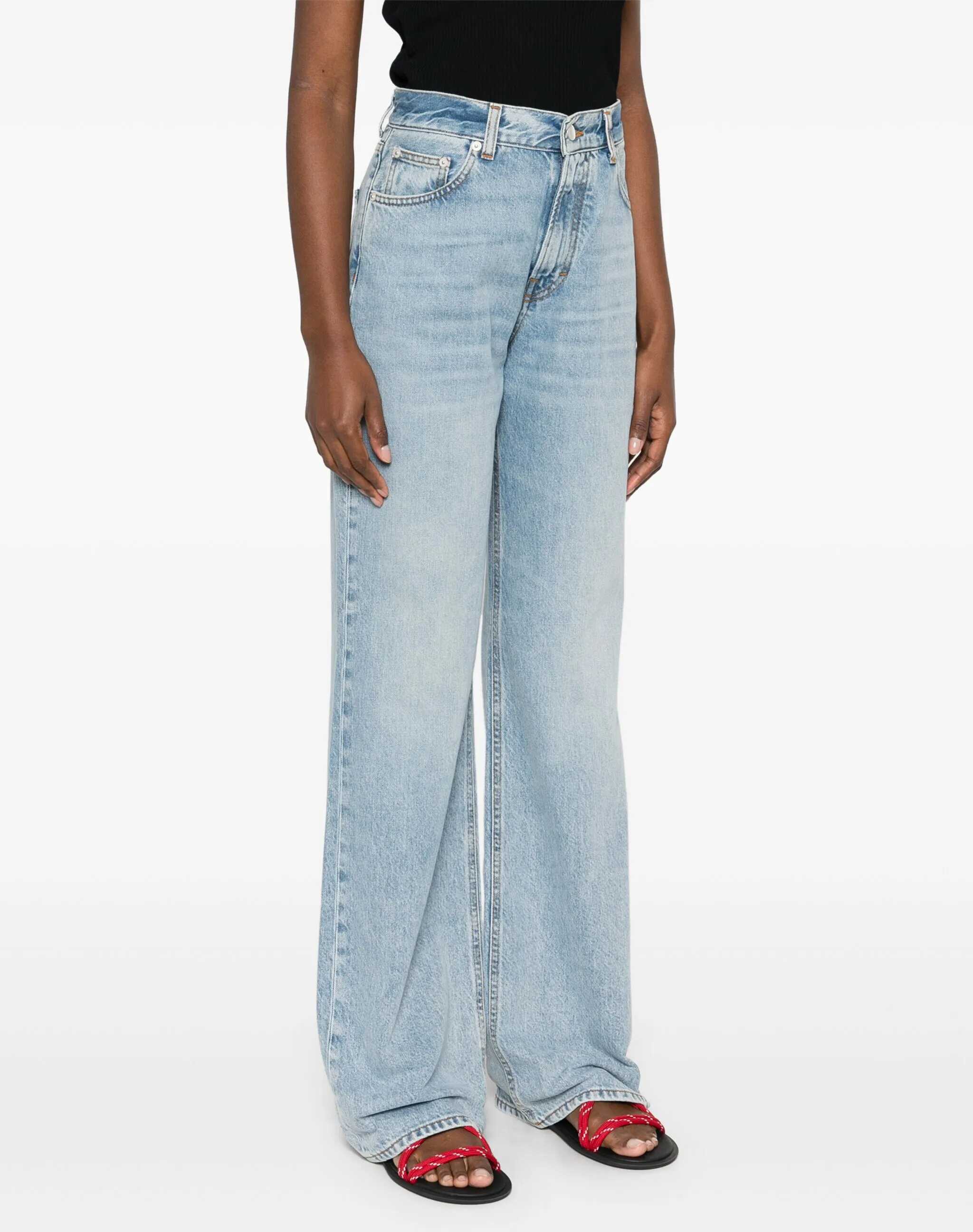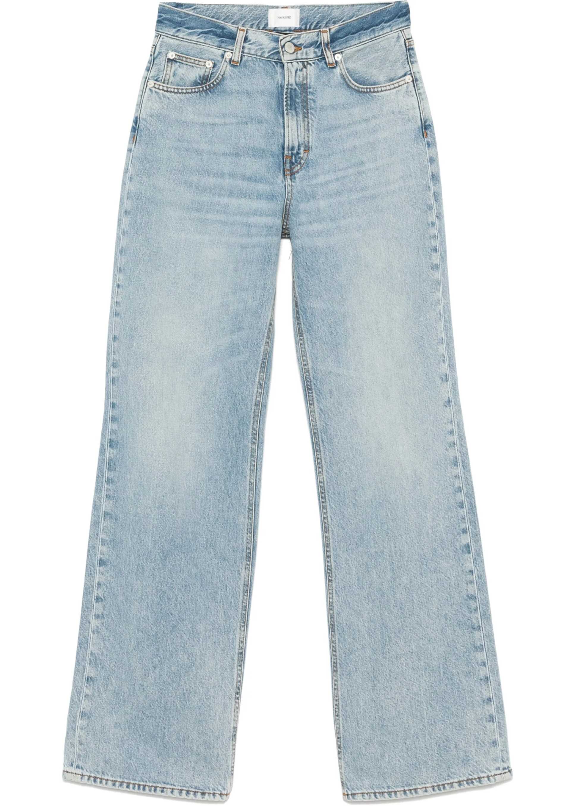 Korea jeans in aqua blue denim with a mid-rise waist. They feature a button closure, five pockets, belt loops, wide-leg design, and a beige suede patch on the back with an engraved logo.