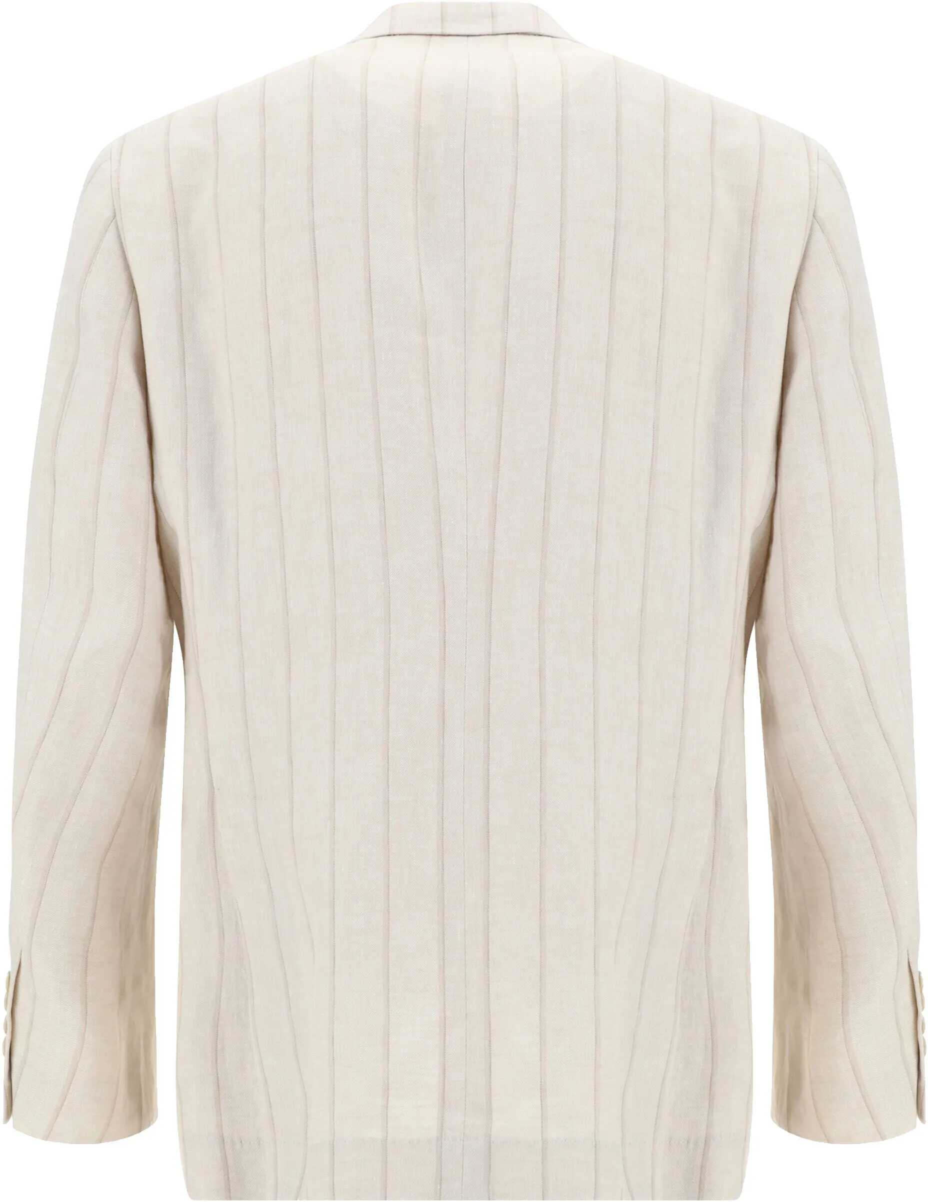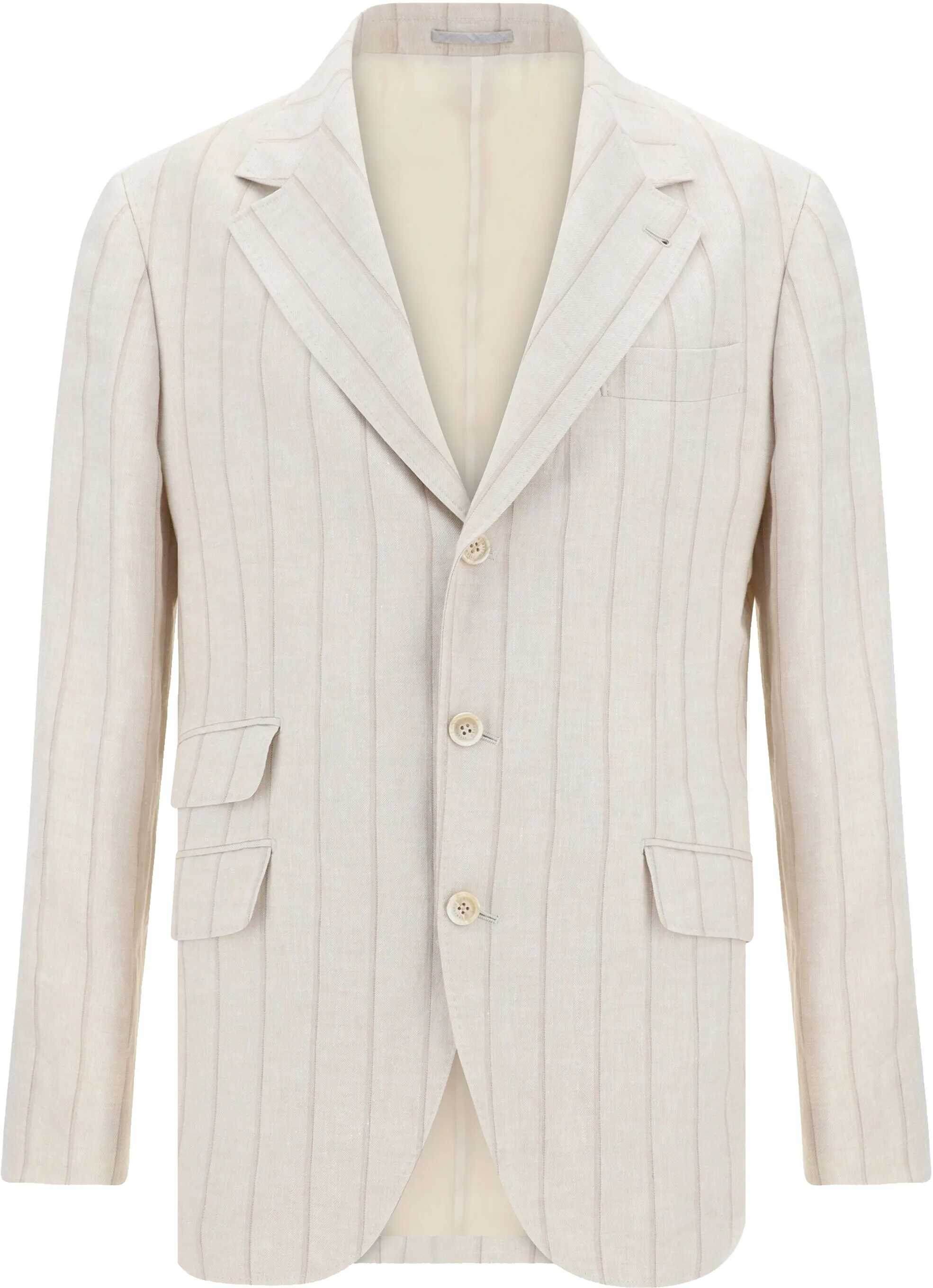 Brunello Cucinelli's linen Blazer Jacket is an elegant and sophisticated piece, featuring a pinstripe design that lends a timeless touch of class. The front button closure and classic lapels add sophistication to the design. The blazer features three flap welt pockets on the front and a front welt pocket, offering practicality and style. The two slits at the back ensure a comfortable fit and balanced silhouette. The regular fit ensures optimal comfort, making this jacket ideal for formal or dressy yet versatile looks. A must-have for those looking for a high-quality garment with a sophisticated design.
