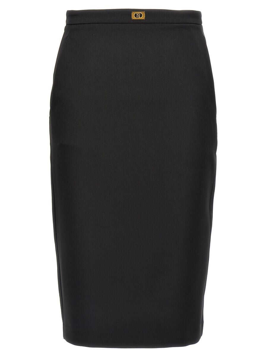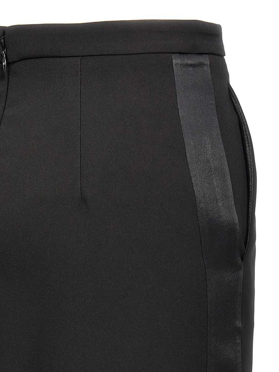 Longuette skirt in stretch crêpe with side bands in shiny satin, front metal logo, pockets, back zip closure, and back split