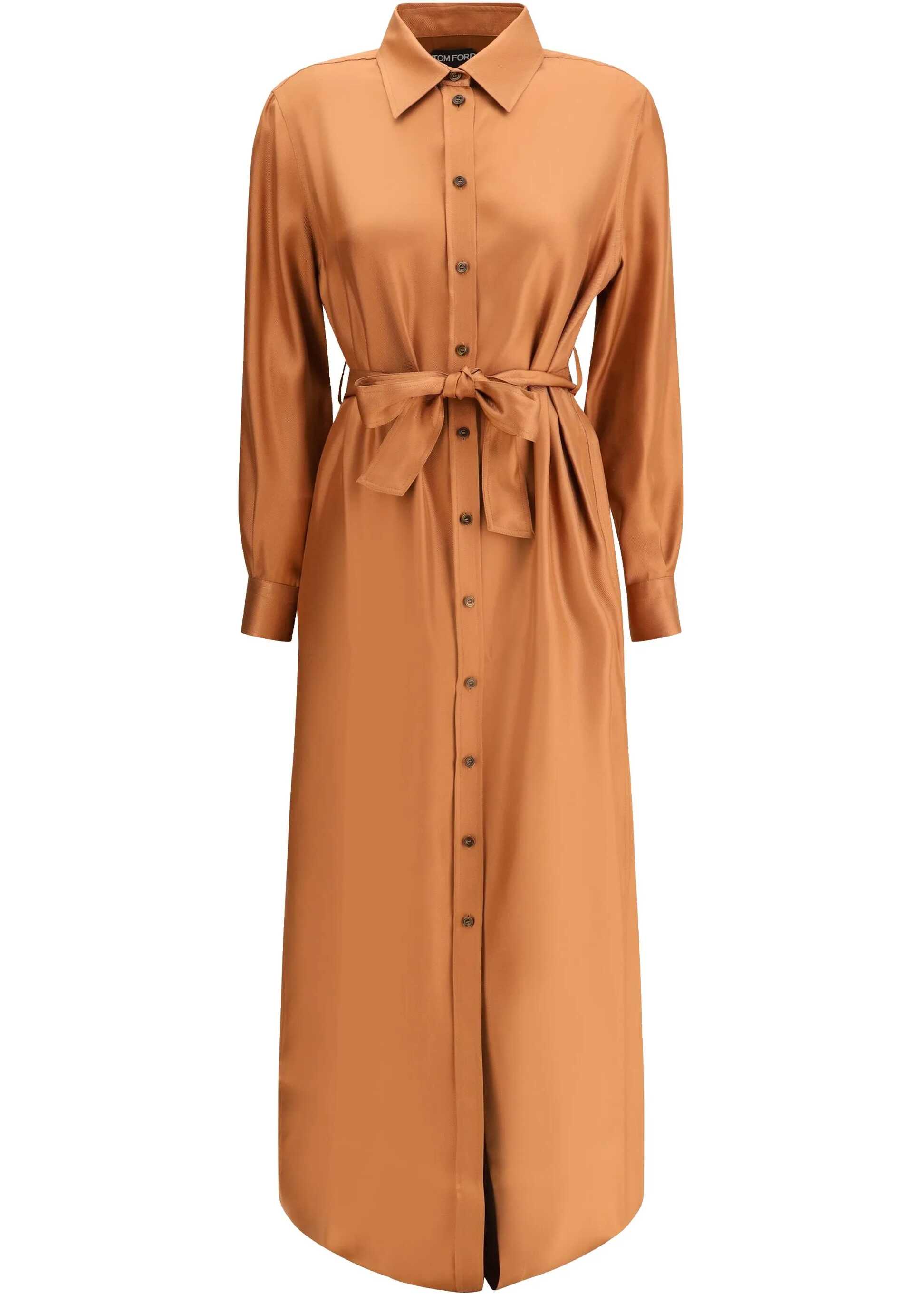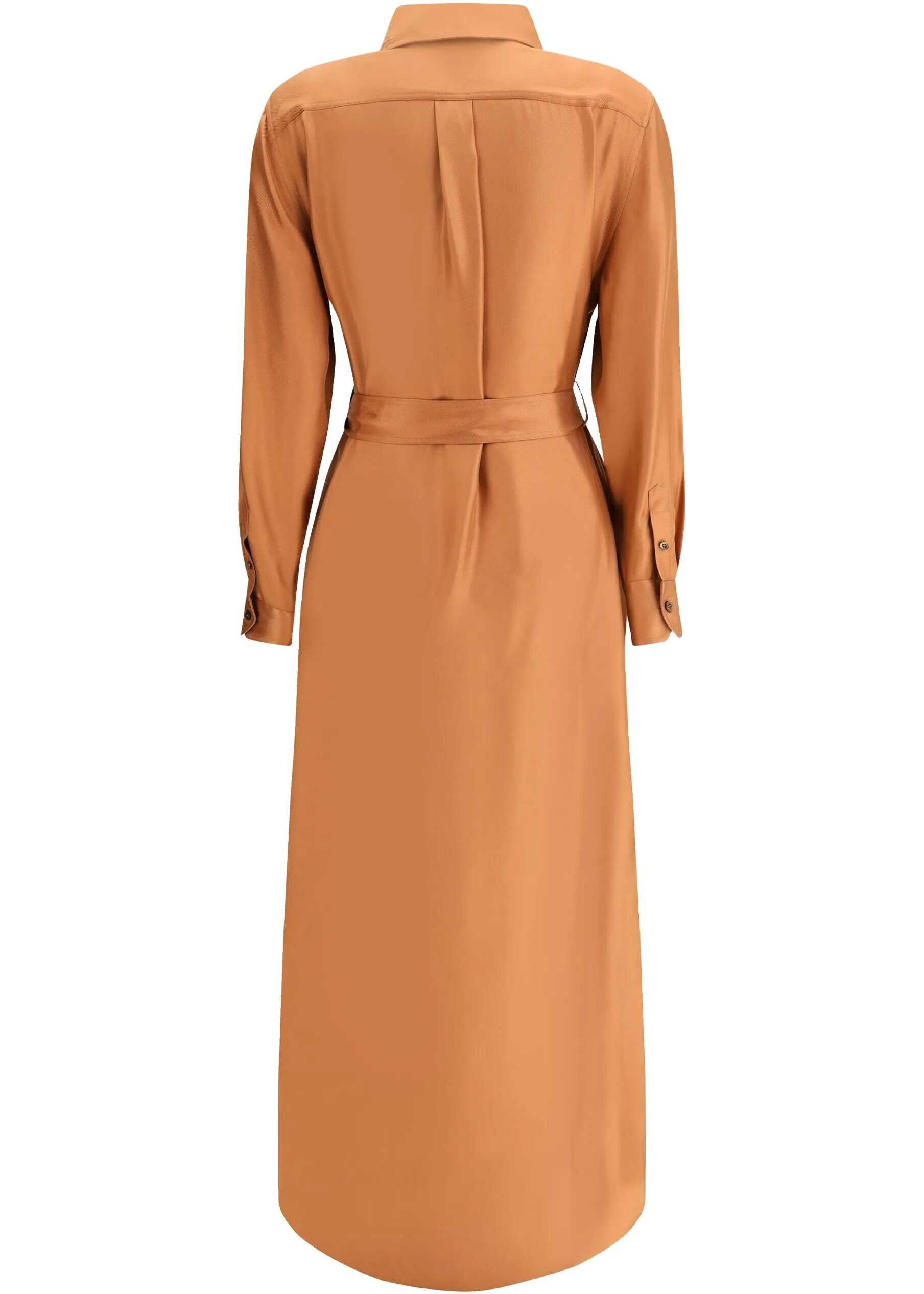 Tom Ford's silk Dress is an elegant chemisier style with a classic collar and deep slits on the side panels, adding a bold and sophisticated touch. Adjustable buttoned cuffs offer a customizable fit, while the matching, knotted sash at the waist emphasizes the silhouette with a classy detail. A dress that combines sophistication and modernity, perfect for special occasions.