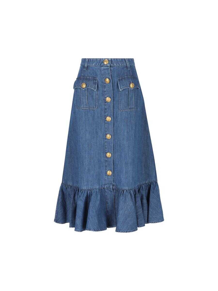 - Material: 64% cotton, 36% linen - Color: blue - Other details: leather logo patch applied on back, flared bottom and two patch pockets on front - Button closure - Made in Italy - Item code: 6B3DD18L94C558