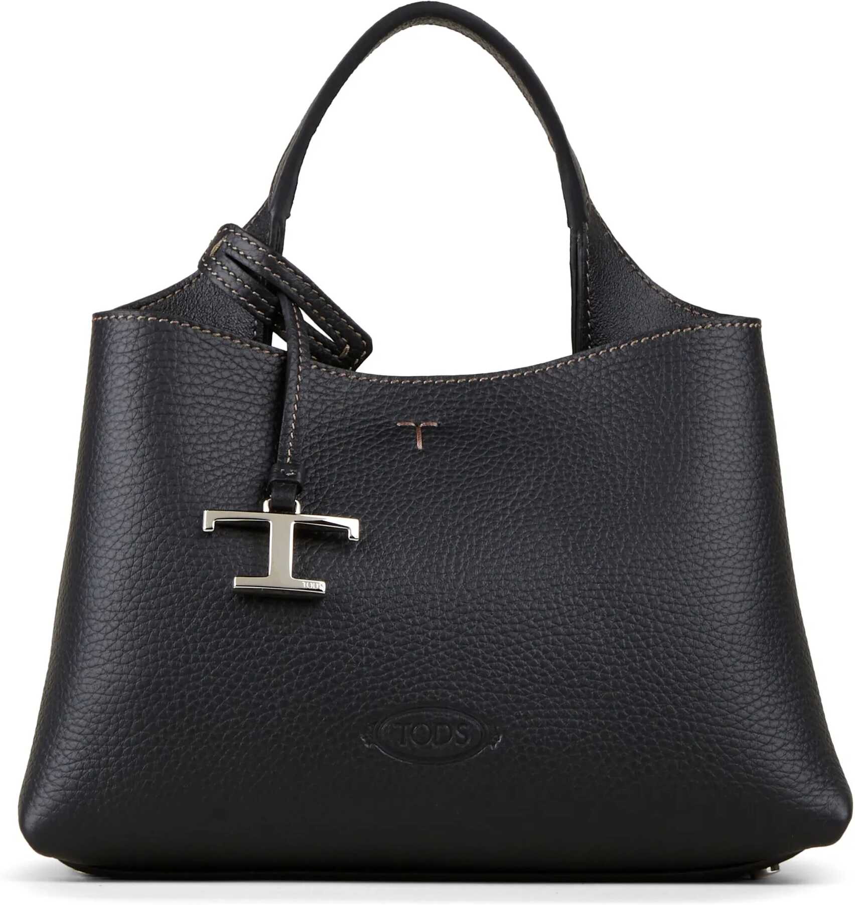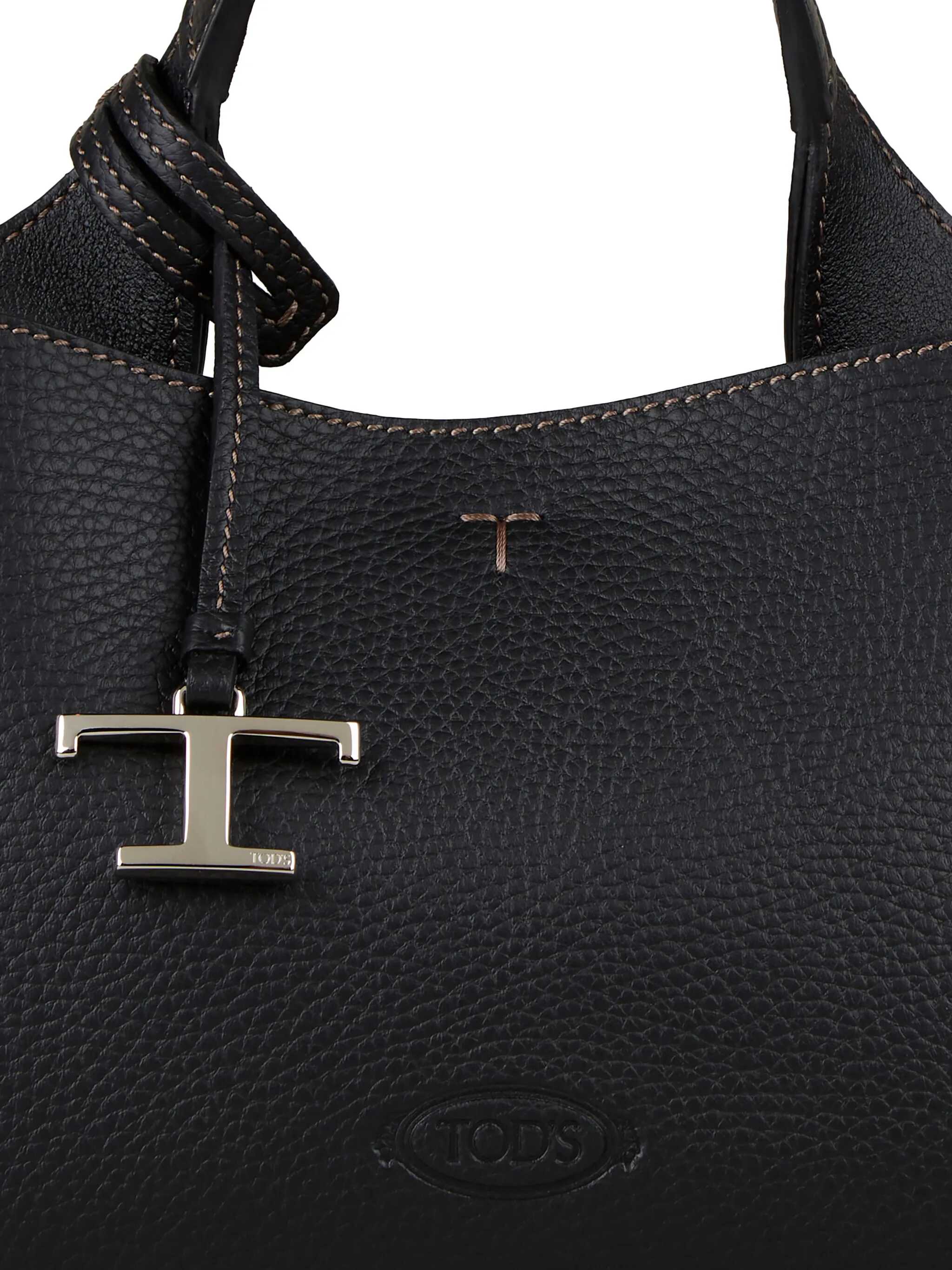 Micro bag in black grained leather with embossed Tod's logo on the front and detachable T Timeless charm. It features fixed handle, adjustable and detachable shoulder strap, hook closure and two main interior compartments separated by a zip pocket. Dust bag included. Any leather imperfections are not to be considered manufacturing defects, but a peculiarity of the material.