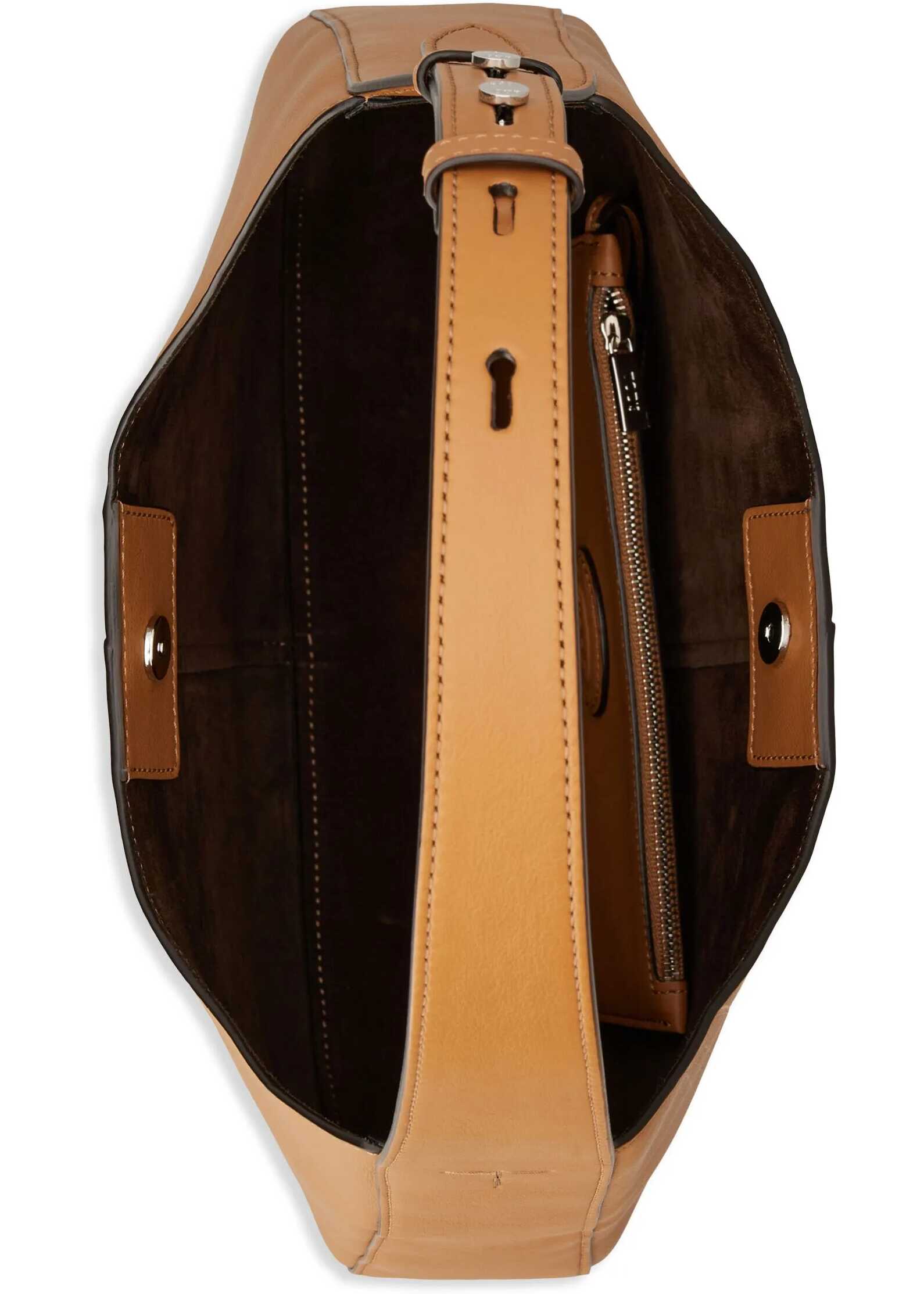 Tod's Di Bag Hobo in camel calf leather with the Tod's logo embossed on the front. It features an adjustable handle, a snap button closure, a main internal compartment, and a removable zip pouch. The interior is lined in suede. Dust bag included. Any imperfections in the leather are not considered manufacturing defects but are a characteristic of the material.
