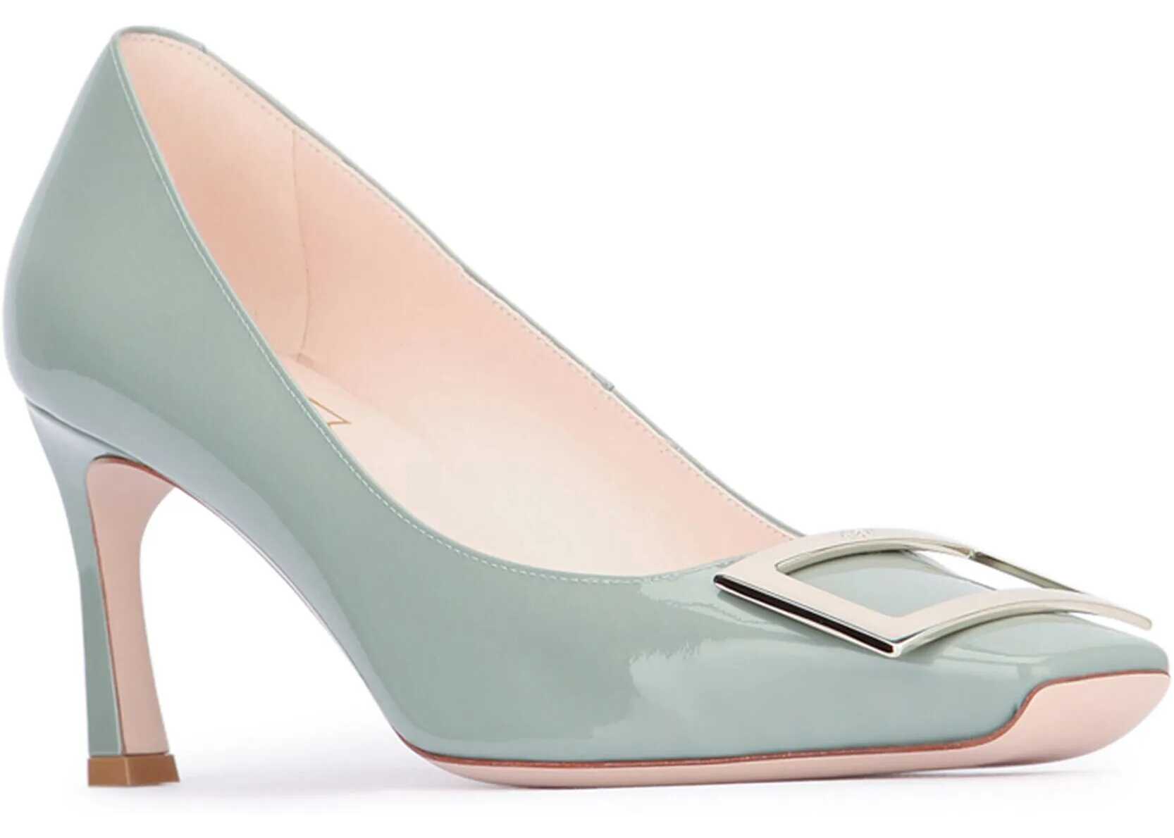 Belle Vivier Trompette pumps in green patent leather with a square metal buckle featuring the logo. They feature a square toe, a thin heel, a logo embossed on the insole, and a leather sole. Dust bag included. Any imperfections in the leather are not considered manufacturing defects but are a characteristic of the material.