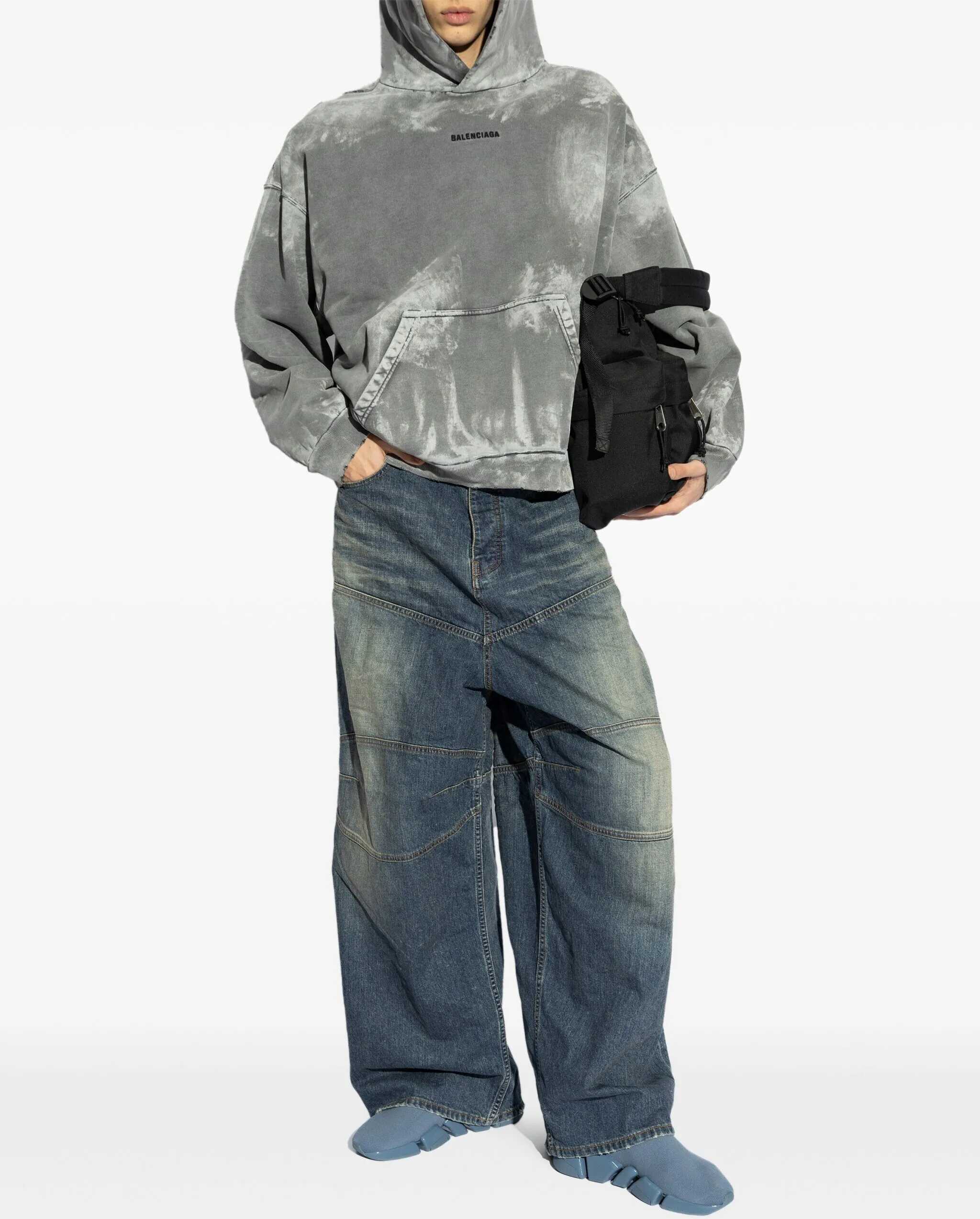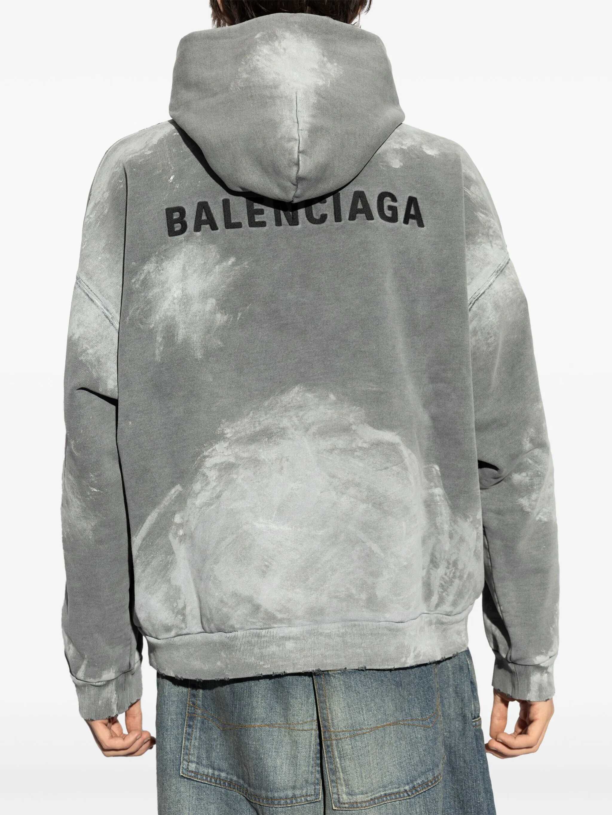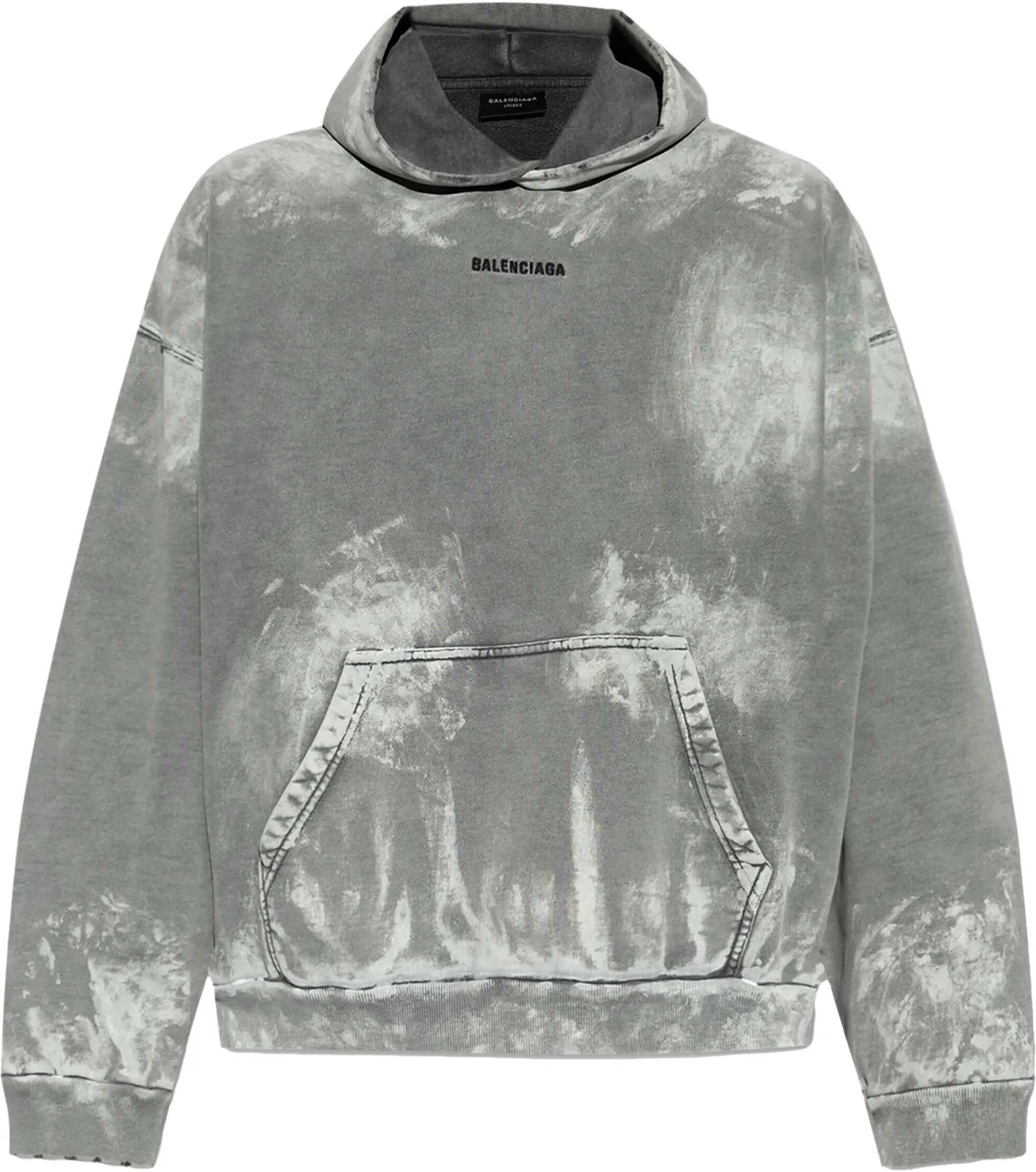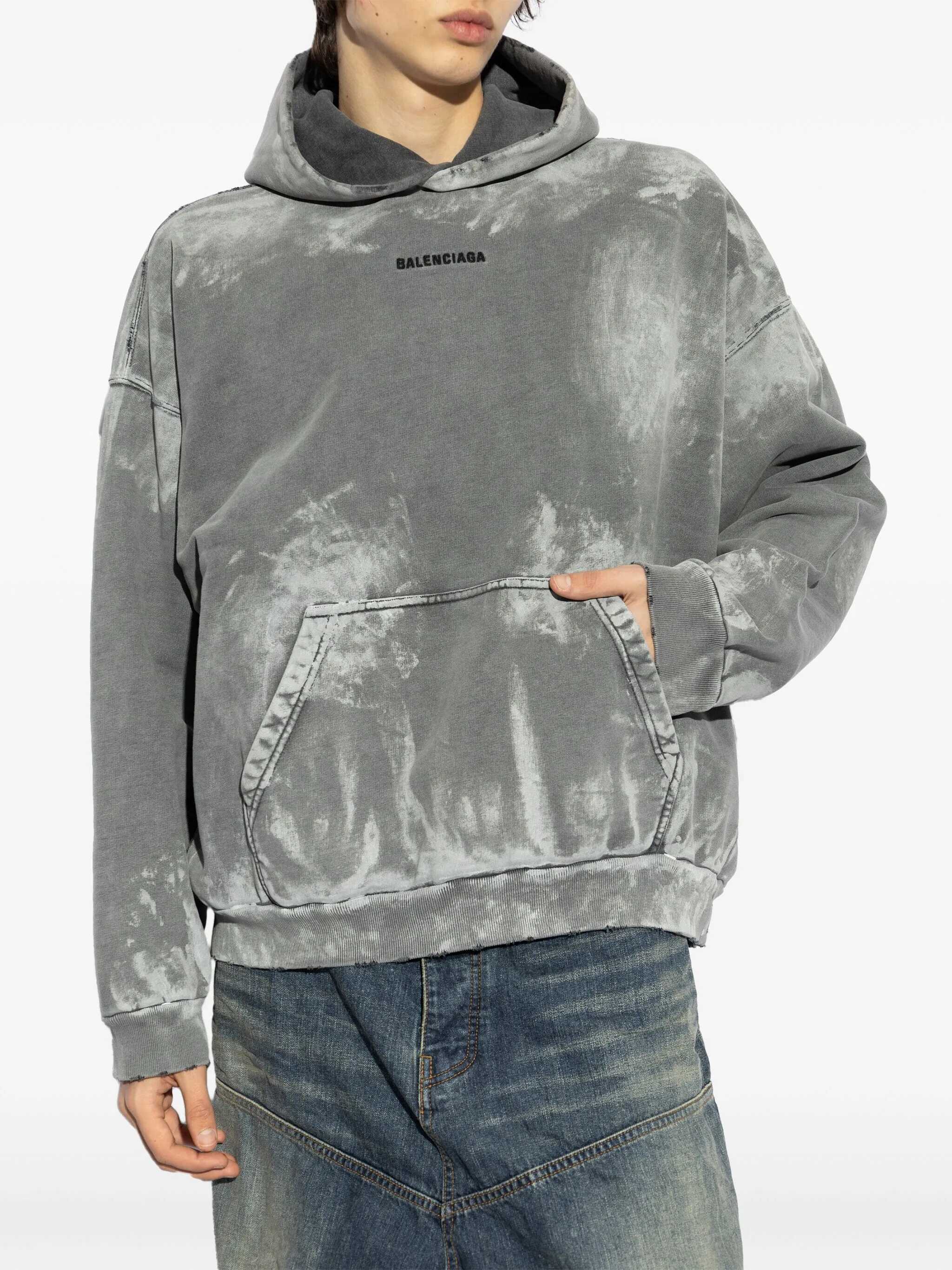 Balenciaga Back Medium Fit hoodie in Archetype grey fleece with a stained effect. It features a hood without a drawstring, dropped shoulders, a Balenciaga logo embroidered on the front and back, a front kangaroo pocket, and gathered ribbed cuffs and hem. Oversized fit.