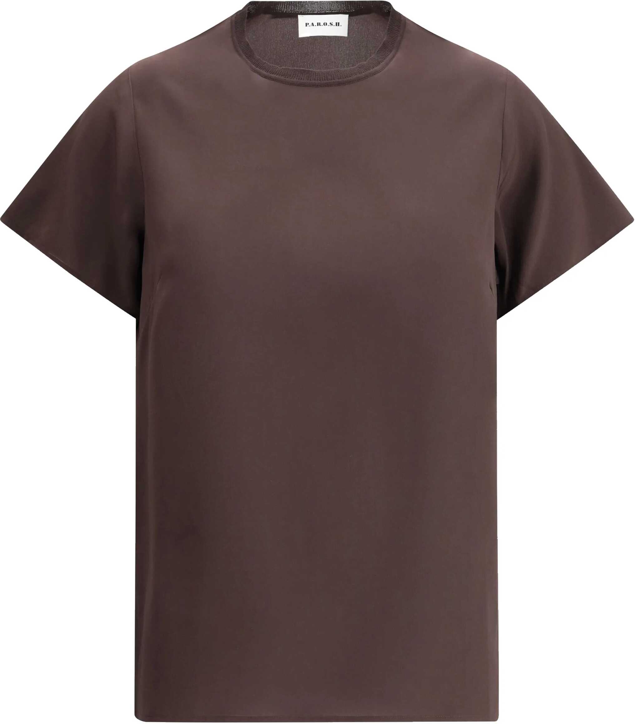 P.A.R.O.S.H.'s short sleeve silk Top is an elegant and versatile garment featuring the lightness of silk that gives a luxurious feel to the touch. The ribbed crew neck adds a refined, understated detail, while the loose fit ensures comfort without sacrificing a sophisticated cut.