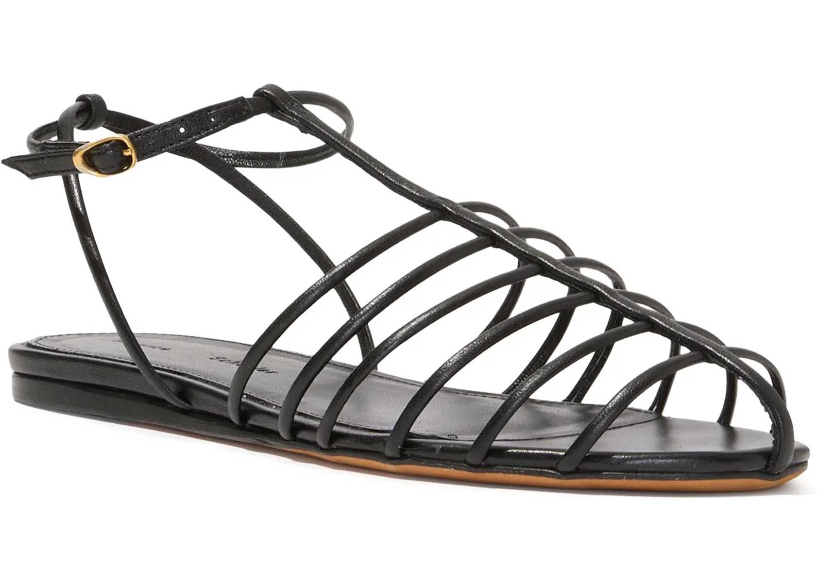 Proenza Schouler's lambskin Tee Cage Low Sandals feature a sleek caged silhouette with thin crisscrossed T straps that wrap around the shoe in a modern, sophisticated design. The rounded toe adds comfort and harmony to the shape, while the small buckle closure at the ankle ensures a secure and adjustable fit. The flat sole ensures stability and comfort, while the logoed insole confirms the brand's authenticity.