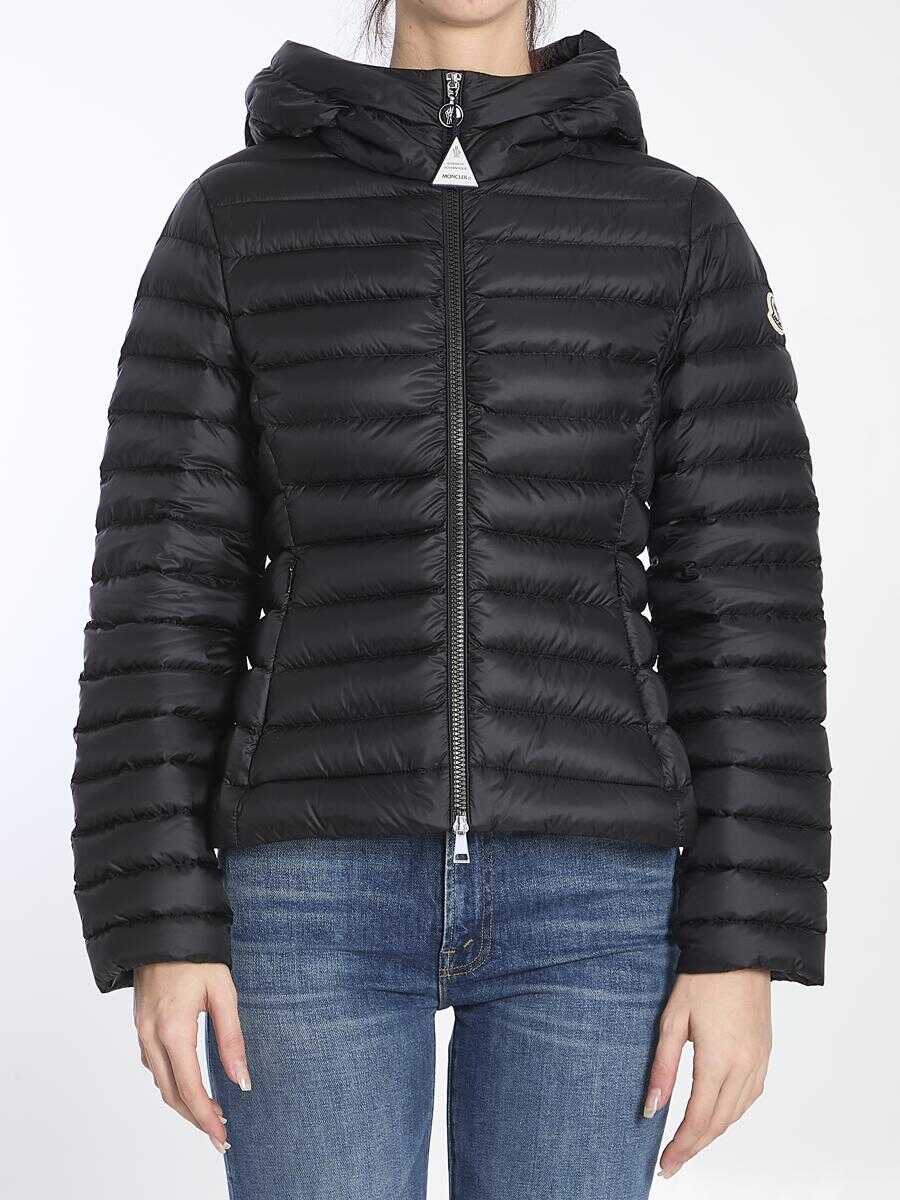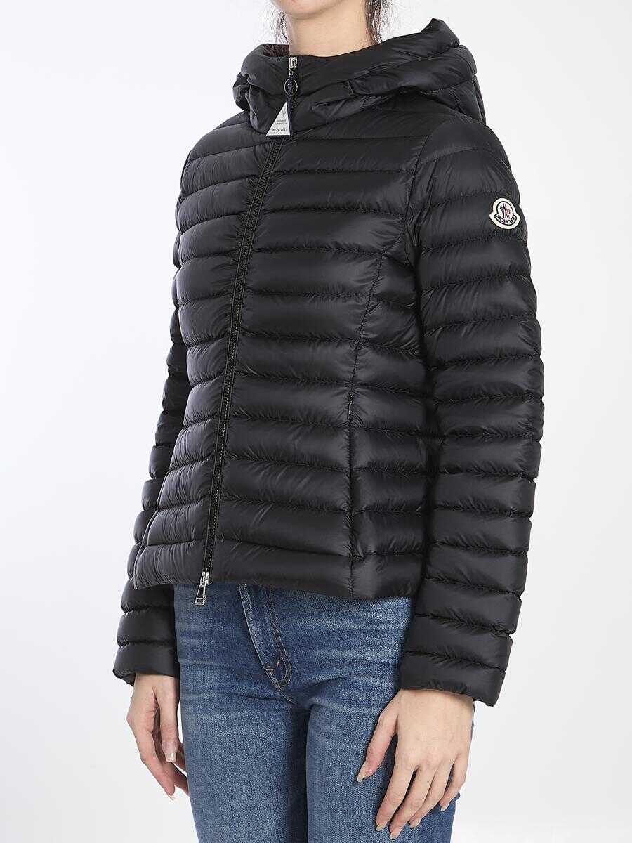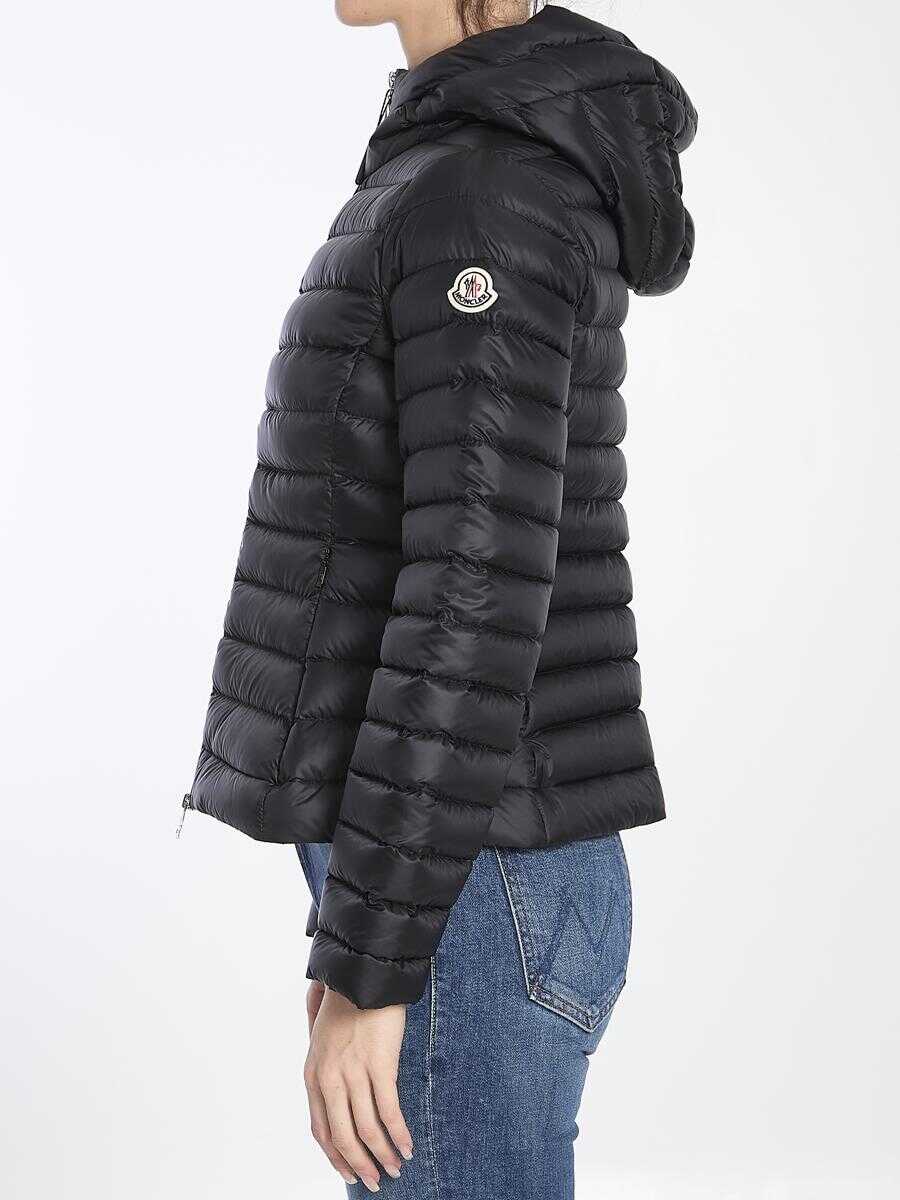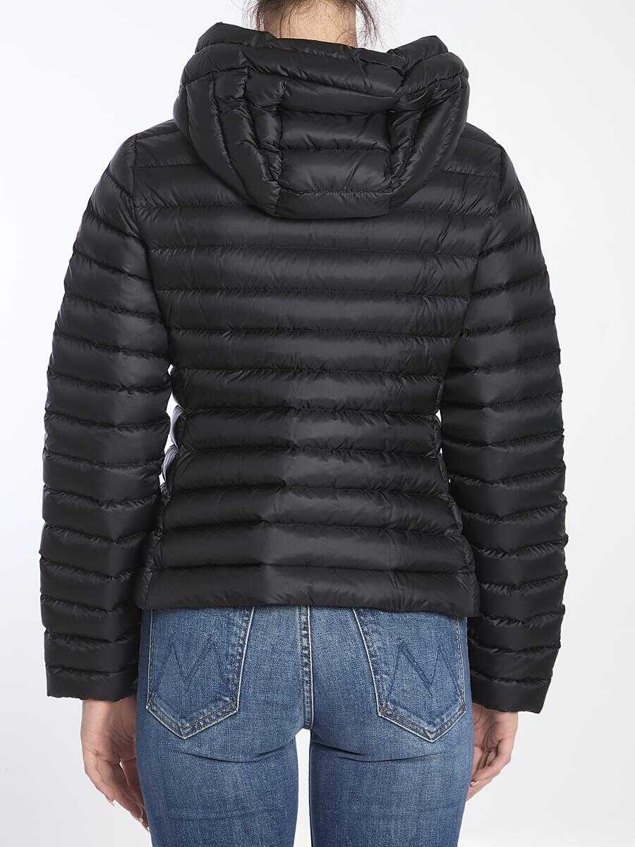 Short Ige puffer jacket in black nylon fabric with hood. It features zipper closure, two side pockets with invisible zipper closure and cinched waist. Slim fit.