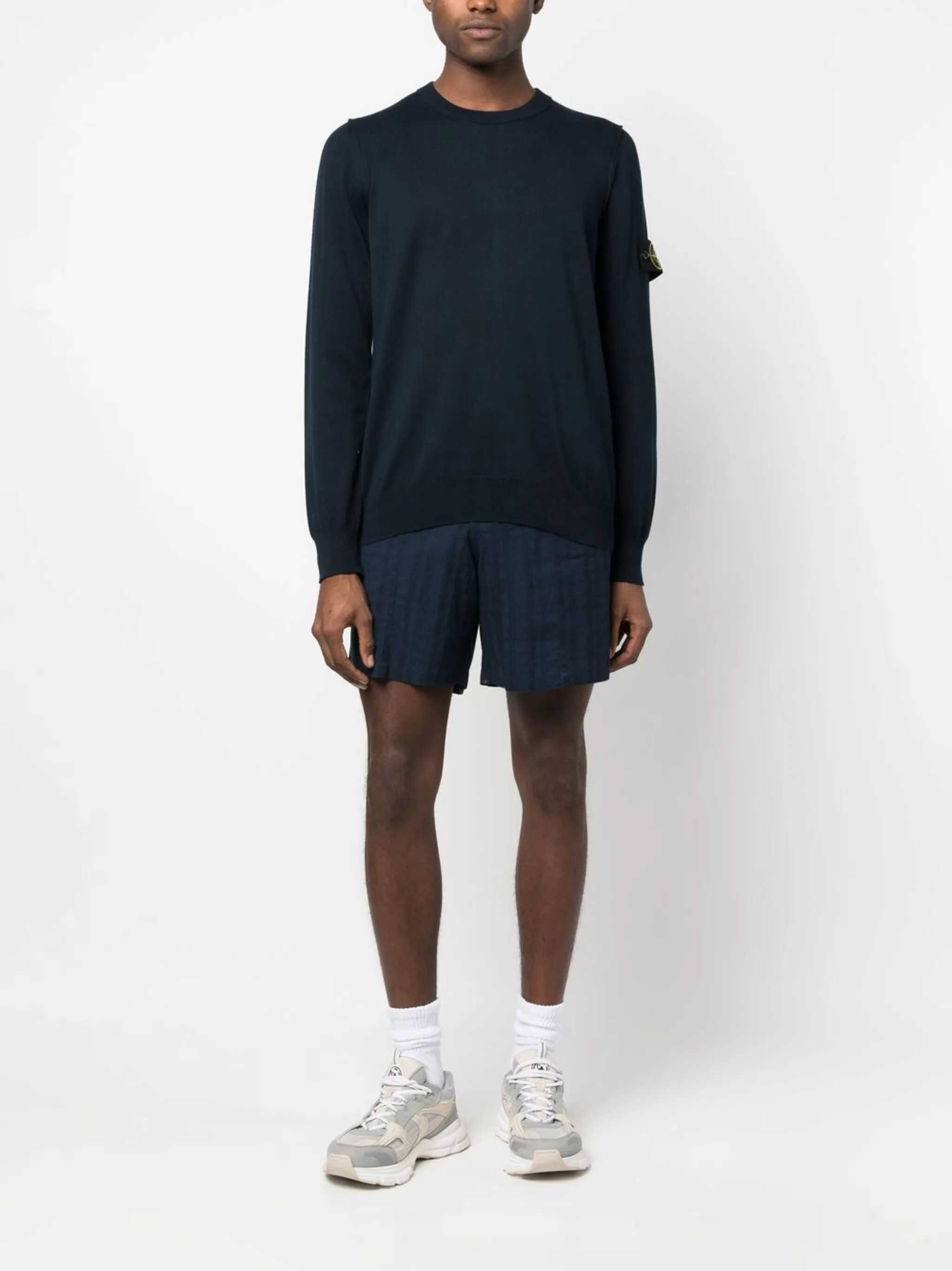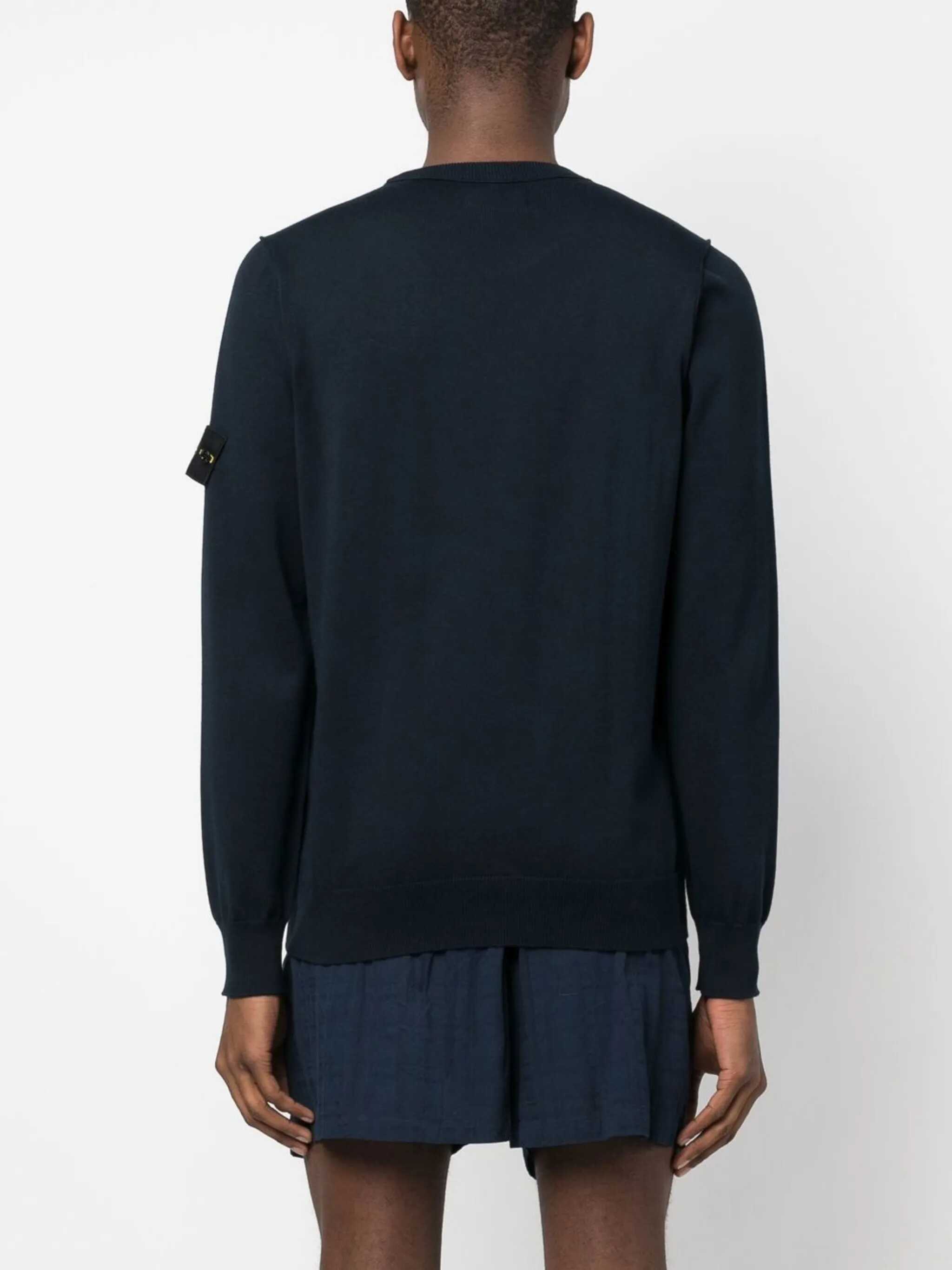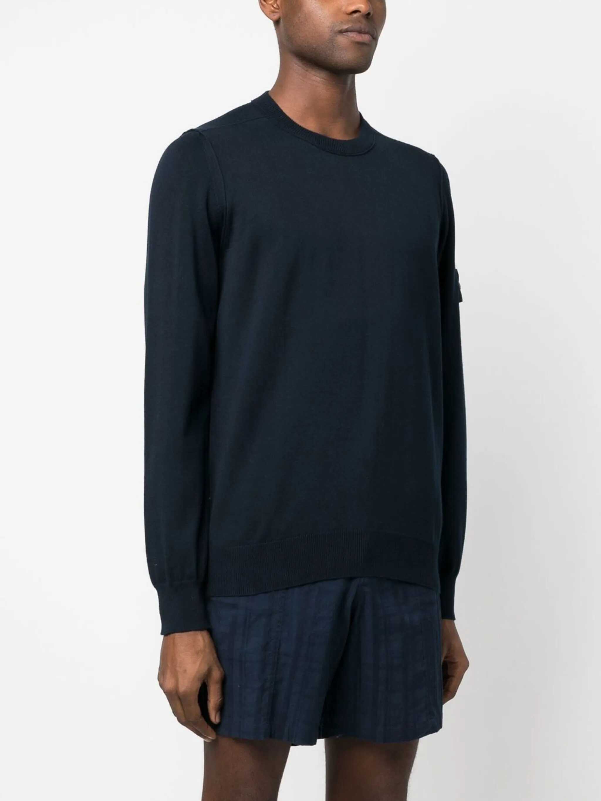 Dark blue organic cotton crewneck sweater in smooth knit with ribbed details. It features a Stone Island patch on the left sleeve and ribbed crewneck, cuffs, and hem. Regular fit.