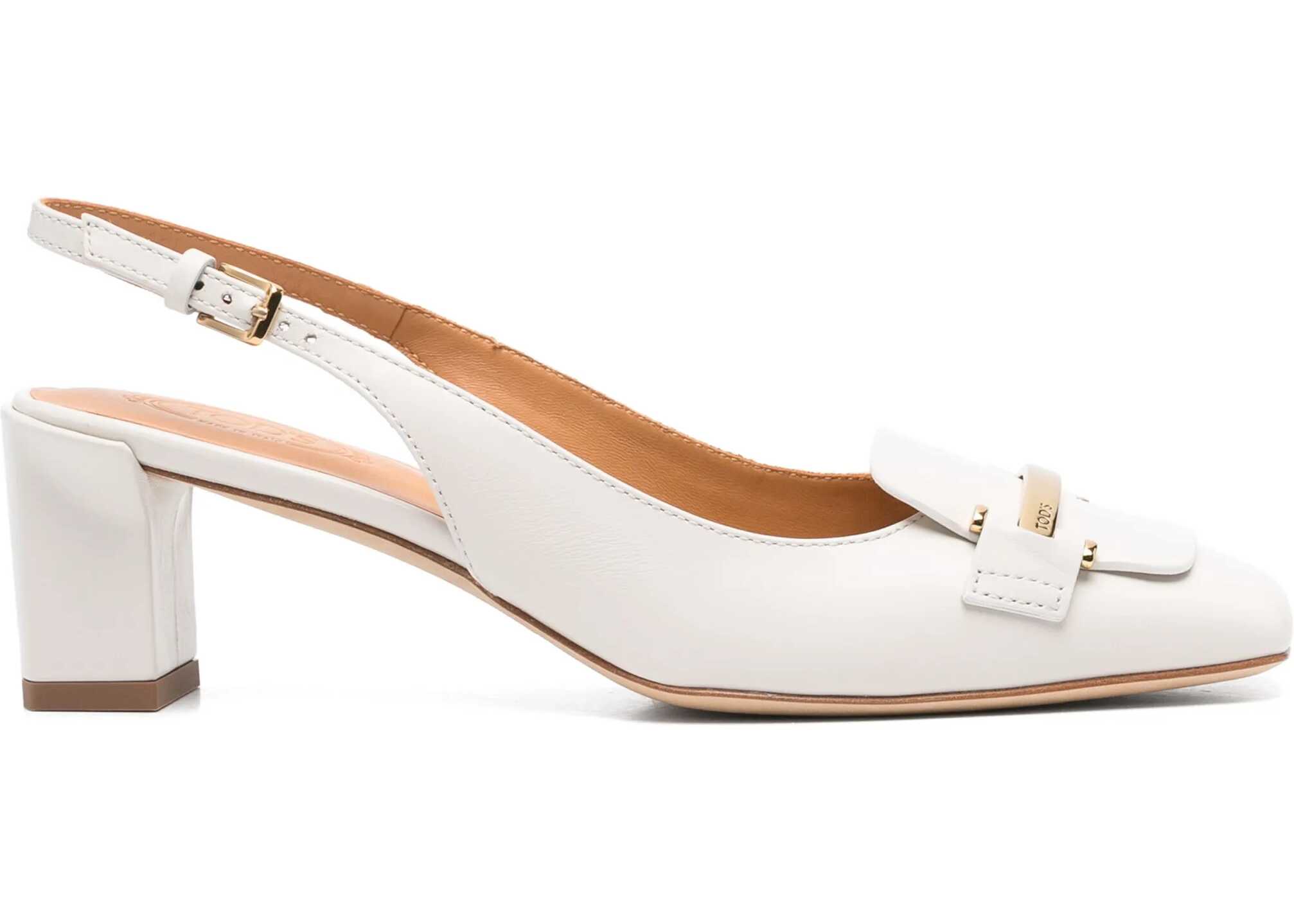 White calfskin slingback pumps. They feature a square toe, a gold-tone metal bar with an engraved logo on the toe, an adjustable strap with a buckle, a leather insole with an embossed logo, a square leather-covered heel, and a leather sole. Dust bag included. Any imperfections in the leather should not be considered manufacturing defects but rather a characteristic of the material.