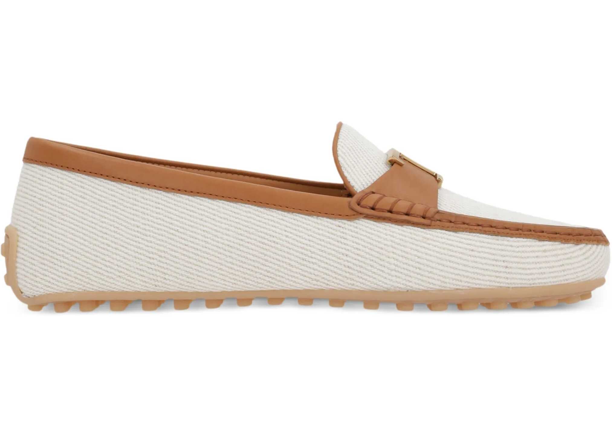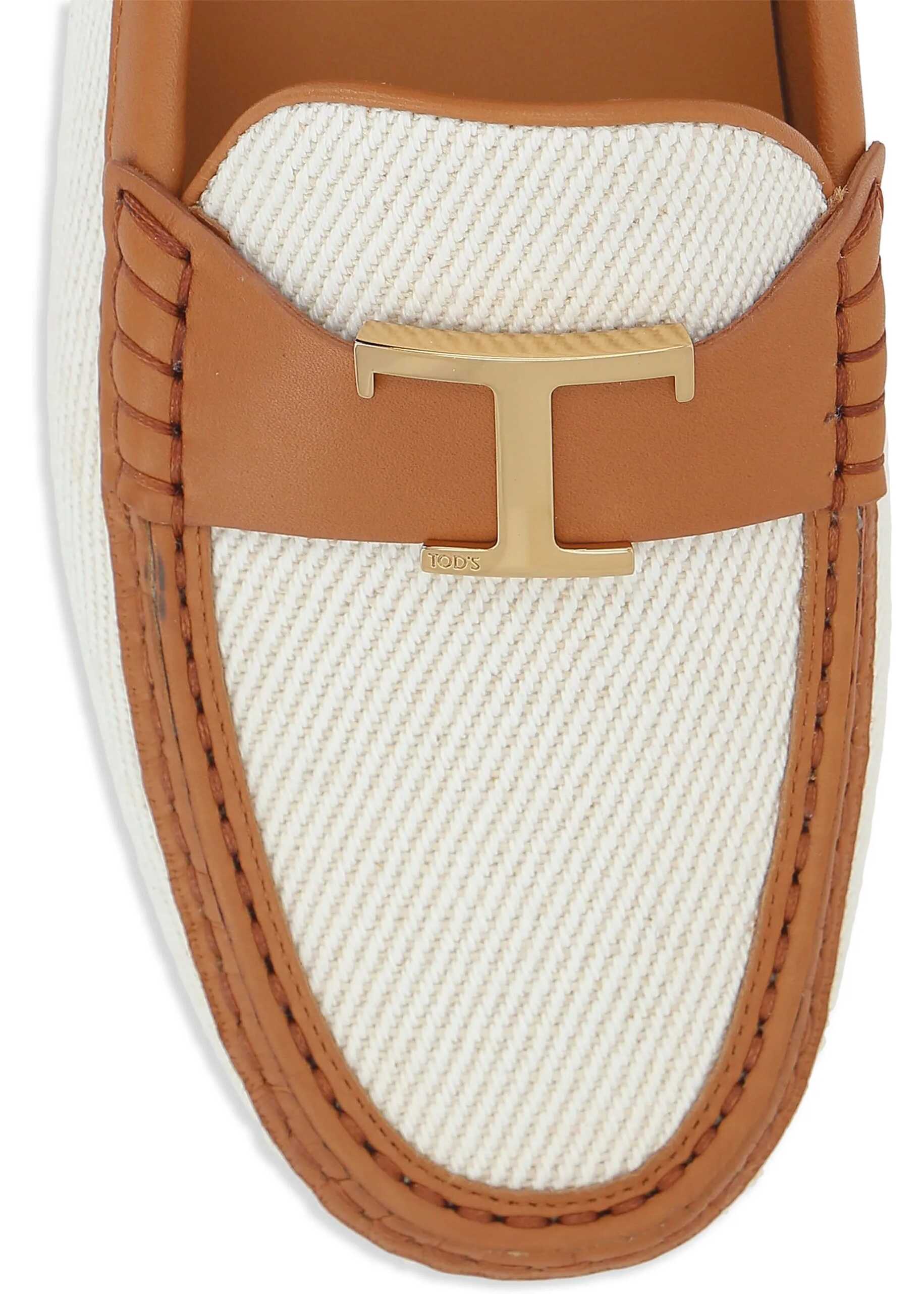 City Gommino moccasins in a white linen-cotton blend fabric and brown leather. They feature a metal T Timeless accessory with an engraved logo on the toe, visible stitching, a rubber studded detail on the heel, a leather insole with an embossed logo, and a rubber sole with studs. Dust bag included. Any imperfections in the leather should not be considered manufacturing defects but rather a characteristic of the material.