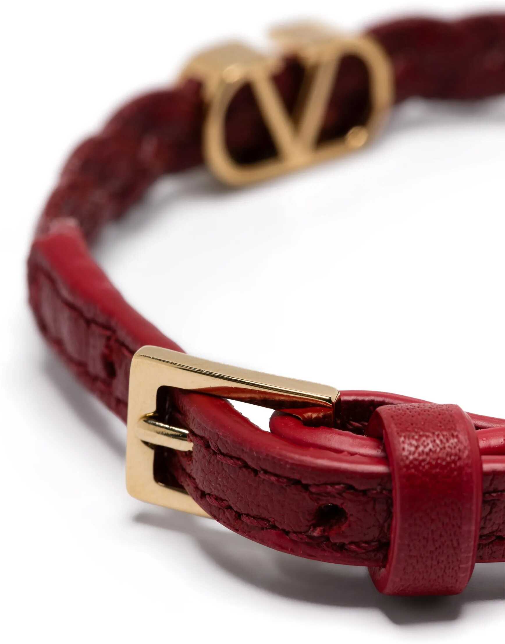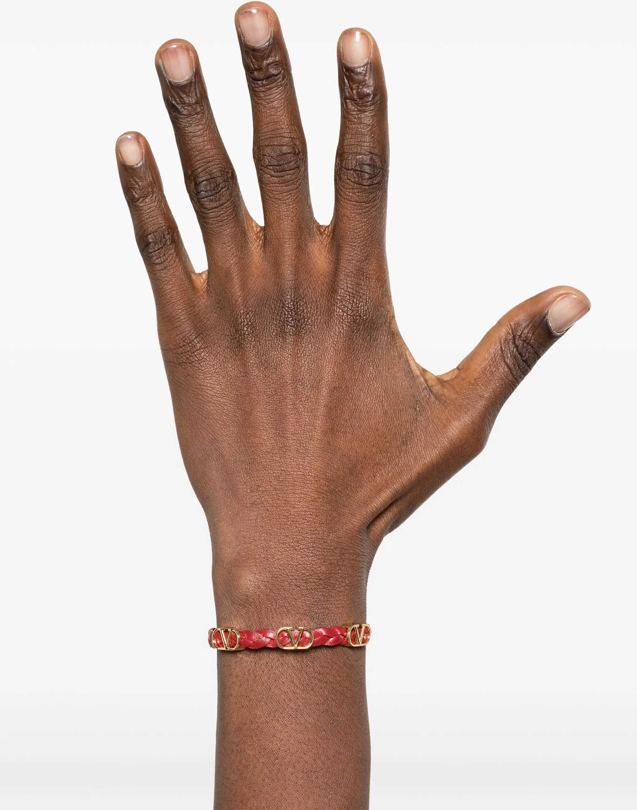The Valentino Garavani Leather Bracelet features an adjustable buckle strap and is embellished with the iconic all-over applied VLogo plaques. The woven leather design lends a sophisticated and elegant touch, making this bracelet a distinctive and bold accessory.