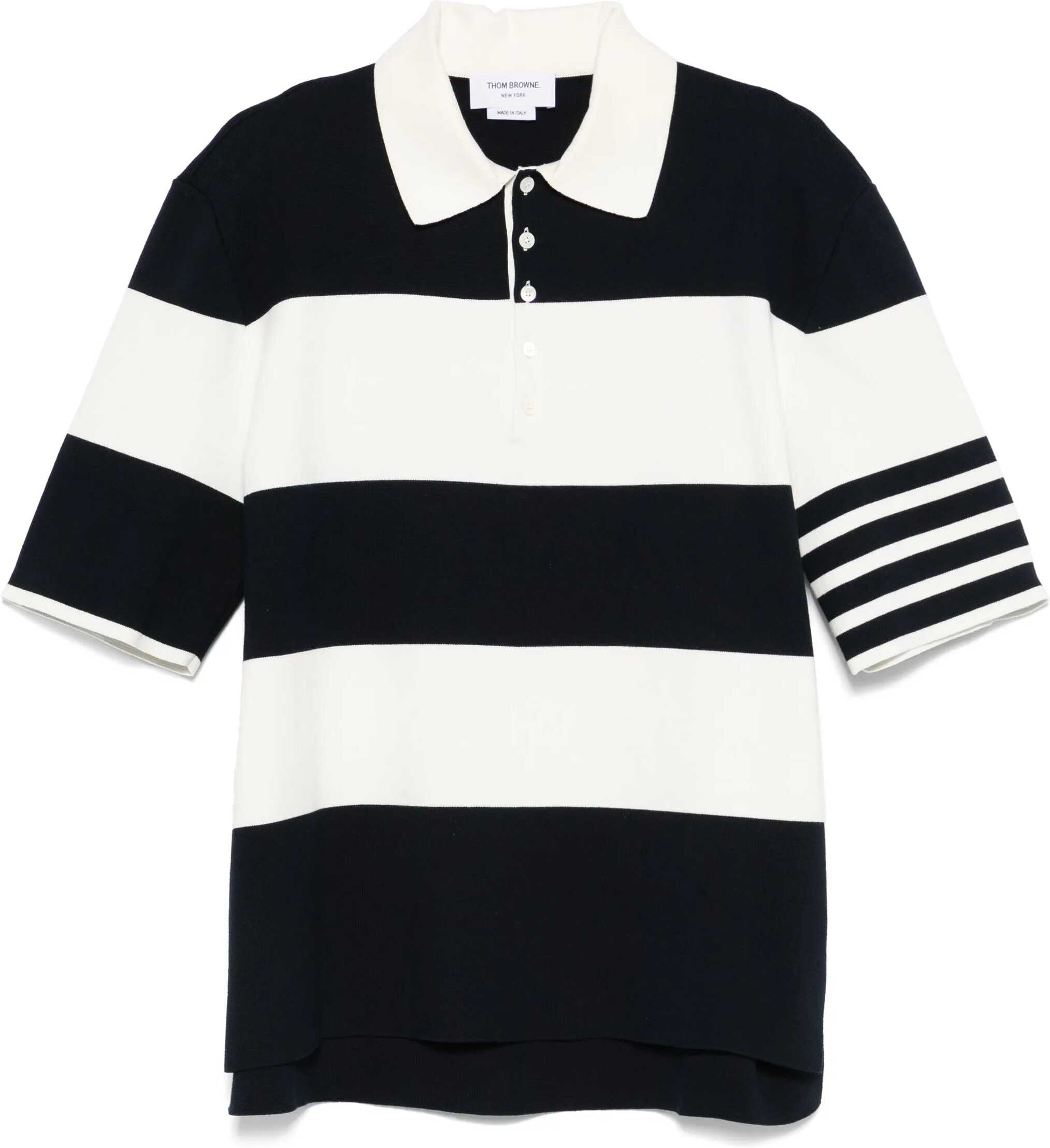 Thom Browne's cotton Milano Polo Shirt is a garment with an elegant and distinctive style. It features a classic collar and front button closure, while side slits add a dynamic touch to the design. The two-tone striped pattern lends a sophisticated look, while the iconic bands on the left sleeve represent the brand in a recognizable way. A perfect garment for those seeking a refined, contemporary style.