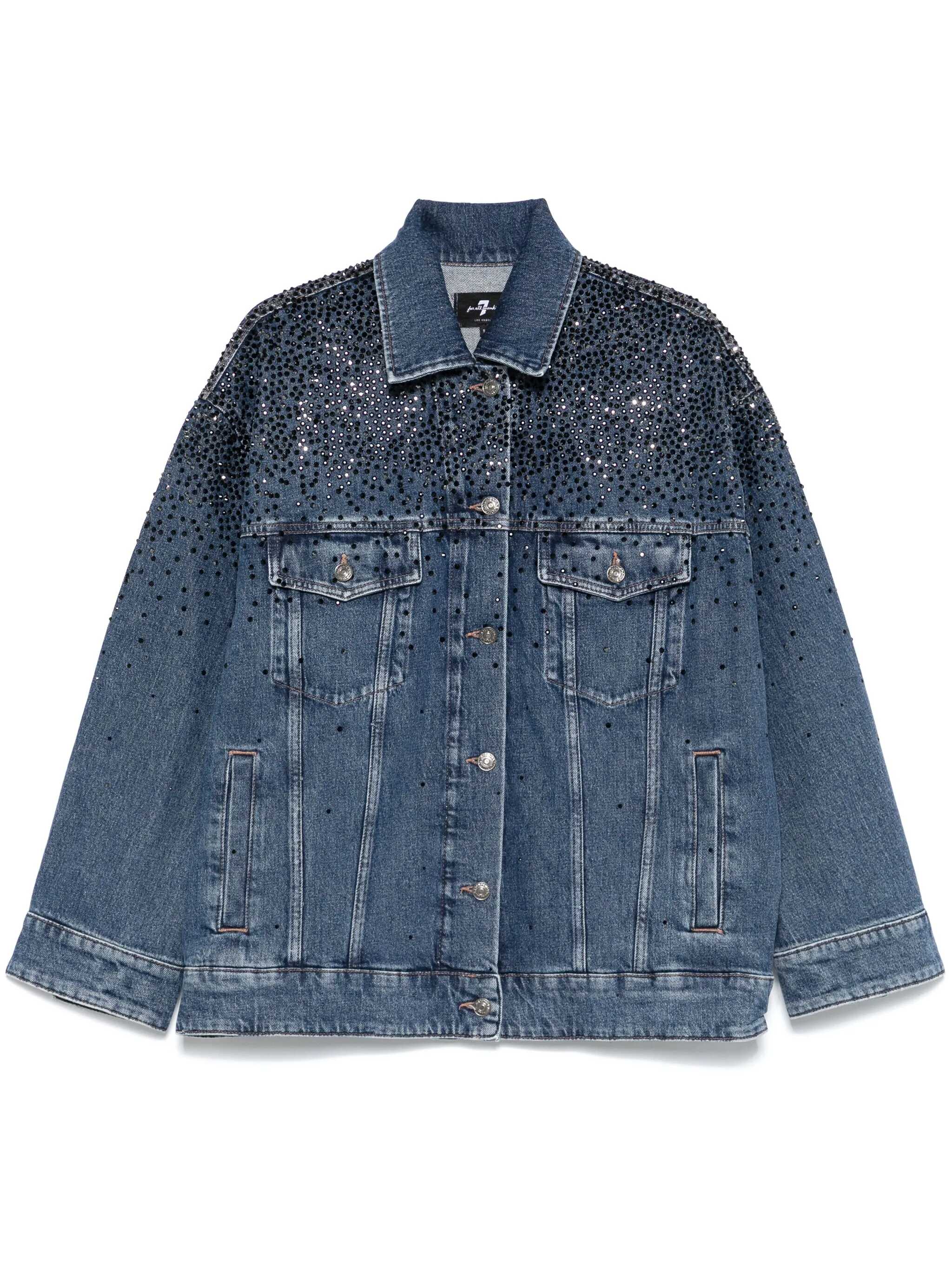 Blue denim jacket with faded crystal effect, made of 99% cotton and 1% elastane. The classic trucker cut is revisited with bright details that give personality to the garment. A must-have to complete casual looks with a touch of sophisticated originality.