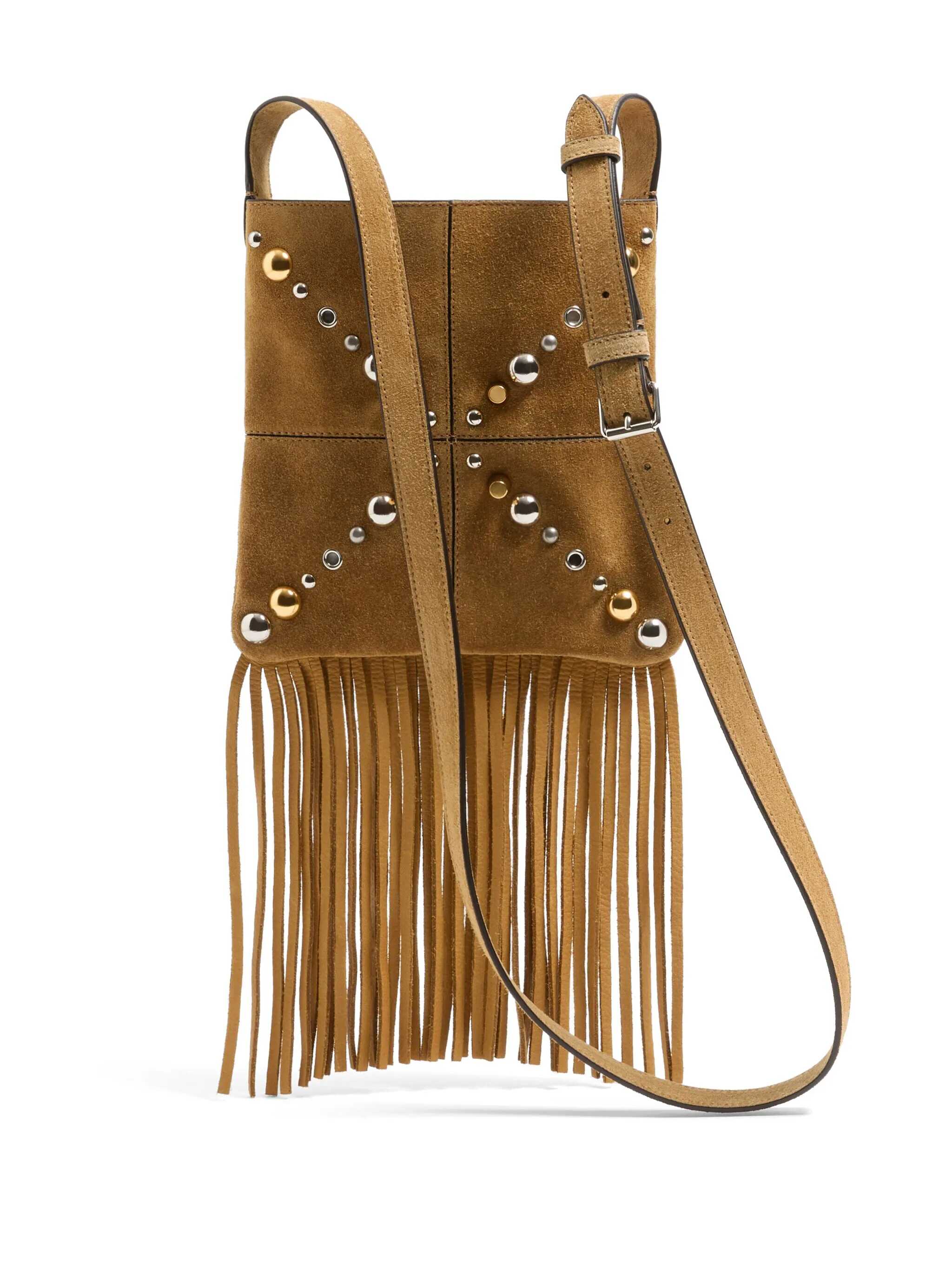 Valentino Garavani shoulder bag crafted in beige suede, adorned with studs of various shapes and sizes. Features silver-tone hardware and an adjustable shoulder strap. The interior is lined with tone-on-tone suede. The design is completed with a VLogo Signature metal detail applied to the front and fringes at the bottom.