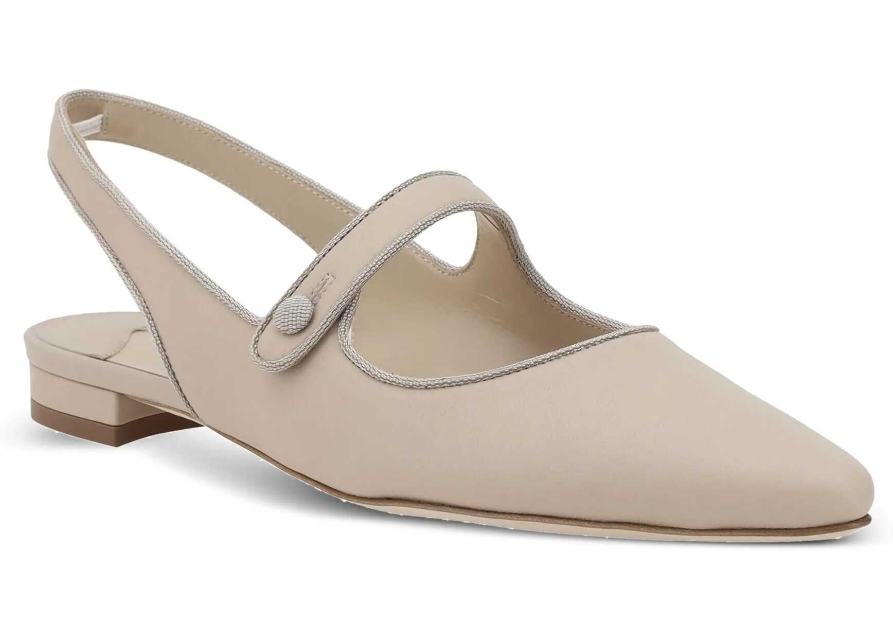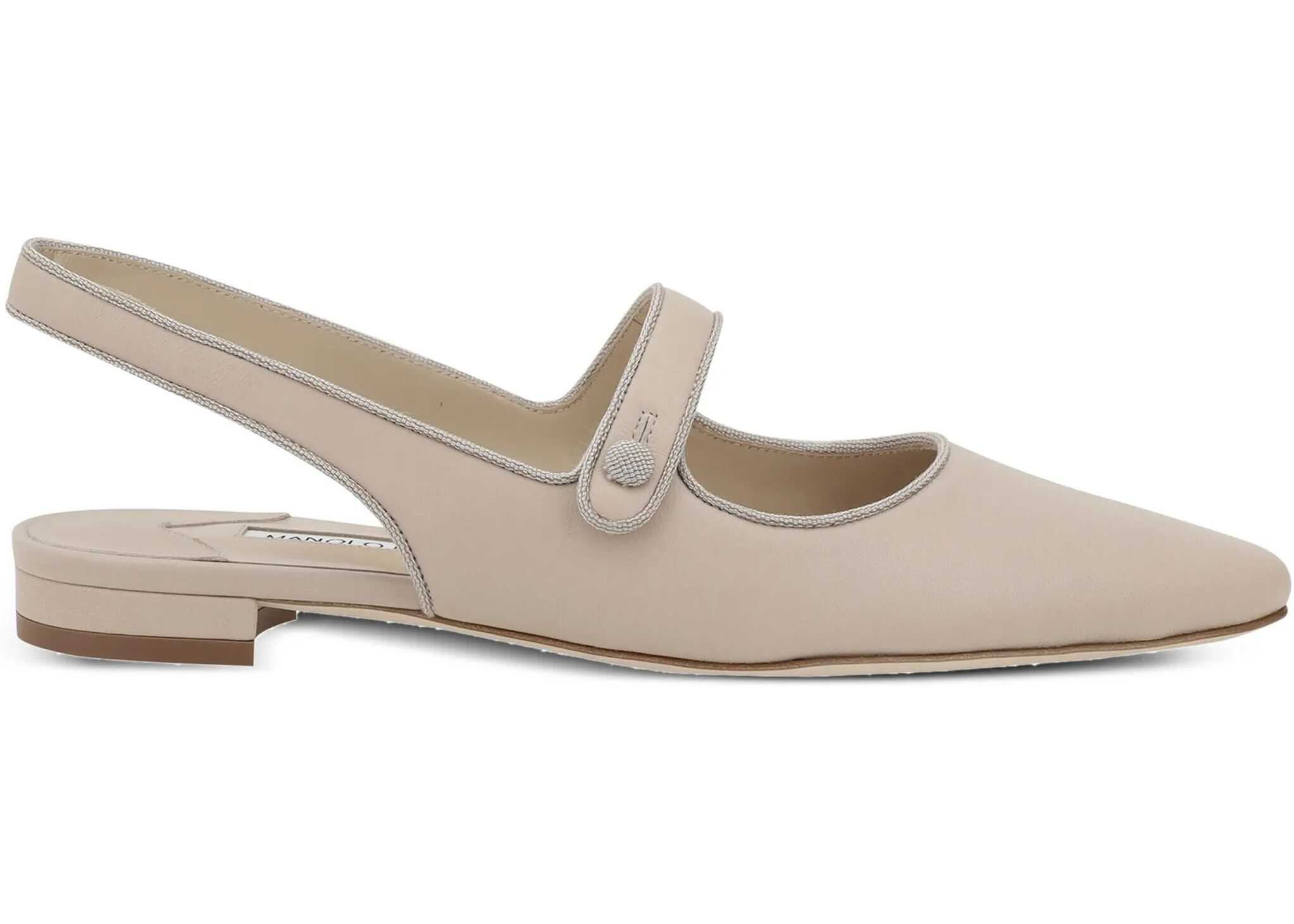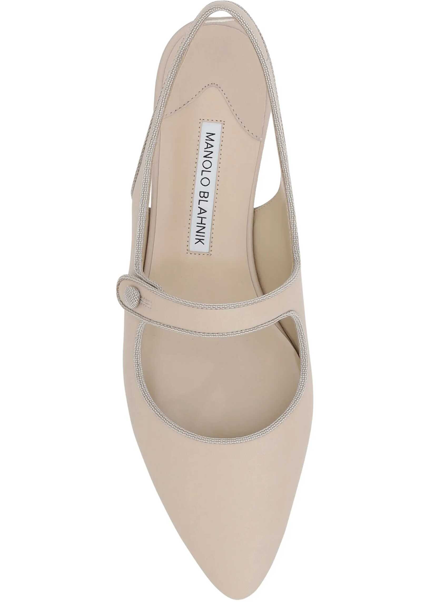Manolo Blahnik's Campariflatsli leather Ballerinas feature an elongated toe that enhances the elegance of the design. The front button closure adds a refined detail, while the contrasting logoed insole completes the look with a distinctive and sophisticated touch.