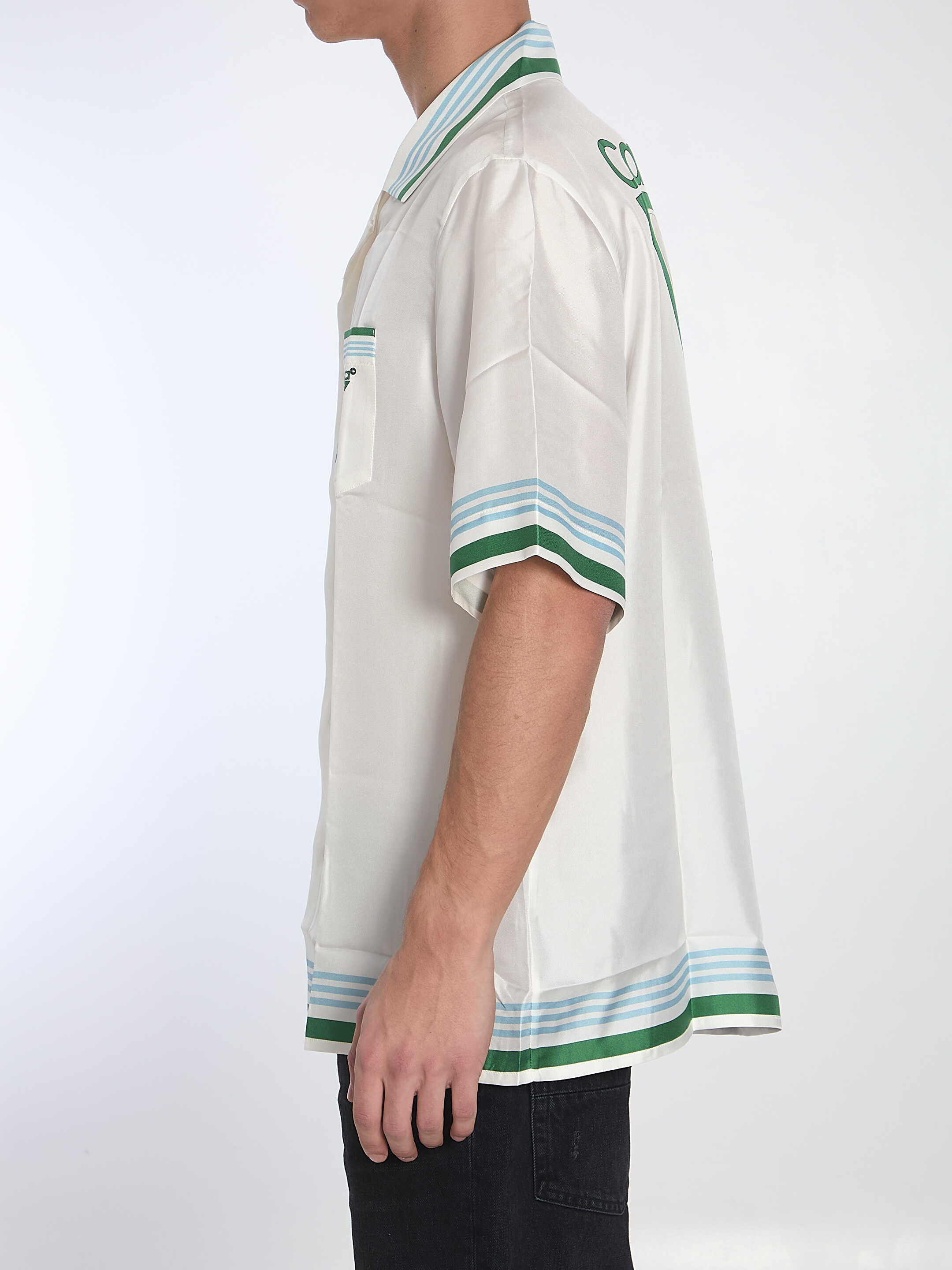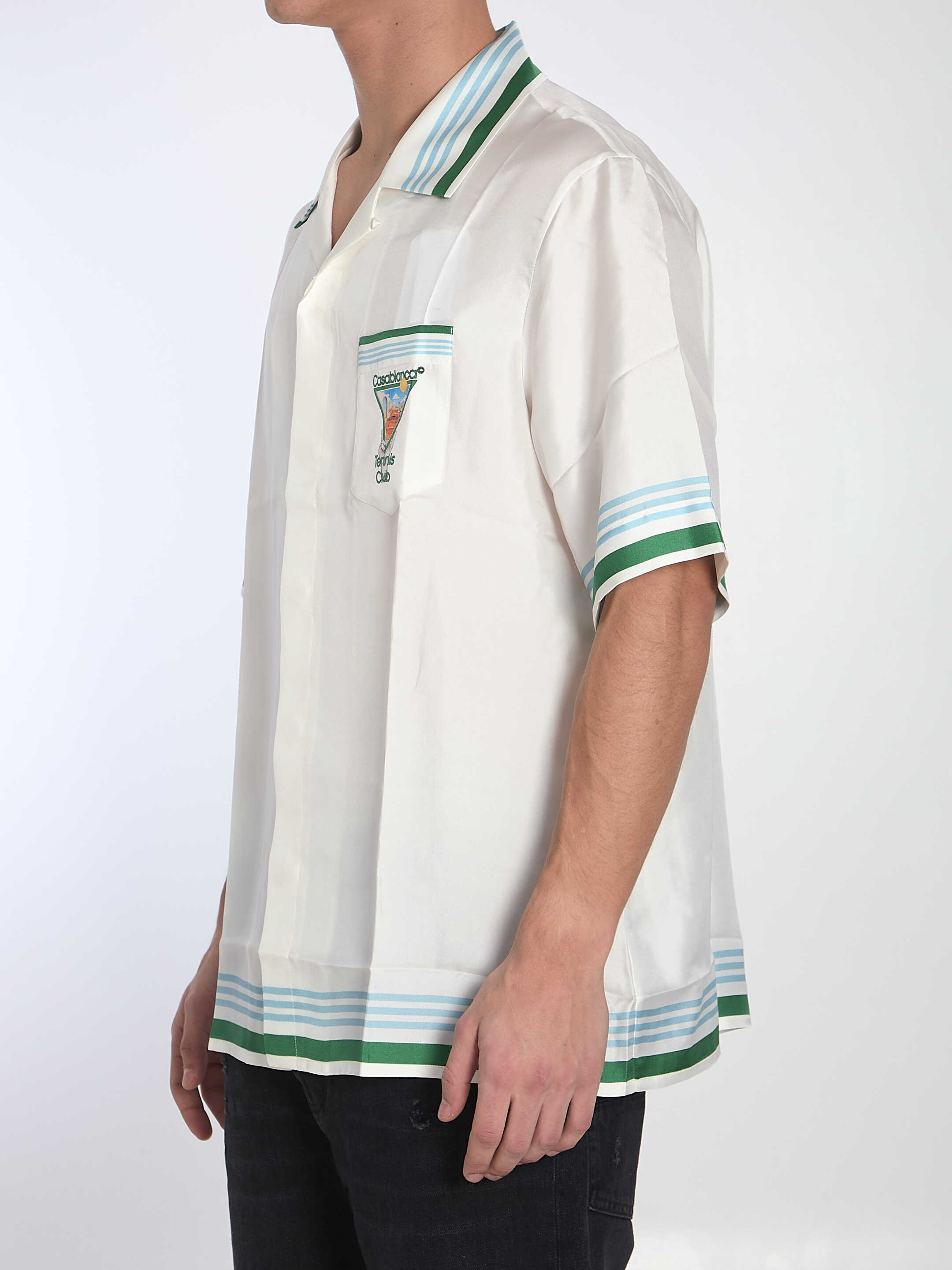Metaphysical Tennis Icon short-sleeve shirt in white silk twill with blue, green, and white striped details on the edges. It features a pointed collar, button closure with hidden CC logo buttons, a chest pocket with the Metaphysical Tennis Icon logo and striped detail, and a large Metaphysical Tennis Icon logo on the back. Regular fit.