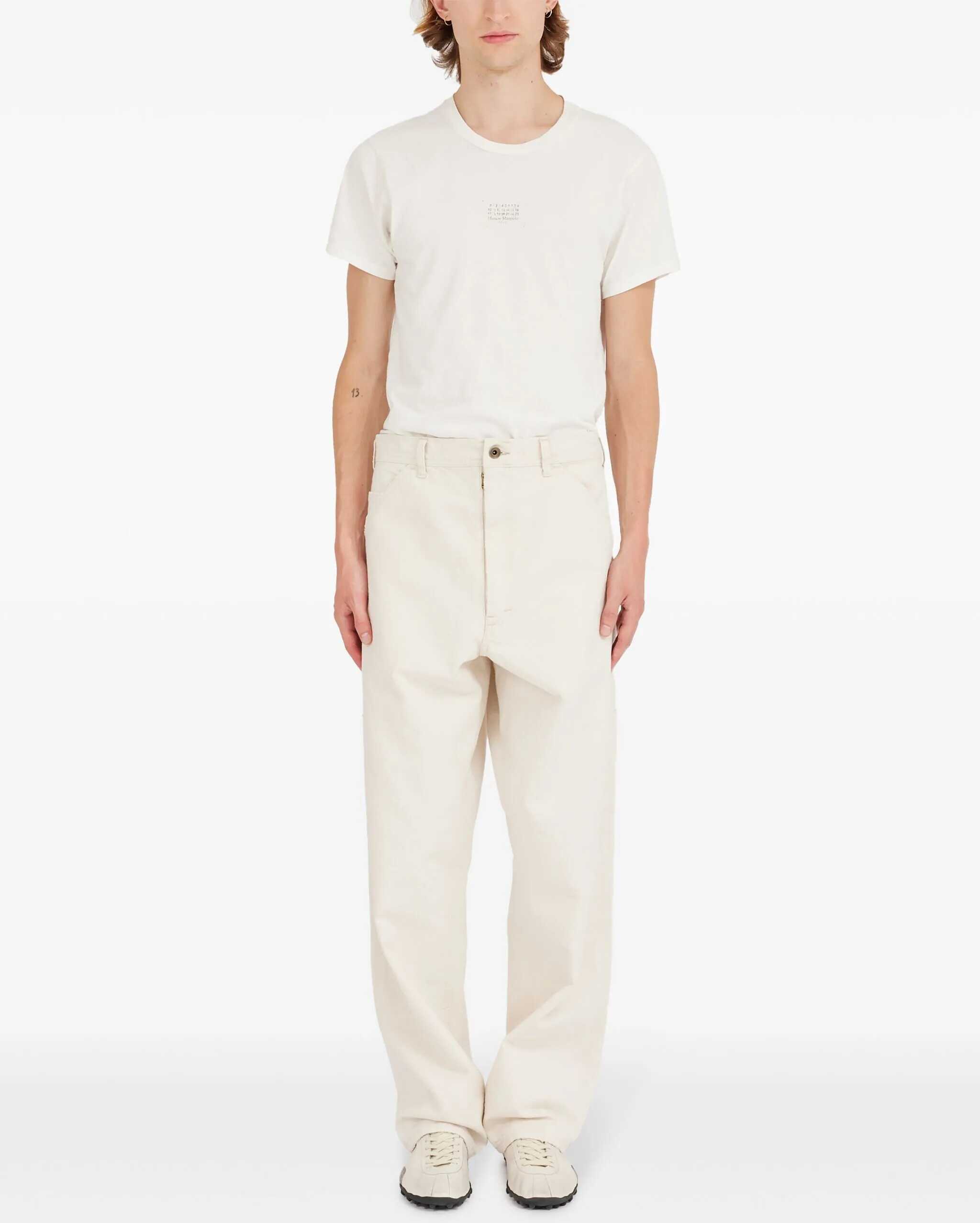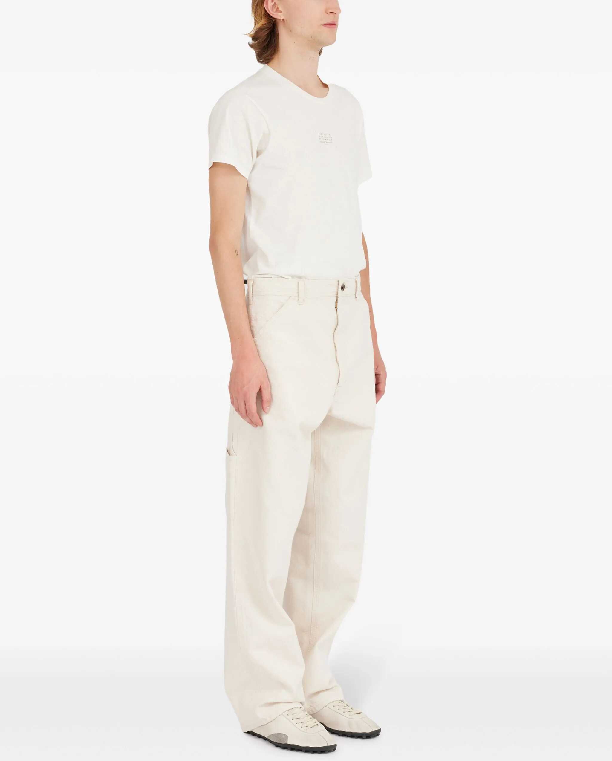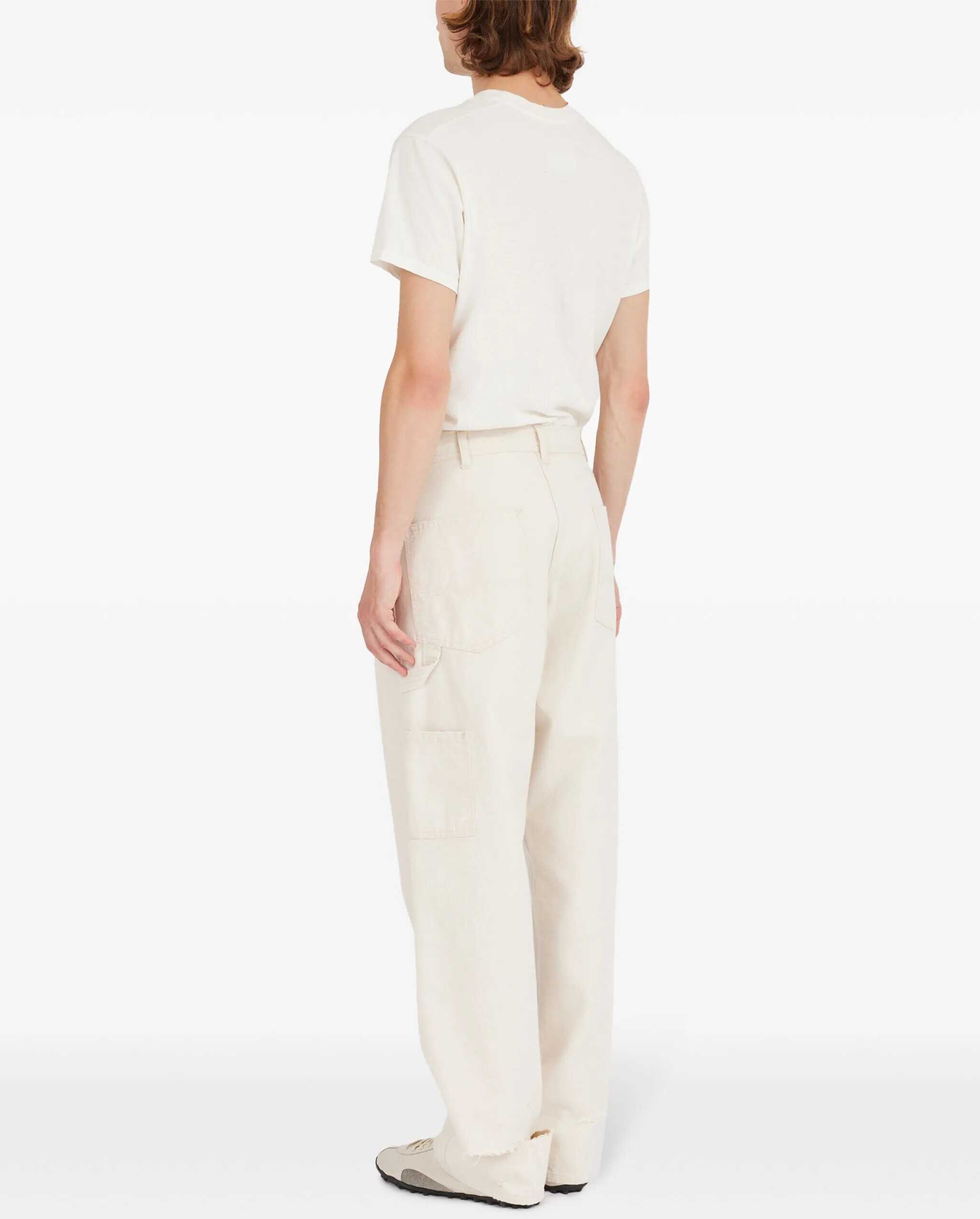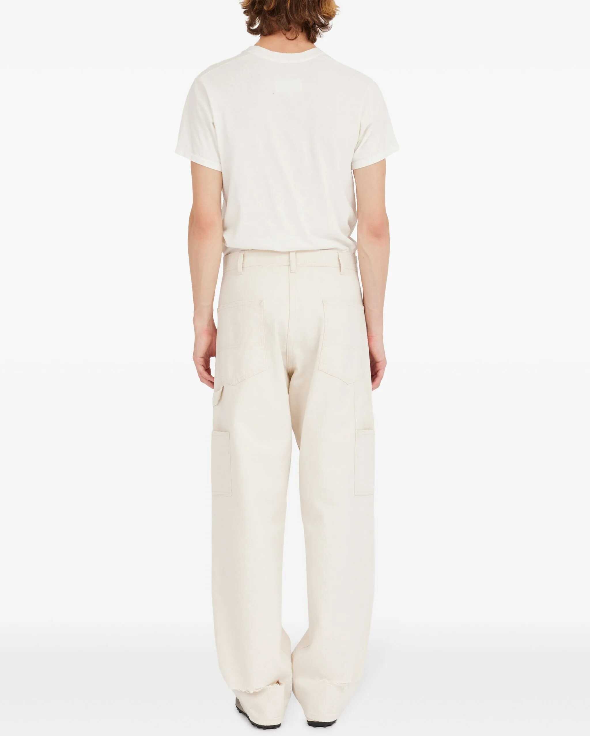 Cream-colored cotton jeans. They feature a hook, button, and zip closure, five pockets, belt loops, two cargo pockets on the legs, a strap connecting the upper left pocket to the pocket on the same leg, signature Four Stitches detailing on the back, and distressed hems.