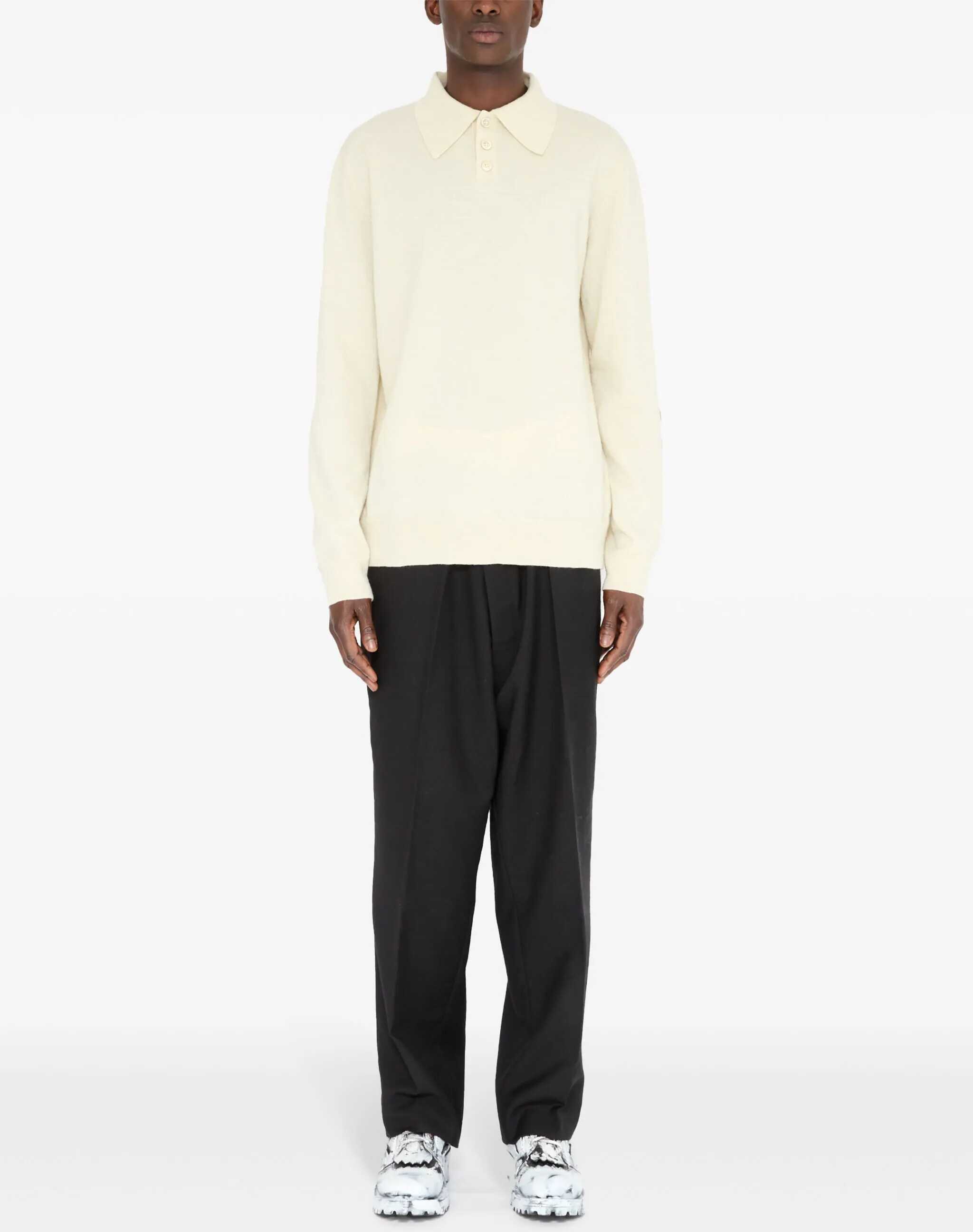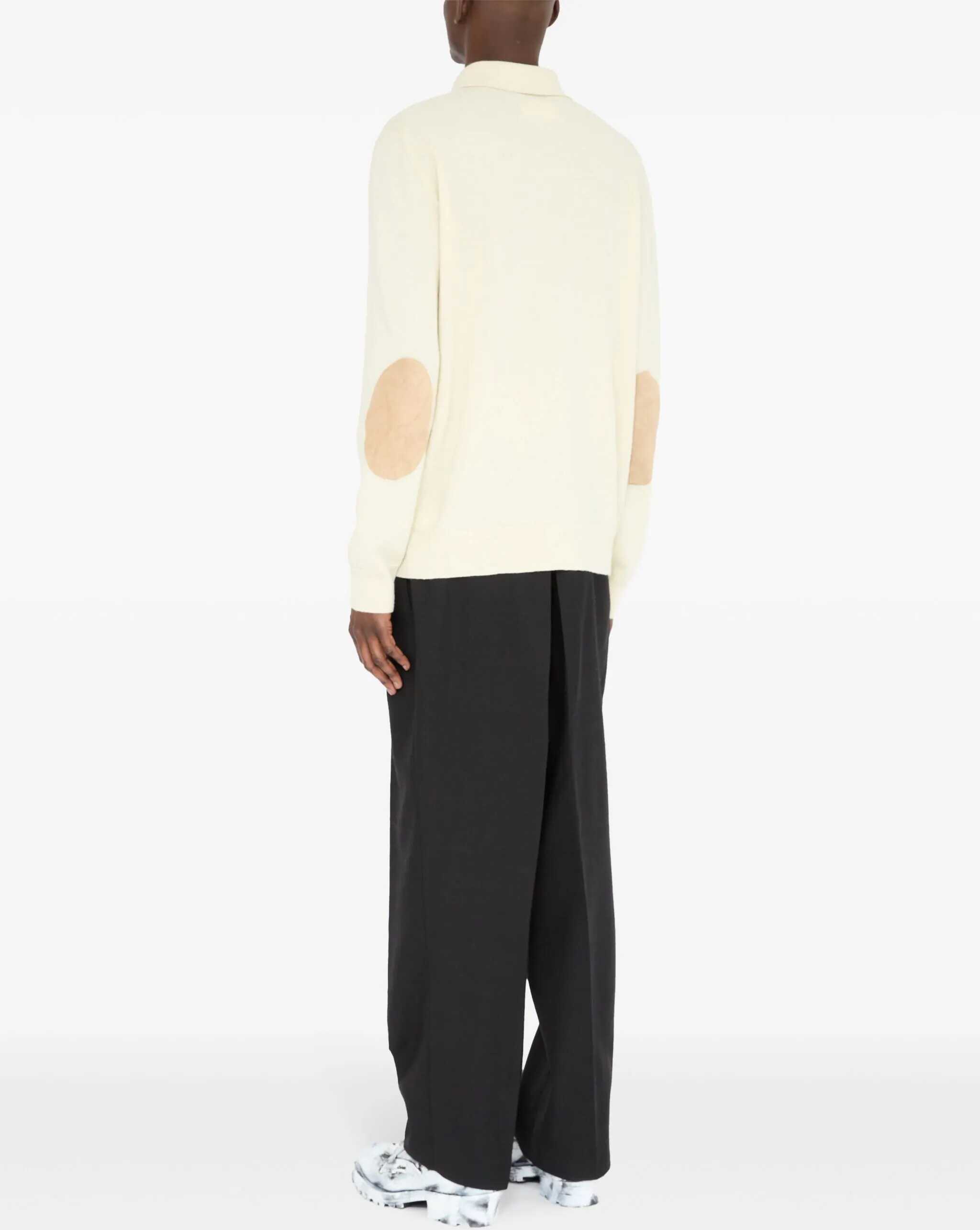 Long-sleeve polo shirt in cream-colored wool. It features a classic collar, a three-button placket, beige suede elbow patches, signature Four Stitches detailing on the back, and ribbed collar, cuffs, and hem.