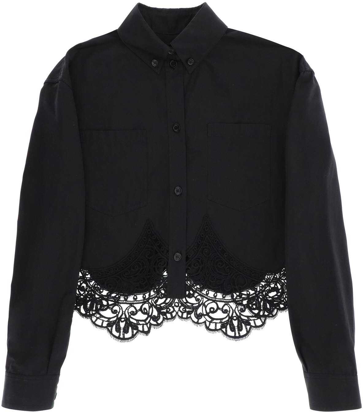 Burberry cropped shirt crafted in pure cotton poplin embellished with macrame lace insert on the hem. Button-down collar design featuring front button placket, patch pockets at chest and back yoke with inverted pleat. Relaxed fit with boxy cut. The model is 177 cm tall and wears size UK 6.