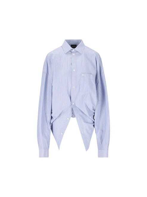 cerulean blue/white cotton poplin texture vertical stripe pattern front button fastening classic collar drop shoulder long sleeves buttoned cuffs embroidered logo at the chest chest patch pocket knot detailing high-low hem