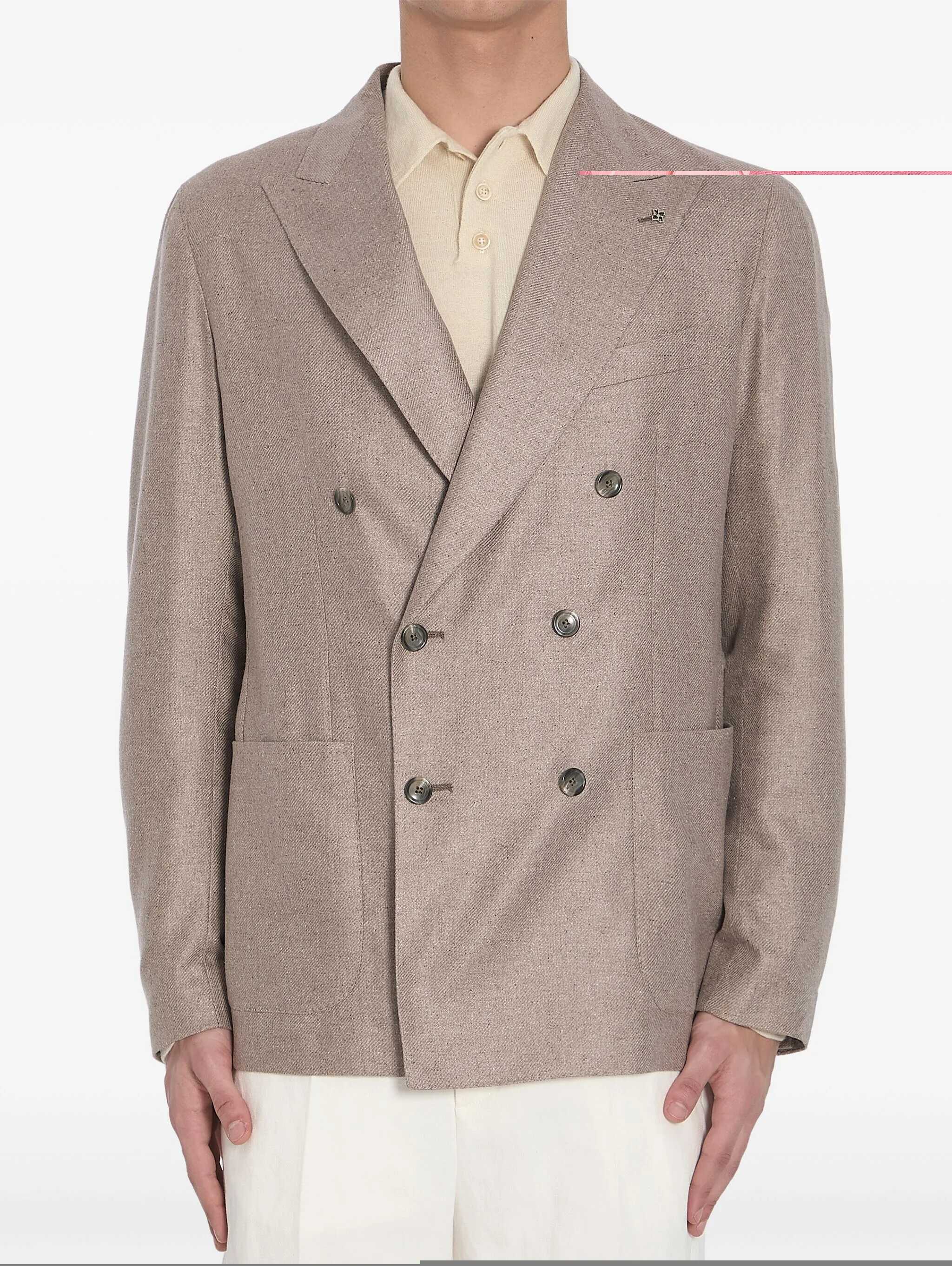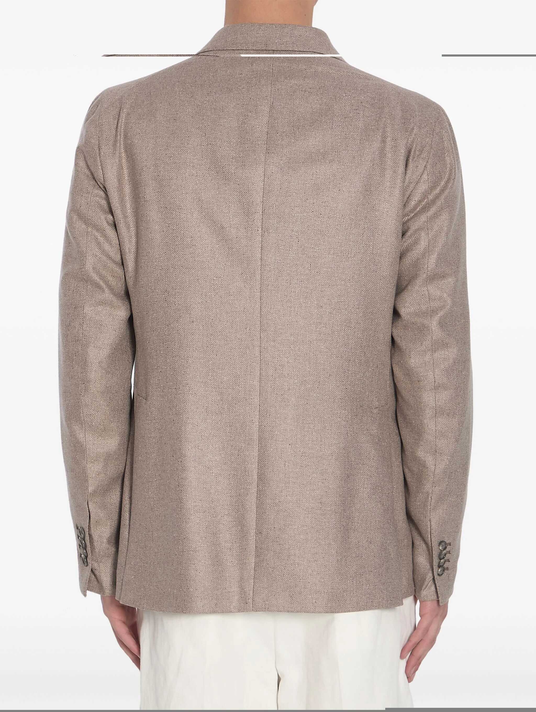 Double-breasted taupe silk jacket. It features a double-breasted closure, pointed lapels with a pin on the collar, two front patch pockets, a welt pocket on the chest, button cuffs, two welt internal pockets, and one welt internal pocket with a flap and button.
