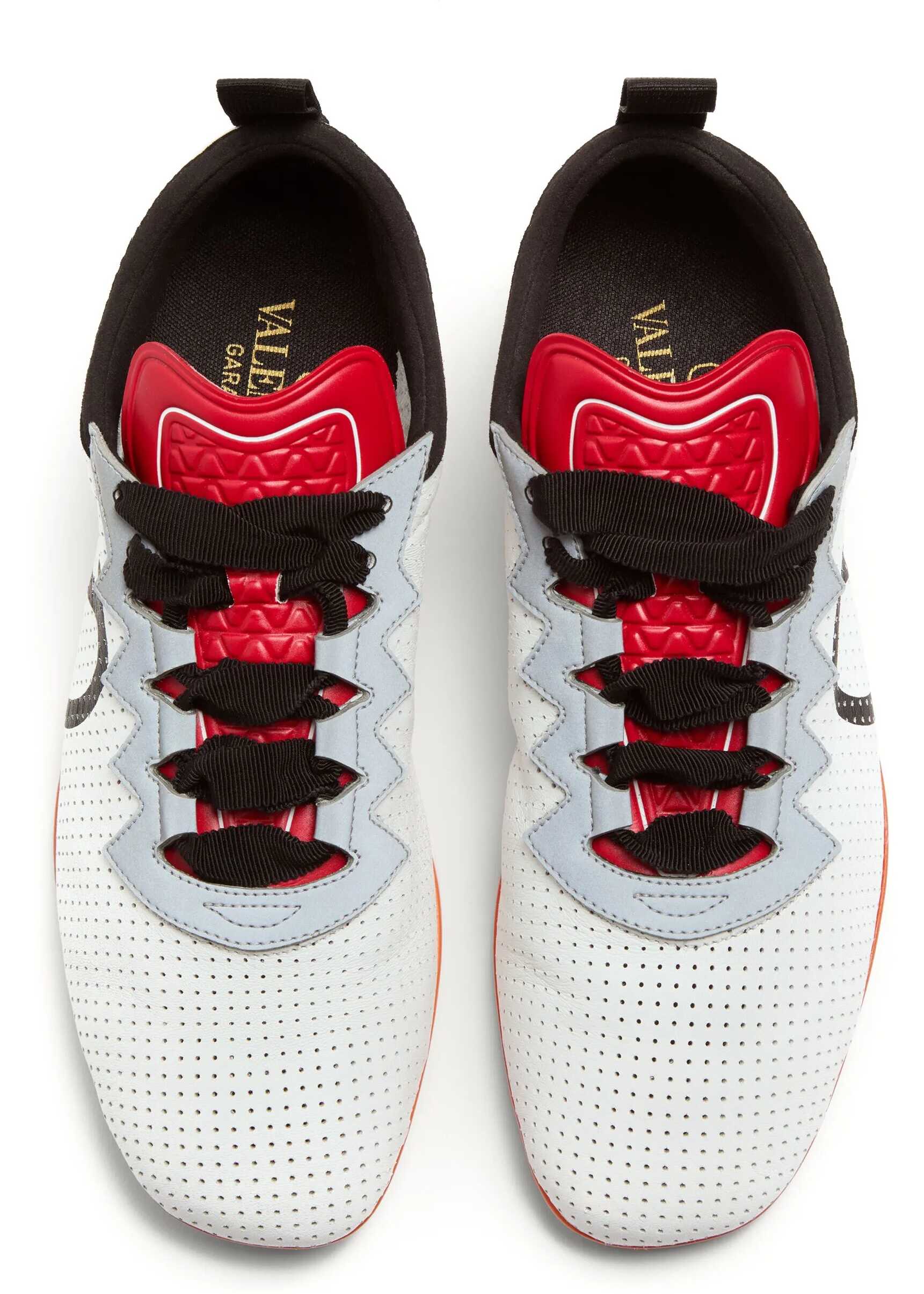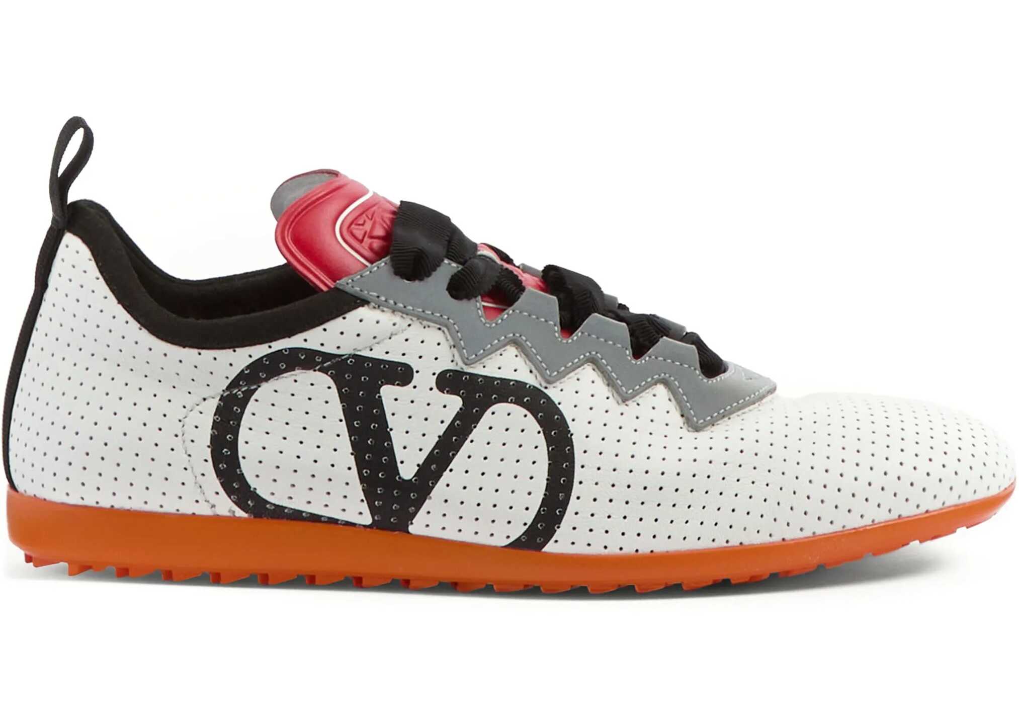 Chromathon sneakers in white perforated nappa with grey detailing. They feature a fabric lace-up strap for ankle fastening, a black VLogo Signature print on one side, a textured red tongue, a black fabric detail on the heel, and a custom orange rubber sole. Dust bag included. Additional laces included. Any imperfections in the leather should not be considered manufacturing defects but rather a characteristic of the material.