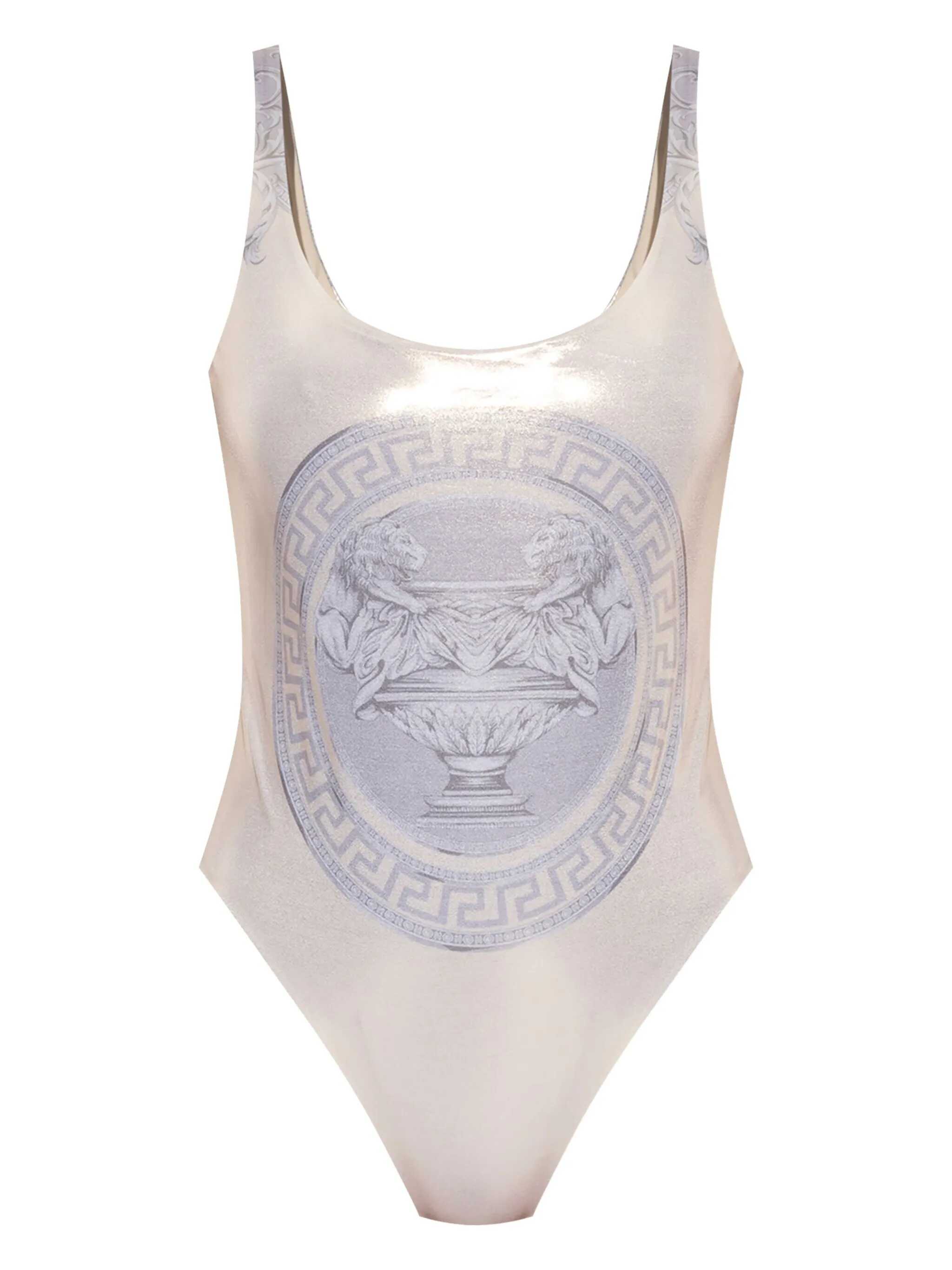 'La Coupe des Dieux' one-piece swimsuit in shiny iridescent fabric with neckline at the back