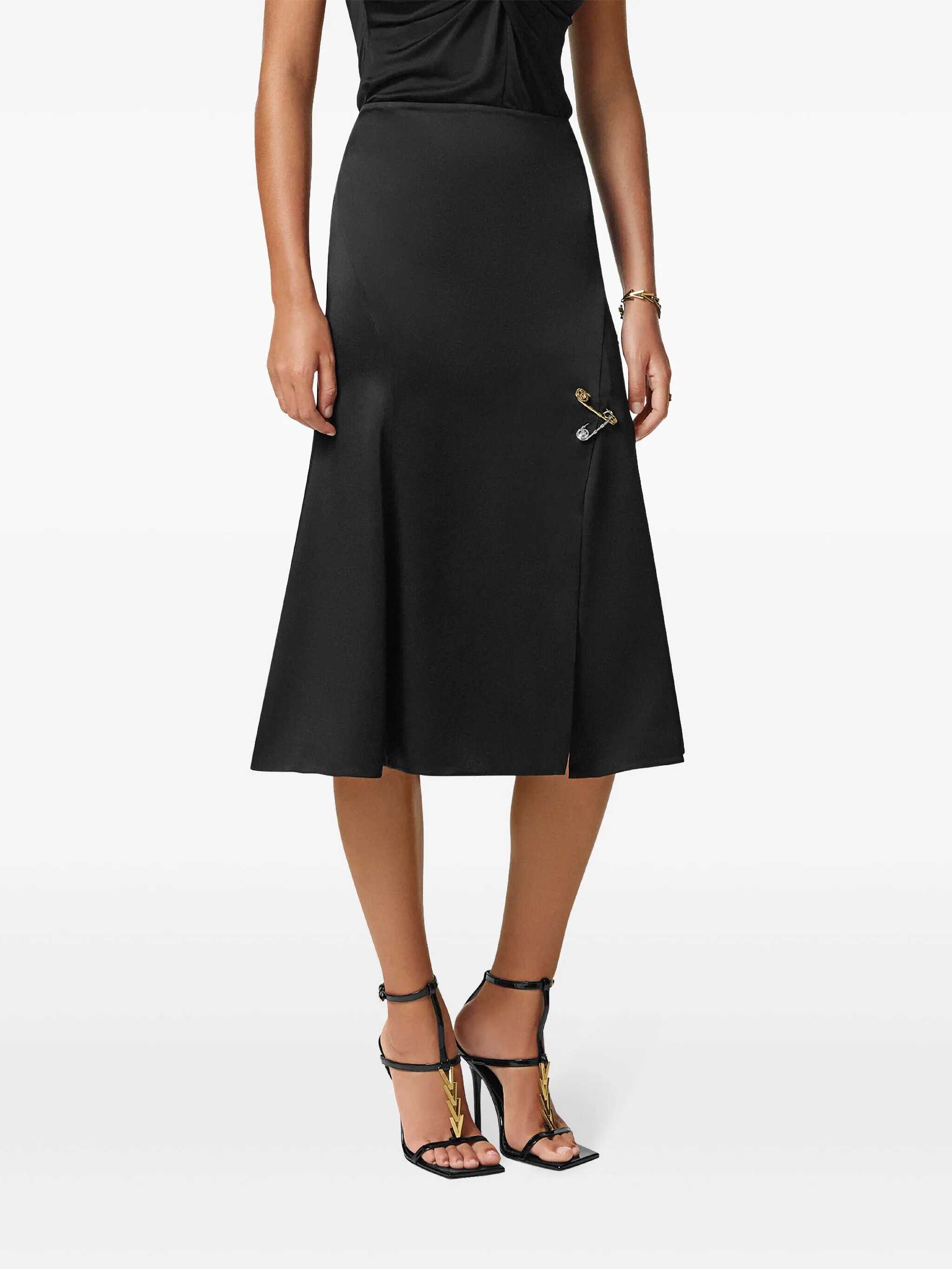 Black concealed rear zip fastening high-waisted signature Medusa Safety Pin detail pleat detailing side slits A-line straight hem mid-length signed by Versace