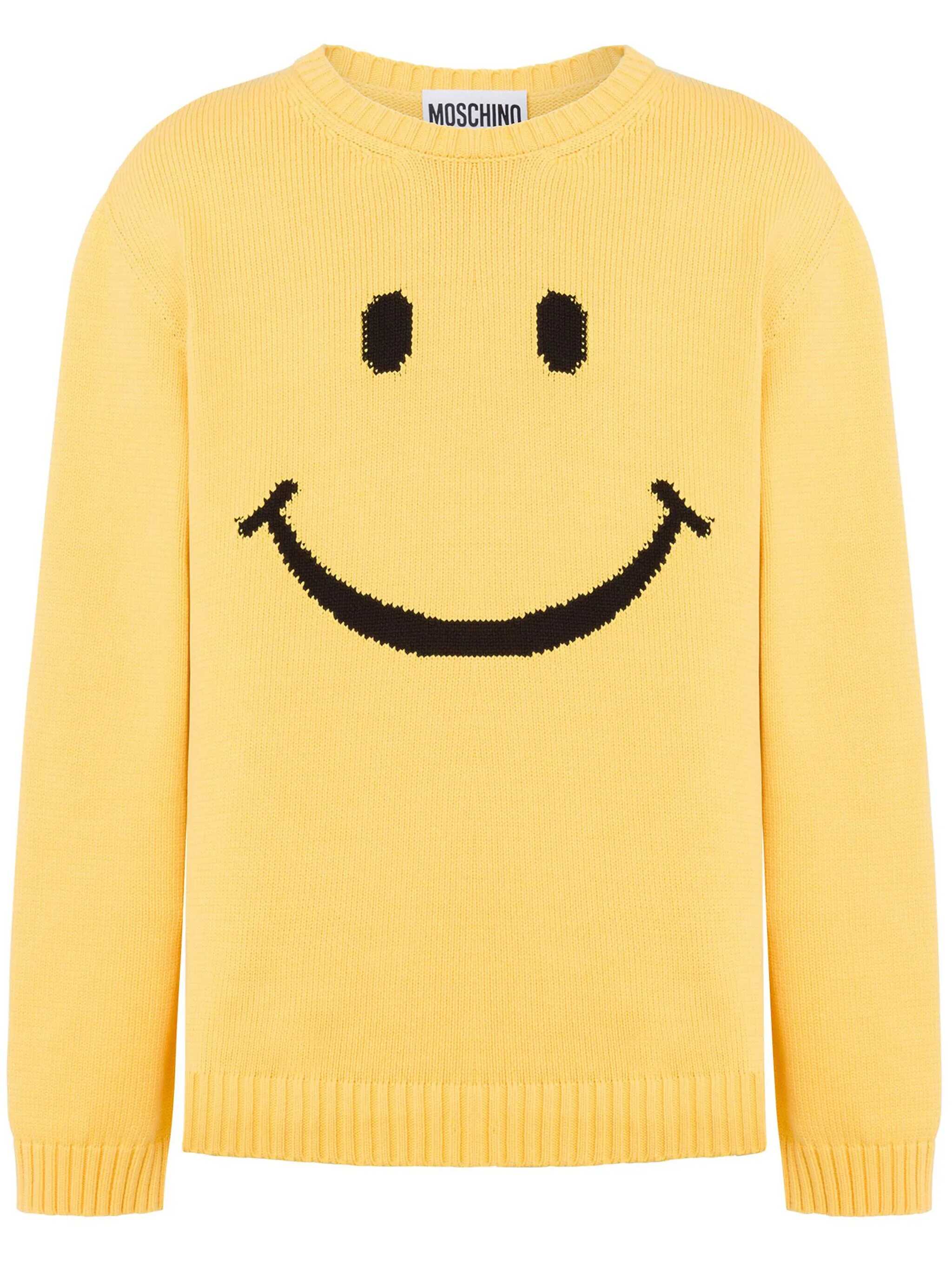 Yellow cotton knitwear from Moschino featuring round collar, long sleeves, ribbed cuffs and hem and frontal detail.