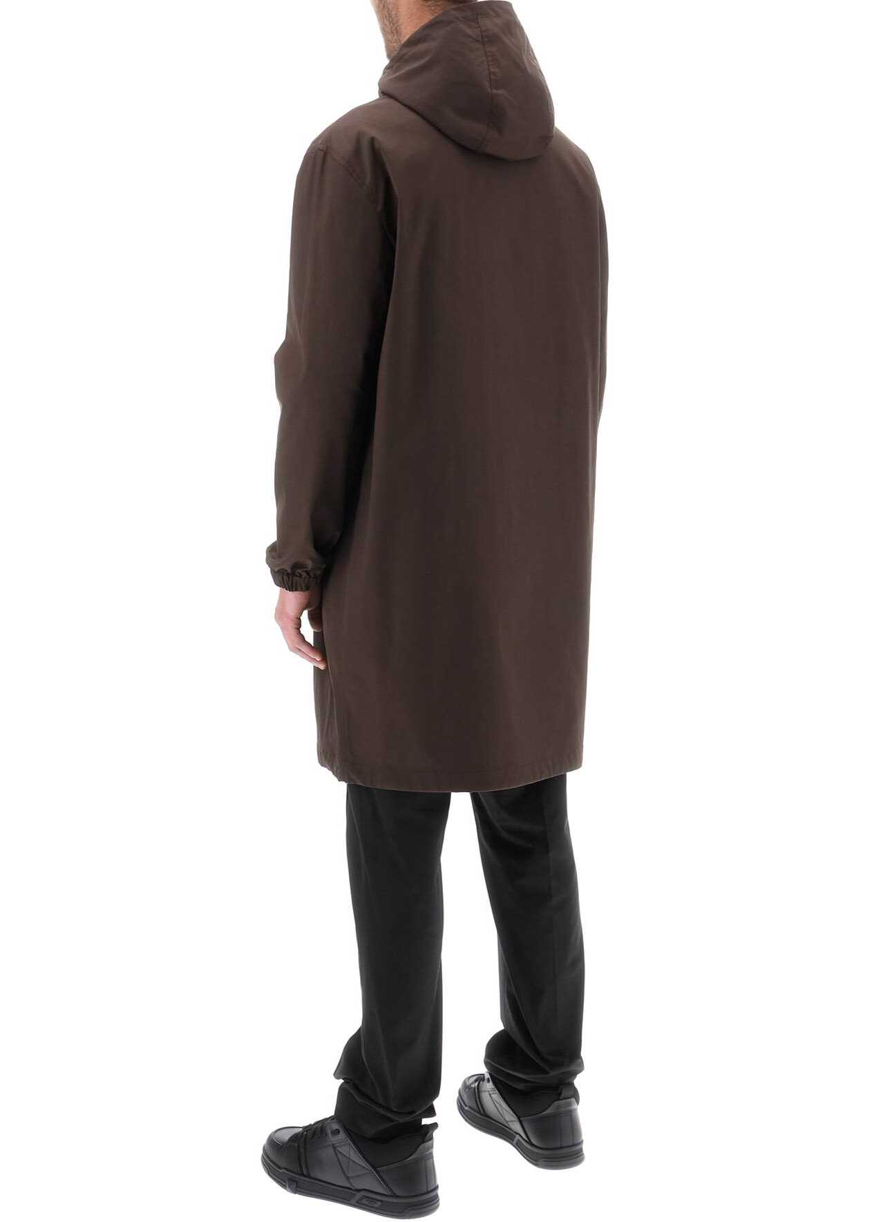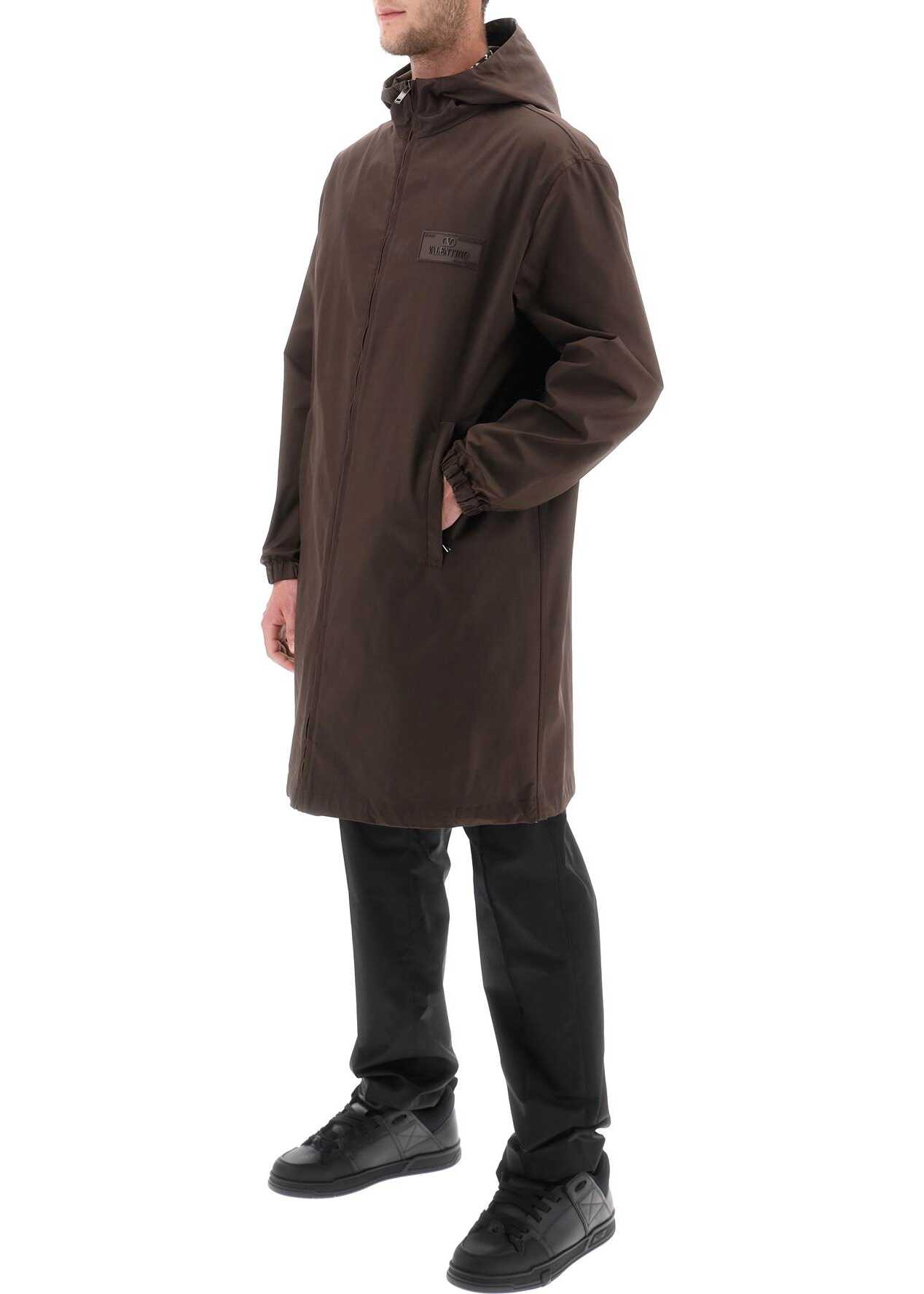 Valentino long raincoat crafted in technical fabric and characterized by Maison Valentino rubber label at chest. It features adjustable hood with inner drawstring, front zipper fastening, side welt pockets with zipper and elasticated cuffs. Unlined interior. Relaxed fit. The model is 187 cm tall and wears size IT 48.